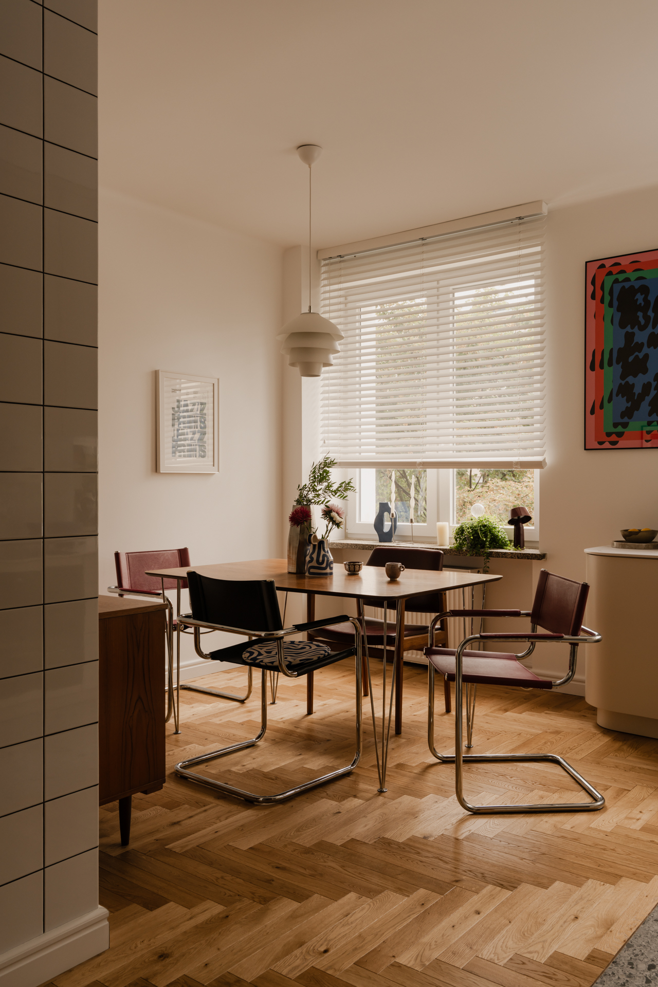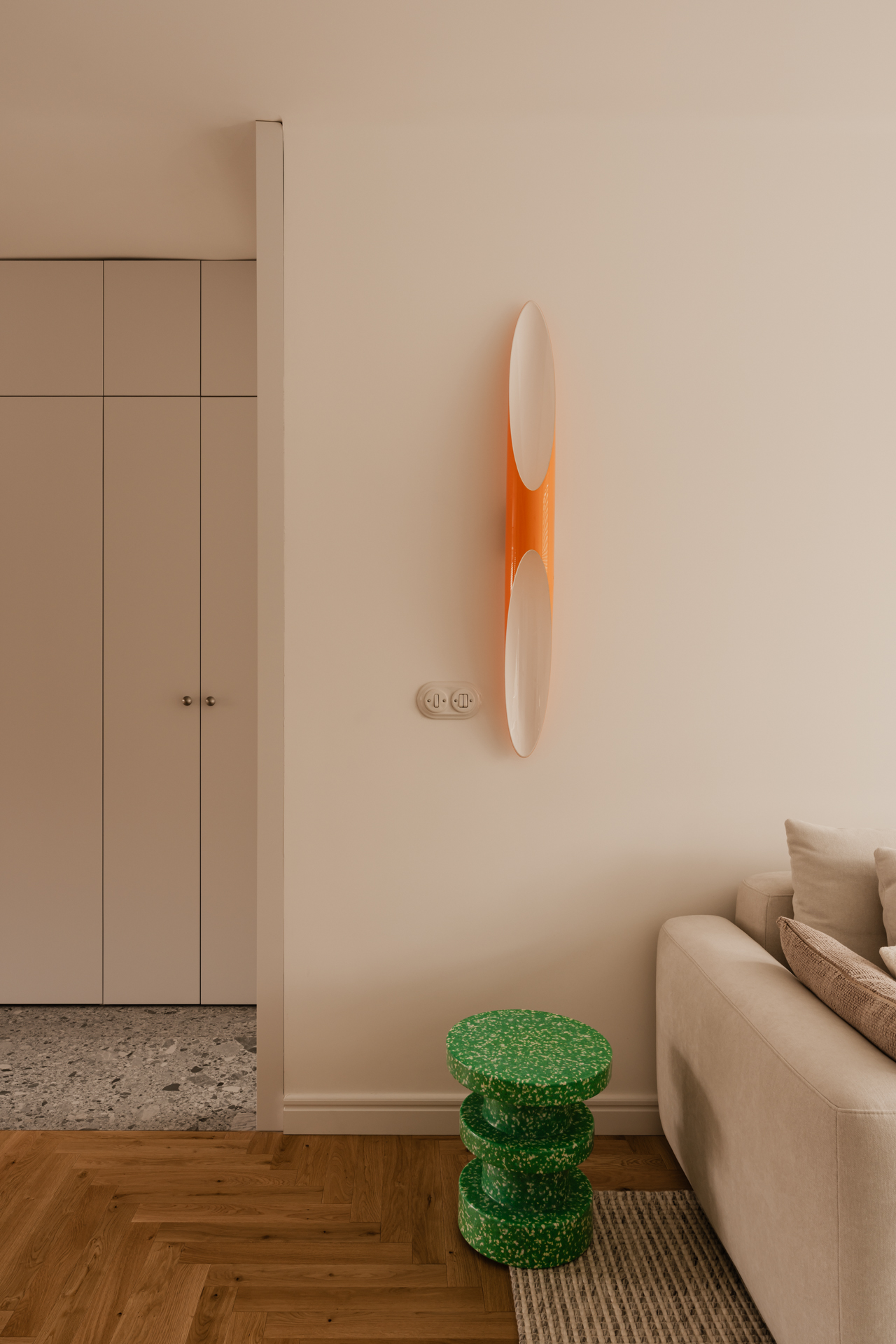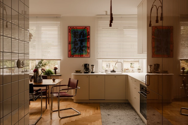 Choć styl mieszkania zdradza wrażliwość na design i piękno, jest ono przede wszystkim przestrzenią do życia – ciepłą, miękką, pełną światła, zróżnicowanych faktur i dźwięków muzyki płynącej z gramofonu. Retro detale, takie jak ceramiczne włączniki, harmonijnie współgrają z nowoczesnymi akcentami.