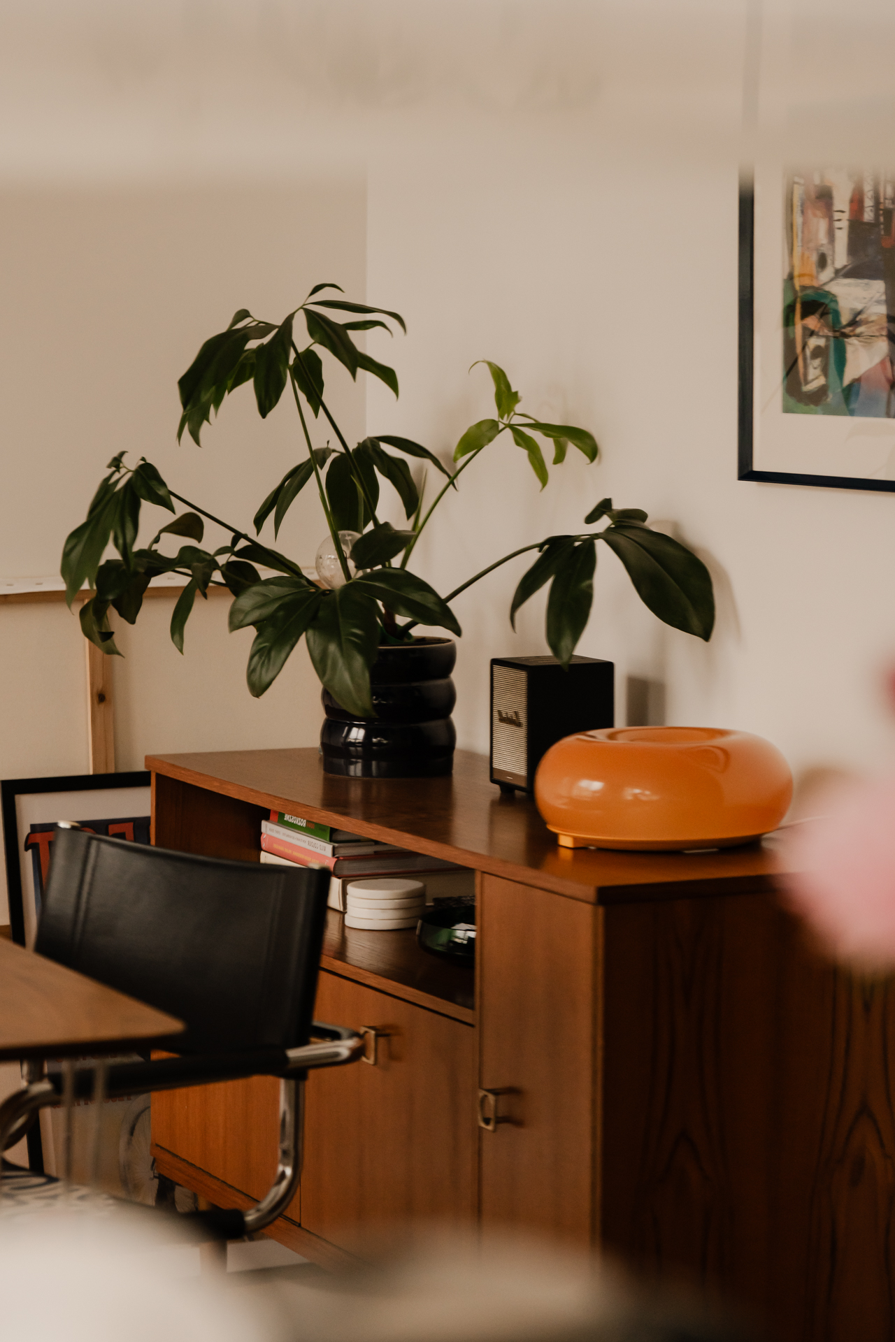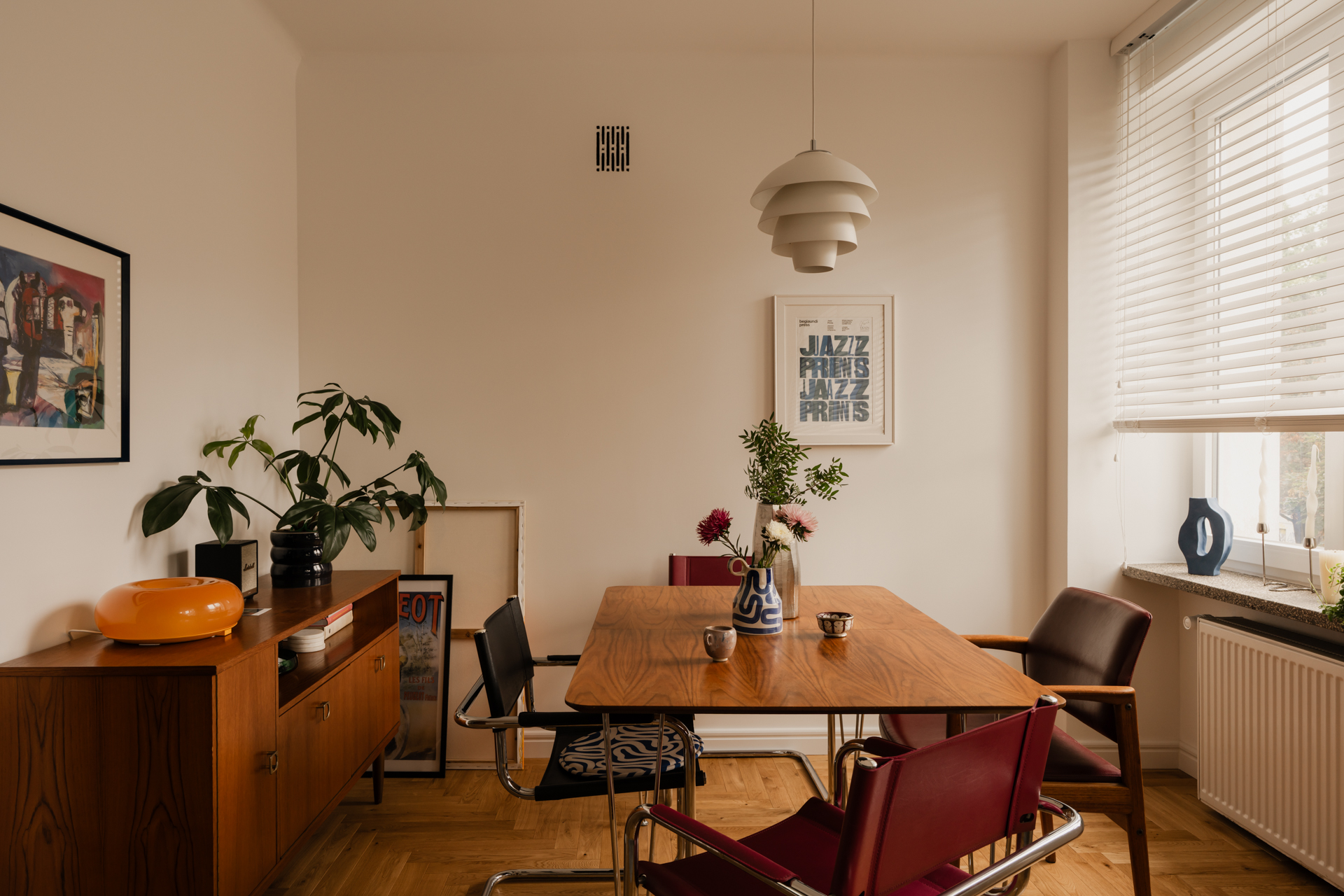 Styl wnętrza jest odbiciem tego, co właściciele cenią najbardziej – modernistycznego vintage’u, unikatowych dodatków i naturalnych materiałów. Wśród mebli znalazły się prawdziwe perełki: duński fotel Georga Thamsa z lat 60., włoskie lampy z lat 90. (w tym model Shakti projektu Clericiego), szwedzki stół z lat 70. oraz szwajcarska komoda USM, klasyk współczesnego wzornictwa.