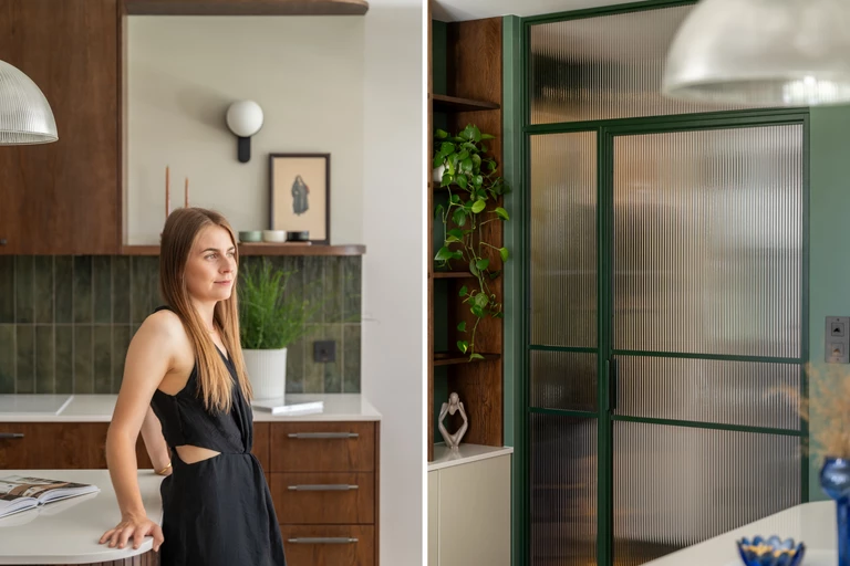 Architektka postawiła na ciemne drewno, szczotkowaną stal i czarne dodatki, którymi zbudowała bazę mieszkania. Spoiwem całości jest kolor zielony, który w różnych odcieniach przewija się niemal przez wszystkie pomieszczenia. Nawiązuje on do widoku za oknem – rozległej łąki. Klimat wnętrza ocieplają nuty rudości i czerwieni.
