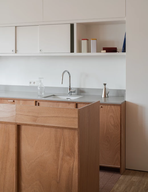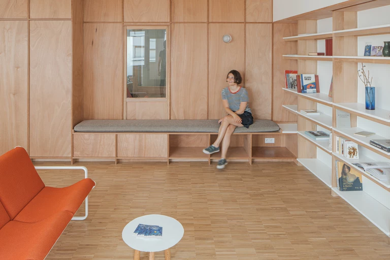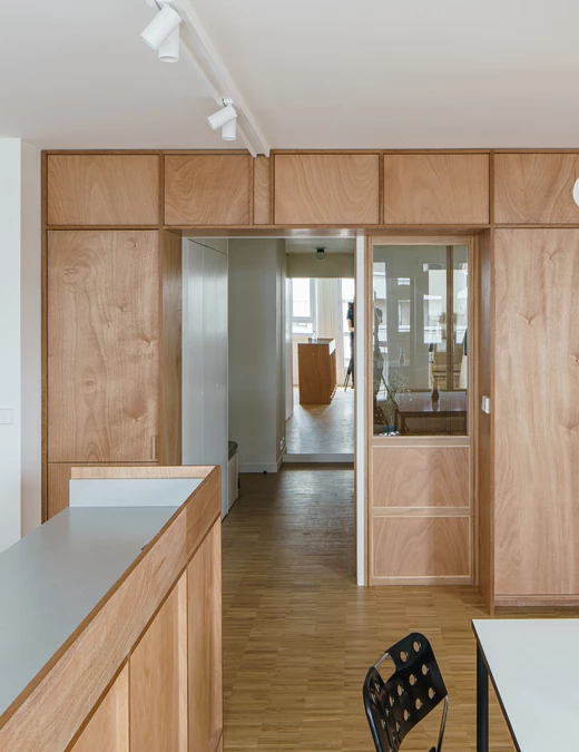 Jedna ze ścian w strefie dziennej, przyległa do części biurowej, kryje w sobie pojemne szafy. Tuż pod "biurowym" oknem zaaranżowano ławkę z regałem i schowkami. Fornirowane drewnem okume płyty ścienne powtarzają rytm podziałów, który pojawił się już w „obudowie” domowego biura.