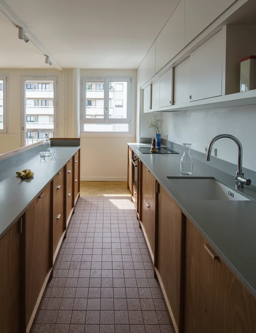 Francuska pracownia Atelier Boteko w swoich realizacjach lubi posługiwać się prostym i czytelnym językiem wizualnym. Nie inaczej jest we wnętrzu tego paryskiego mieszkania, do którego architekci wpletli subtelne nawiązania do lat 70. XX wieku.