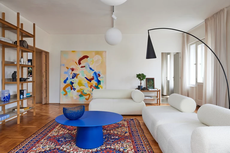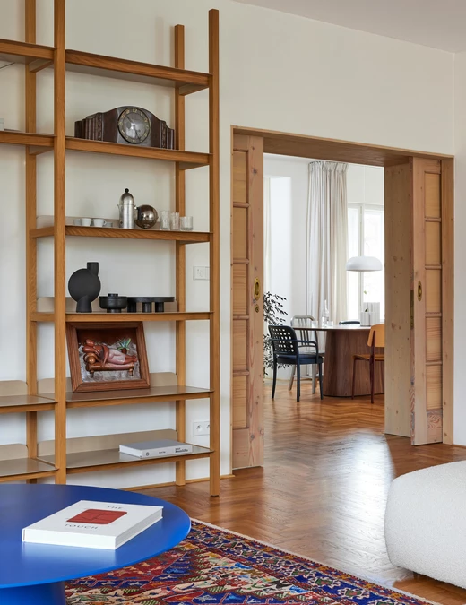 Aby osiągnąć przestrzenną lekkość, zastane pomieszczenia o niewielkiej powierzchni połączono w duże, otwarte przestrzenie. Otworzono szczególnie te strefy, w których rodzina spędza większość czasu, w tym kuchnię i salon. O przeszłości mieszkania przypominają zachowane oryginalne detale: klamki, parkiet, drzwi przesuwne i obraz w głównej sypialni. Wnętrze ożywiają intensywne, nasycone kolory oraz meble o oryginalnych formach.