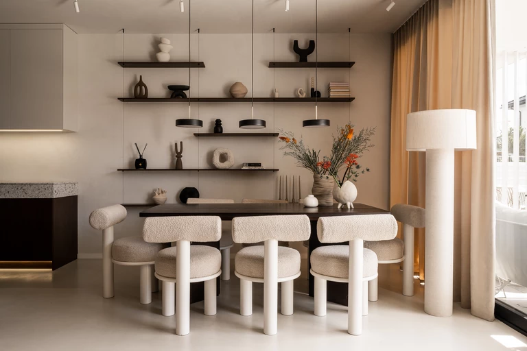 Dom ma dwie kondygnacje, które zaaranżowano w sposób tradycyjny – na parterze znajduje się strefa dzienna z salonem, otwartą na niego kuchnią, strefą wejściową oraz łazienką. Na piętrze zlokalizowano zaś część prywatną domowników. W części zaaranżowanej na jadalnię przy długim, ciemnym stole dla kontrastu pojawiły się jasne krzesła o modnych, walcowatych oparciach i tapicerce z tkaniny bouclé.