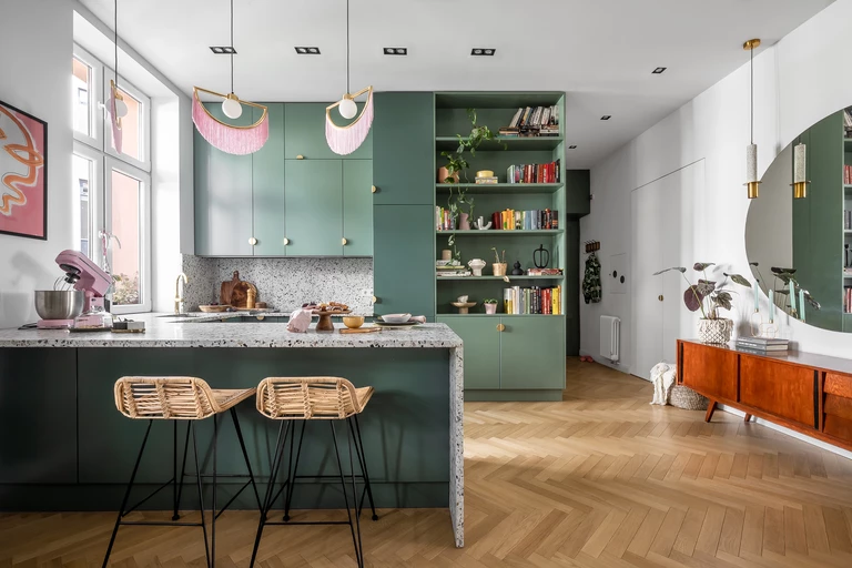 Centrum mieszkania jest kuchnia połączona z salonem i holem wejściowym. Od strefy wypoczynkowej oddziela ją wyspa zwieńczona blatem z lastryko. Ten wzór to kolejny ukłon w stronę historii budynku i materiałów zastosowanych do wykończenia klatki schodowej w kamienicy. Nad wyspą zawisły lampy, których ozdobą są różowe frędzle i pozłacana oprawka. Zielona, prosta zabudowa zyskała elegancki detal - mosiężne, wykonane na zamówienie, uchwyty.