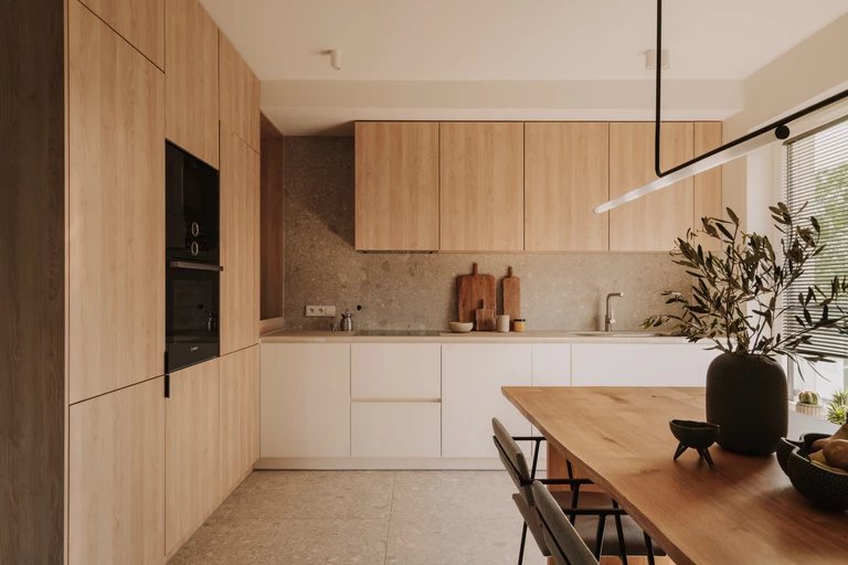 Mieszkanie w poznańskiej dzielnicy Wilda zostało zaprojektowane w eleganckim, minimalistycznym - jednocześnie przyjaznym - stylu przywodzącym na myśl estetykę japandi. Uwagę przykuwają w nim naturalne materiały, w szczególności drewno, które dominuje w przestrzeni. Wnętrze jest efektem pracy studia architektonicznego maii.