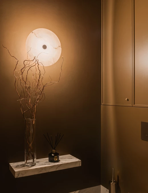 W recepcji bordowe płytki nad zabudową kuchenną zgrano z kolorem imponujących rozmiarów szklanej lampy „Bohemia” od Marset. Uwagę zwraca też podwieszany regał na kosmetyki zintegrowany z oświetleniem led. Świetlną kompozycję dopełniają klasyki dizajnu – dwie lampy „Flower pot” marki &tradition.
