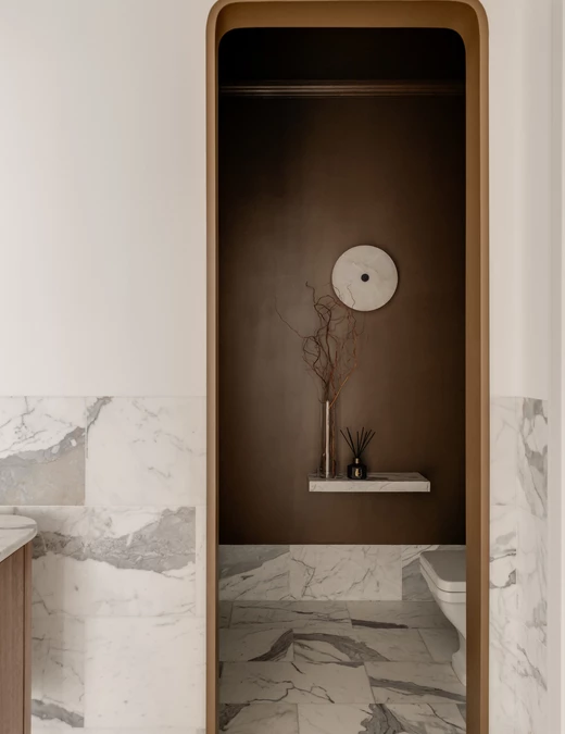 Klasyczna elegancja zawitała też do łazienki. Podłogę oraz część ściany wykończono białym kamieniem o ekspresyjnym, szarym żyłkowaniu. Delikatny kinkiet z alabastru to model „Sual” od hiszpańskiej marki Aromas del Campo.