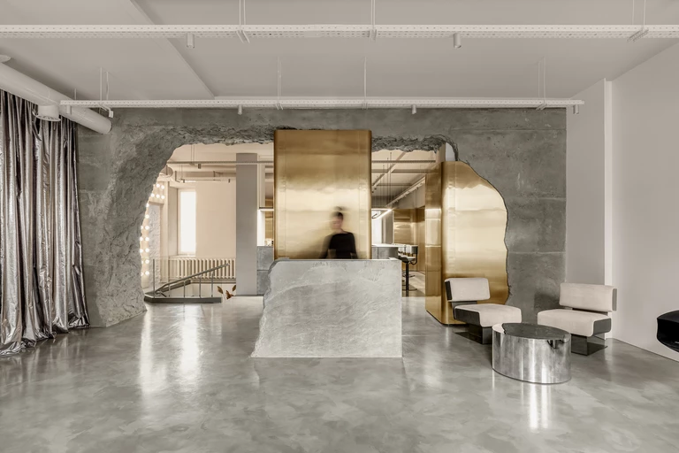 Z pewnością sercem całego salonu jest recepcja, w której znalazła się betonowa rzeźba ważąca ponad kilkaset kilogramów. Jej konstrukcja zajęła ponad cztery miesiące, a przerwany kształt nawiązuje do łamania stereotypów w branży beauty.