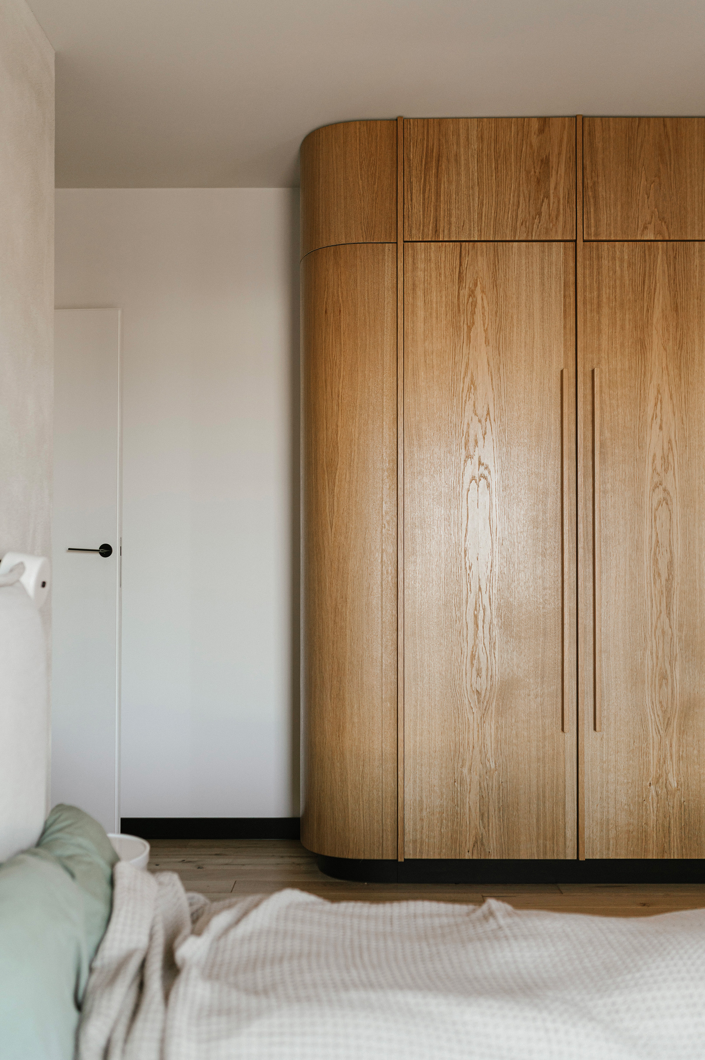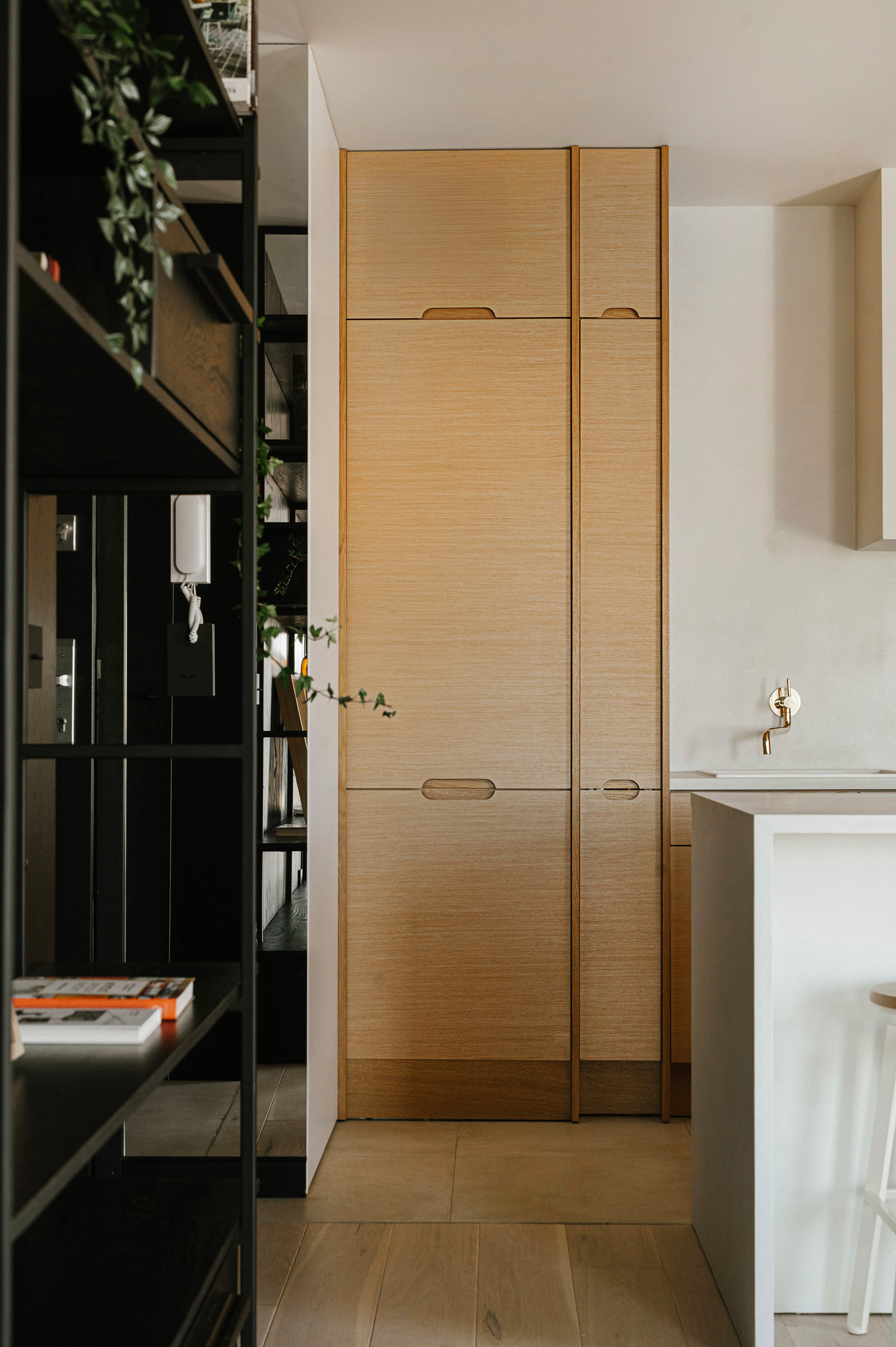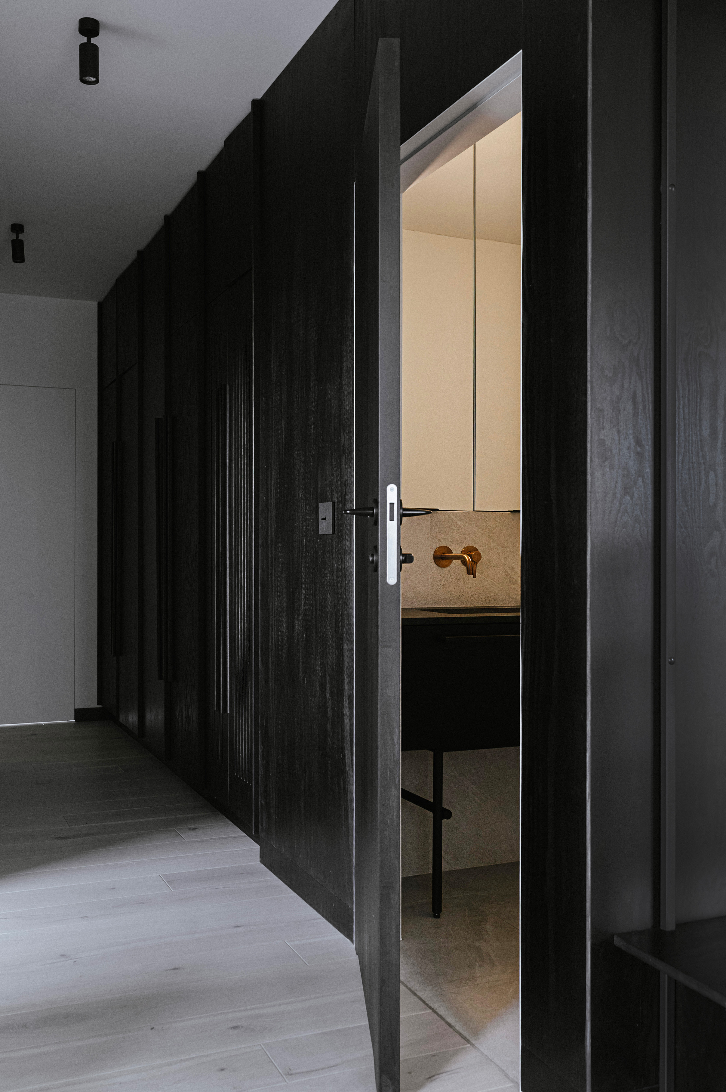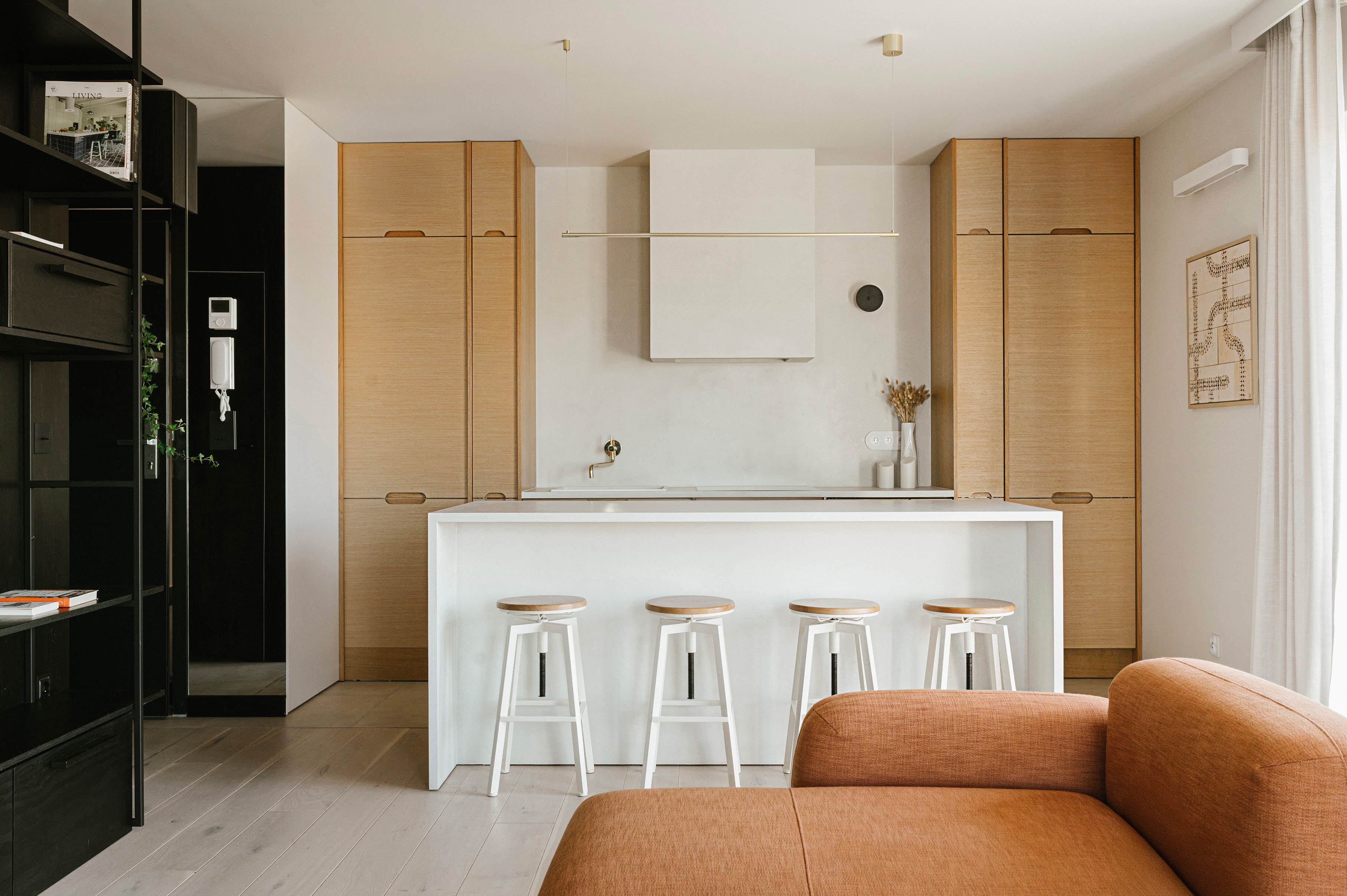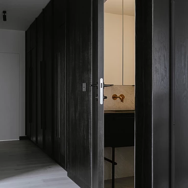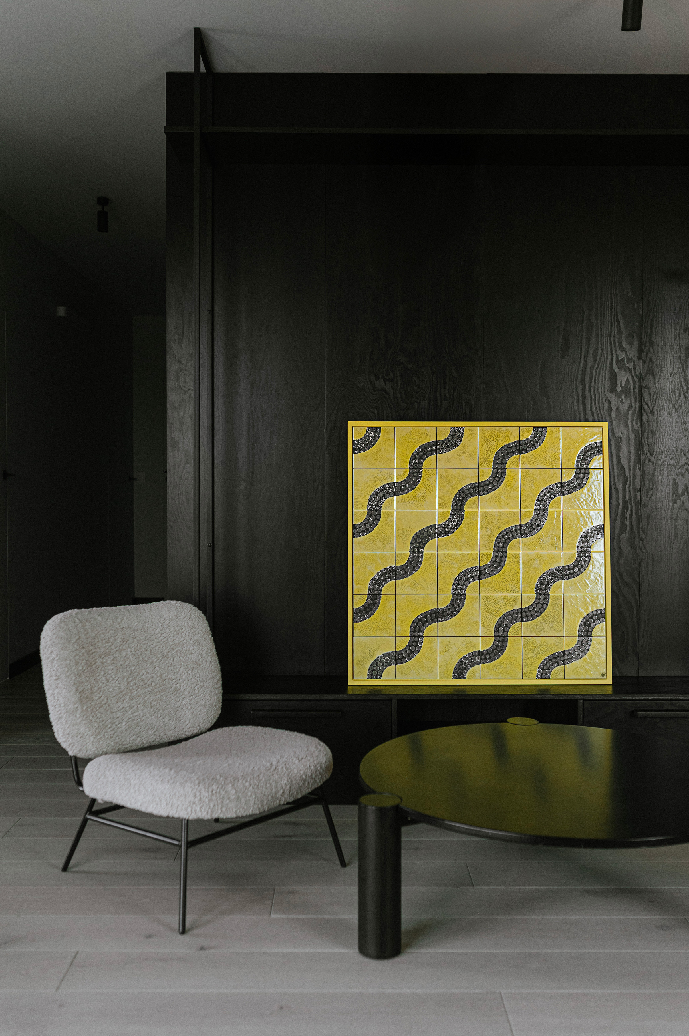 Wyrazistym elementem architektonicznym jest zabudowa wykonana z czarnej sklejki, która otacza moduł korytarzowo-łazienkowy i płynnie przechodzi w formę meblościanki w strefie dziennej. Zastosowanie ukrytych drzwi pozwoliło zachować minimalistyczną spójność, a ciemne tło stało się idealną ramą dla książek, roślin oraz kolejnych realizacji, takich jak „Żółta fala” czy ponownie „Biała Ścieżka”. Różnorodność formatów prezentowanych prac pozwala na budowanie wieloplanowej kompozycji, która nadaje wnętrzu rytm.