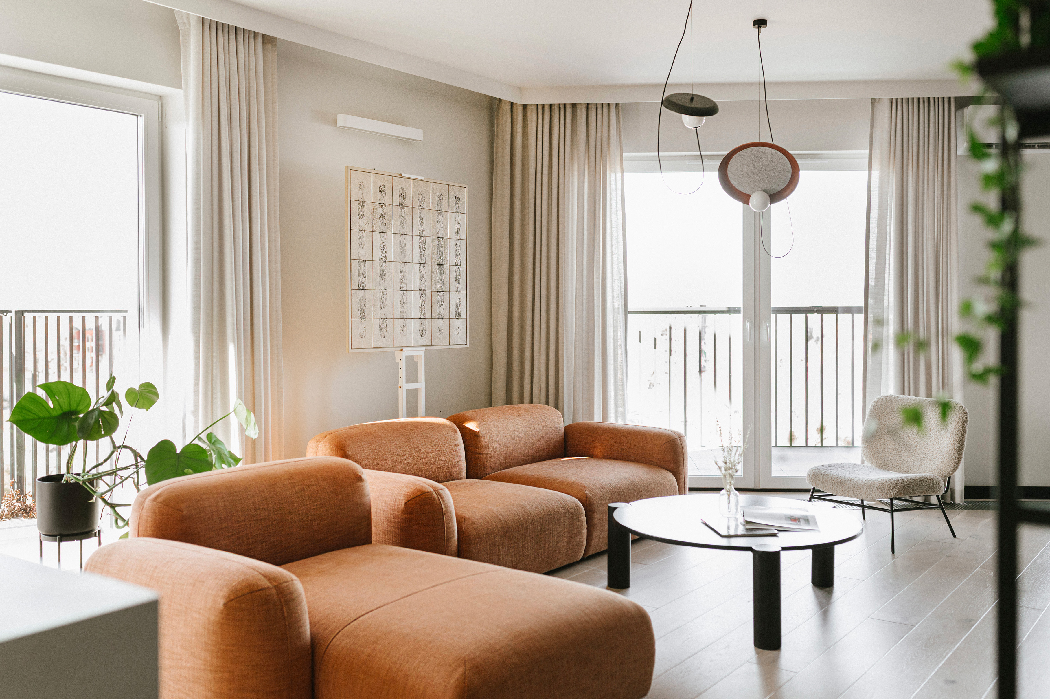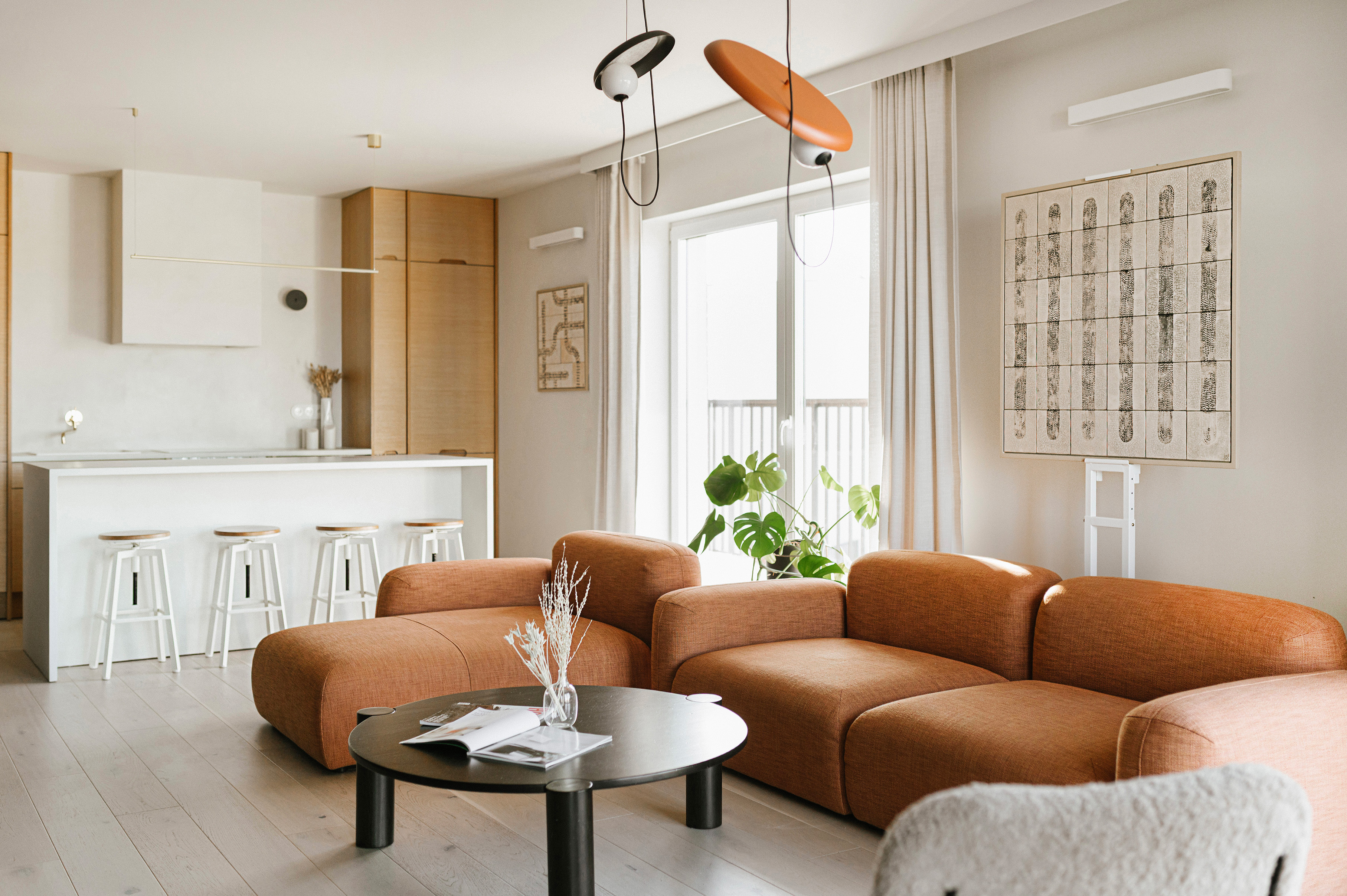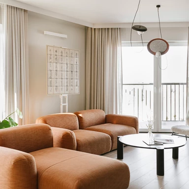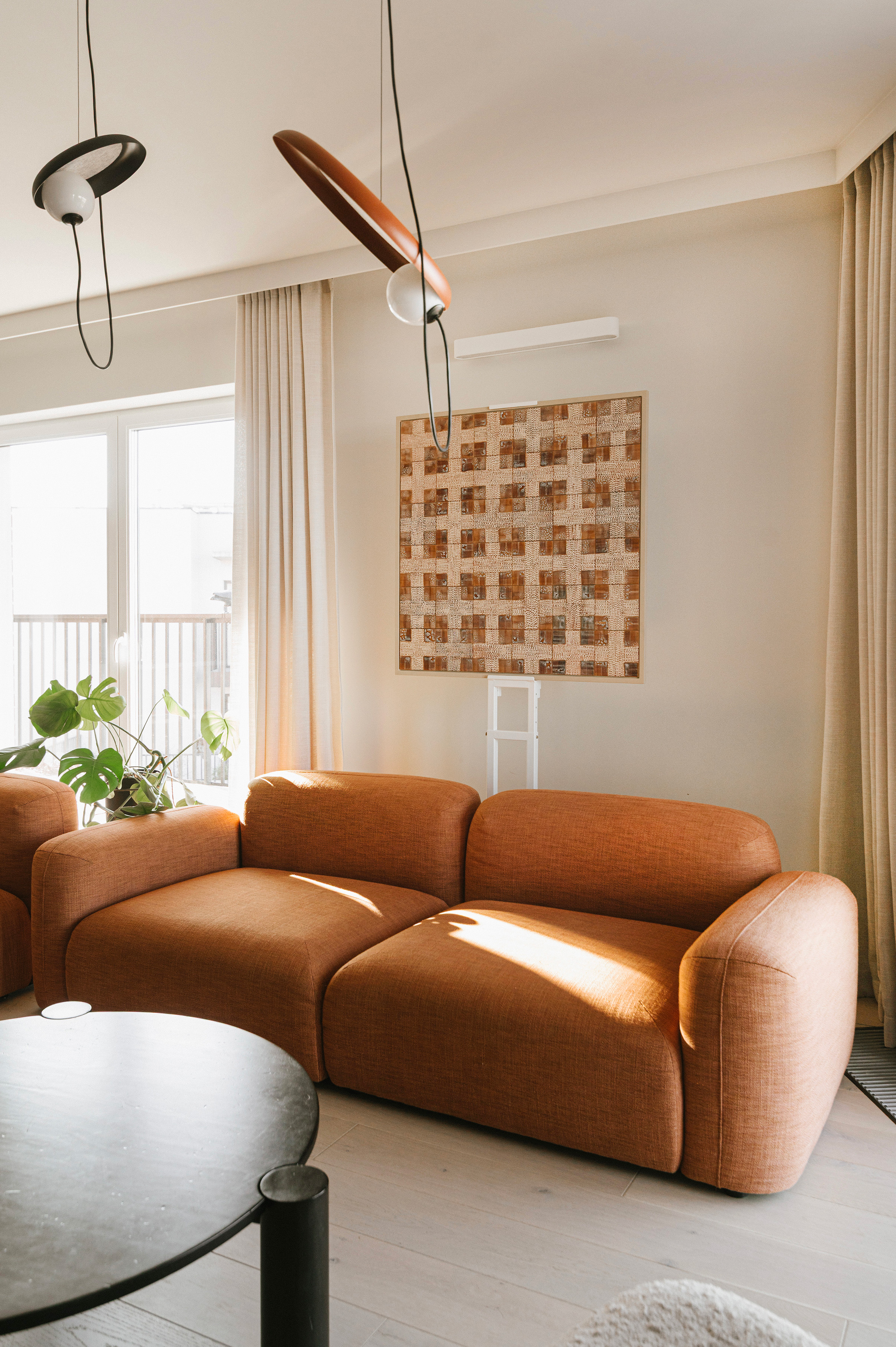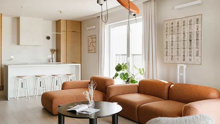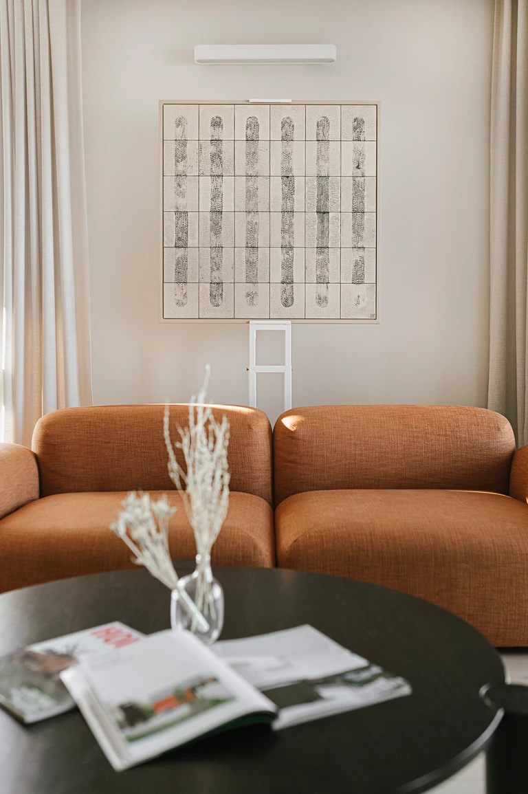 Centralnym punktem jest jasny salon z modułową sofą w rdzawym odcieniu, która wchodzi w bezpośredni dialog z obrazem „Beżowy rys” z kolekcji „Rytm linii” oraz pracą „Brązowy Splot”. Dzięki zróżnicowaniu faktur - od matowych po błyszczące - ceramiczne powierzchnie reagują na zmieniające się w ciągu dnia oświetlenie, dynamicznie wpływając na atmosferę wnętrza.