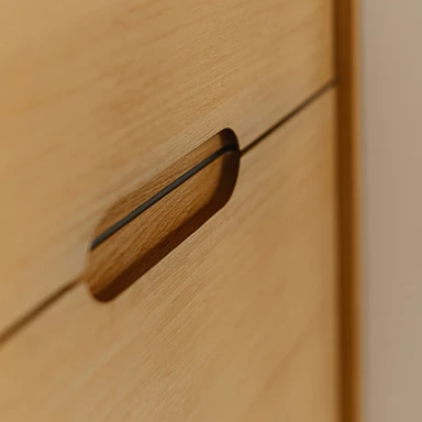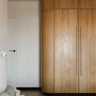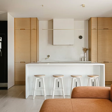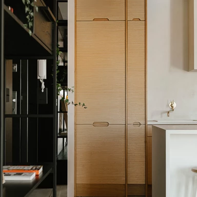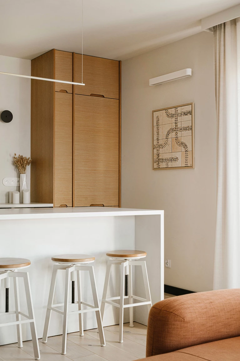 Wizualny spokój otwiera już strefa kuchenna, gdzie symetryczna zabudowa z naturalnej sklejki oraz stonowana paleta barw budują neutralną bazę dla ceramicznego obrazu „Biała Ścieżka”. Praca ta, złożona z ręcznie malowanych modułów, wprowadza subtelną grę światła, która zapowiada narrację kontynuowaną w pozostałych częściach mieszkania.