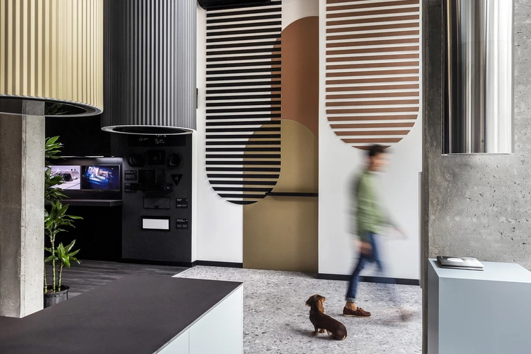 W witrynie showroomu zainstalowana została artystyczna instalacja – eyecatcher – której dynamiczne srebrne oraz różowo-złote elementy mają symbolizować pracę okapu, który wprowadza w ruch oraz filtruje cząsteczki powietrza. Showroom ma za zadanie jak najlepiej wyeksponować nie tylko sam produkt, ale również poszczególne grupy produktów. Dlatego w projektach pojawia się strefowość, która powinna być wynikiem przemyślanego i funkcjonalnego podziału pomieszczeń.