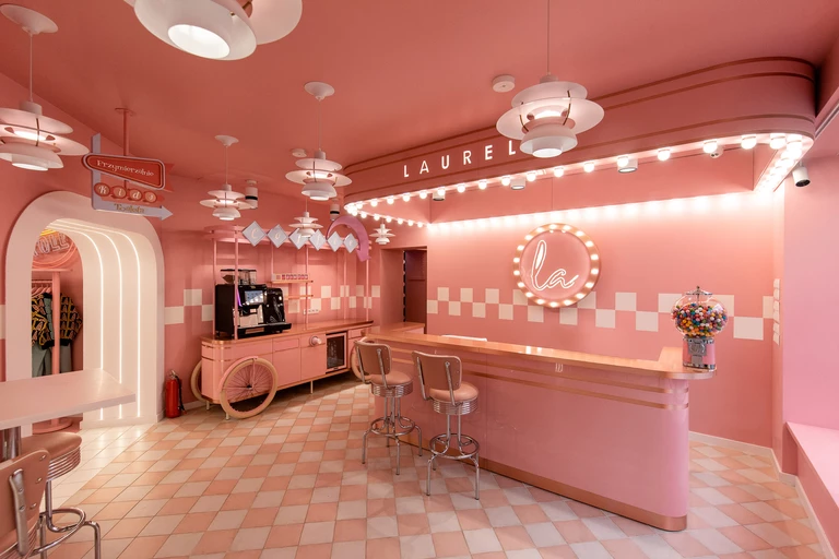 Po przekroczeniu progu sklepu Laurella w Poznaniu przenosimy się do innego świata. Wszechobecny róż, neony, hokery i kwadratowe płytki nawiązują do amerykańskich i angielskich z lat minionych: barów, basenów, stacji metra czy parków rozrywki. Dodatki vintage, takie jak telefony na monety, szafa grająca, wrotki i automaty na gumy balonowe, potęgują to wrażenie. Główne założenie projektu było jasne: sklep musi być najbardziej różowym i instagramowym miejscem na mapie kraju.