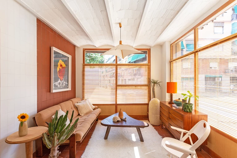 W salonie zamontowano żaluzje z bukowego drewna, które – oprócz tego, że chronią od słońca – sprawiają, że światło wpadające przez okna do mieszkania prezentuje się bardzo poetycko. Wzrok w pomieszczeniu przyciąga także aksamitna sofa AG Barcelona 70 o delikatnym, beżowym odcieniu, z którą doskonale komponują się marokańskie poduszki z wełny. Obok stoi stolik w stylu lat 50. w jasnobrązowej tonacji, na którym znajduje się kataloński wazon ceramiczny z lat 60.