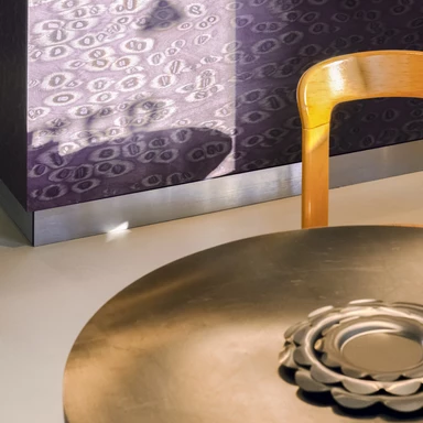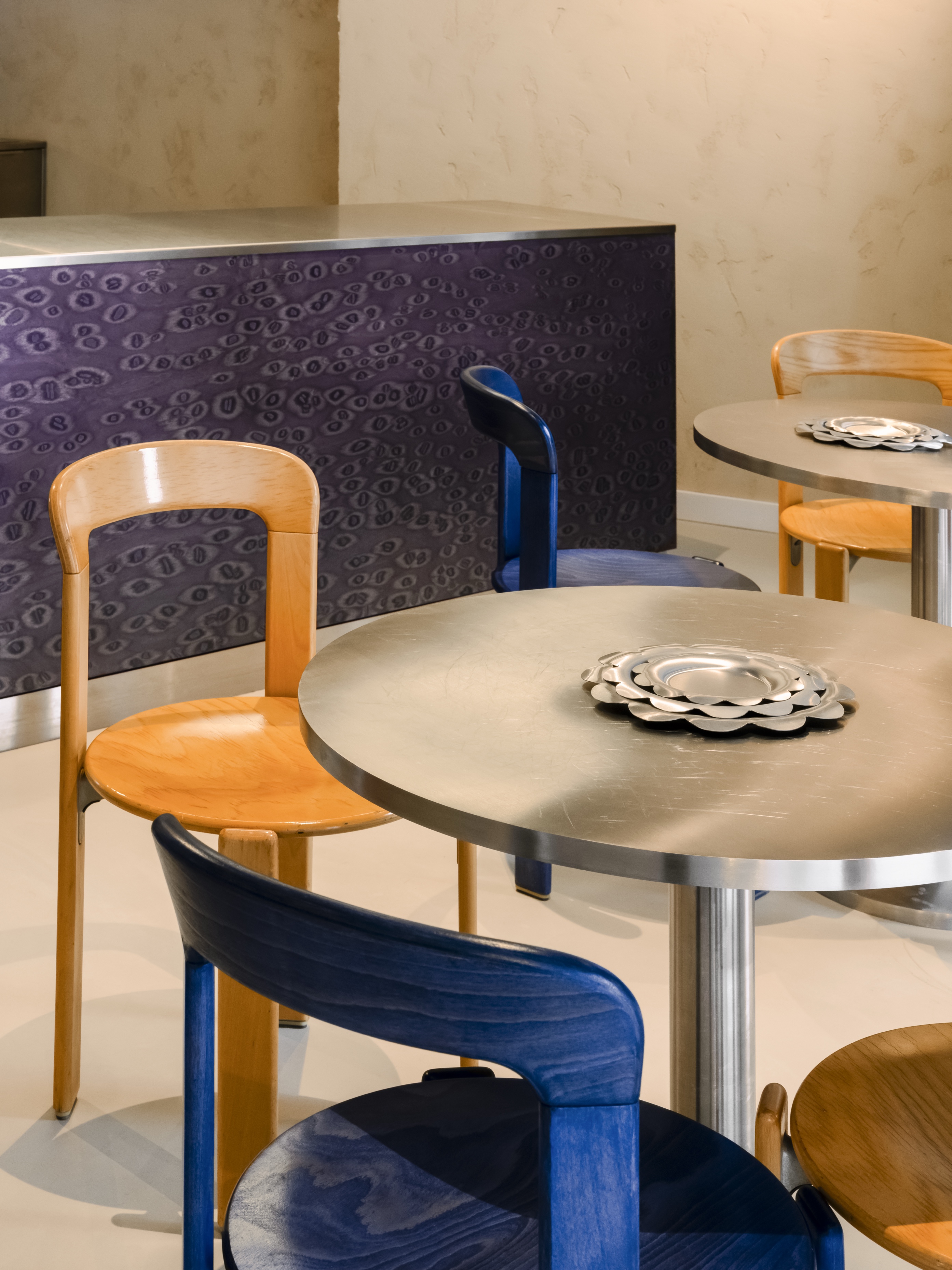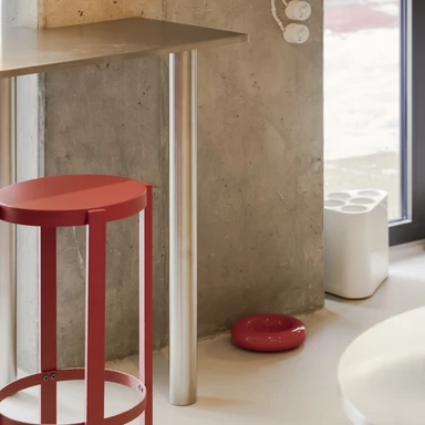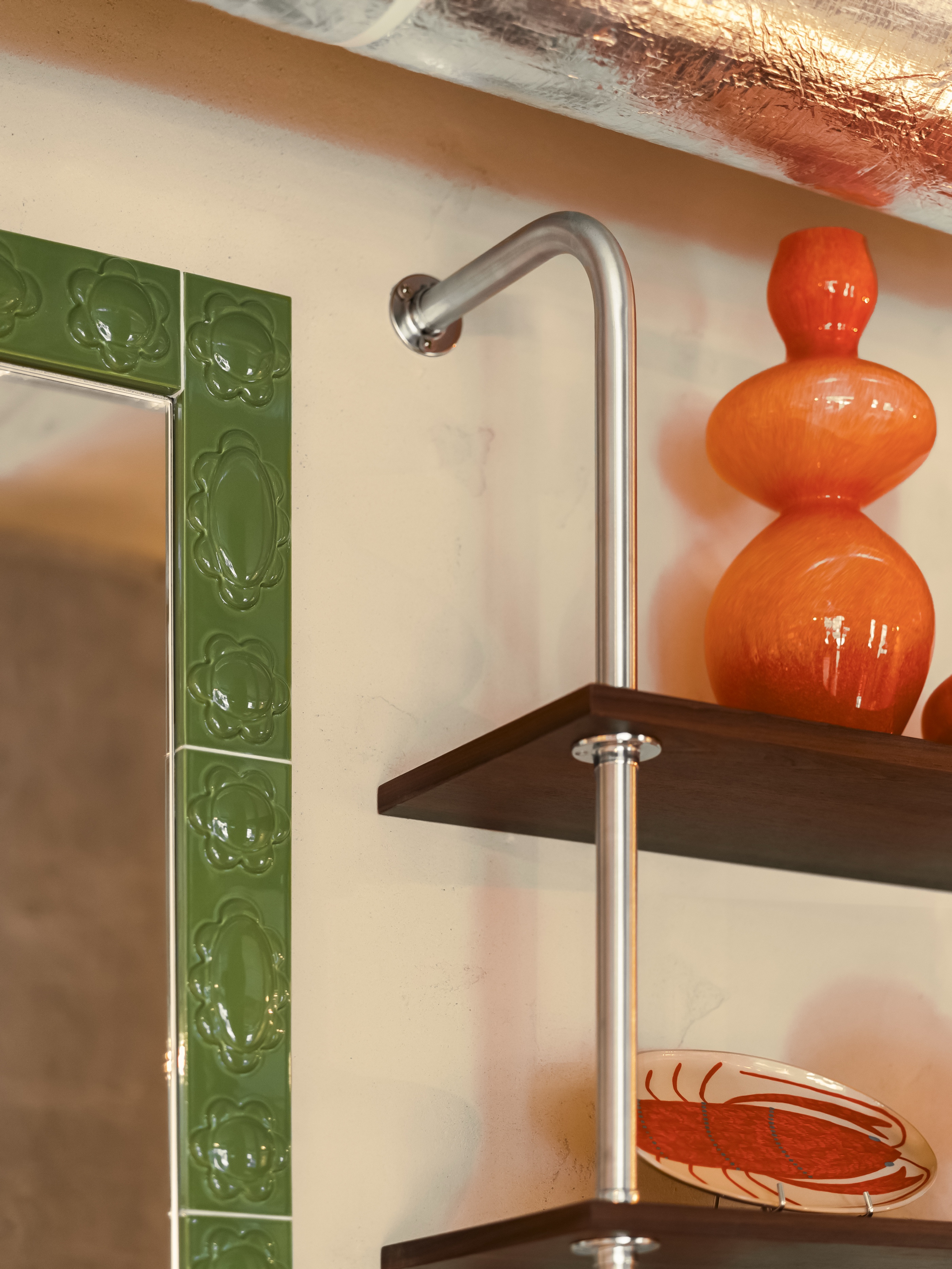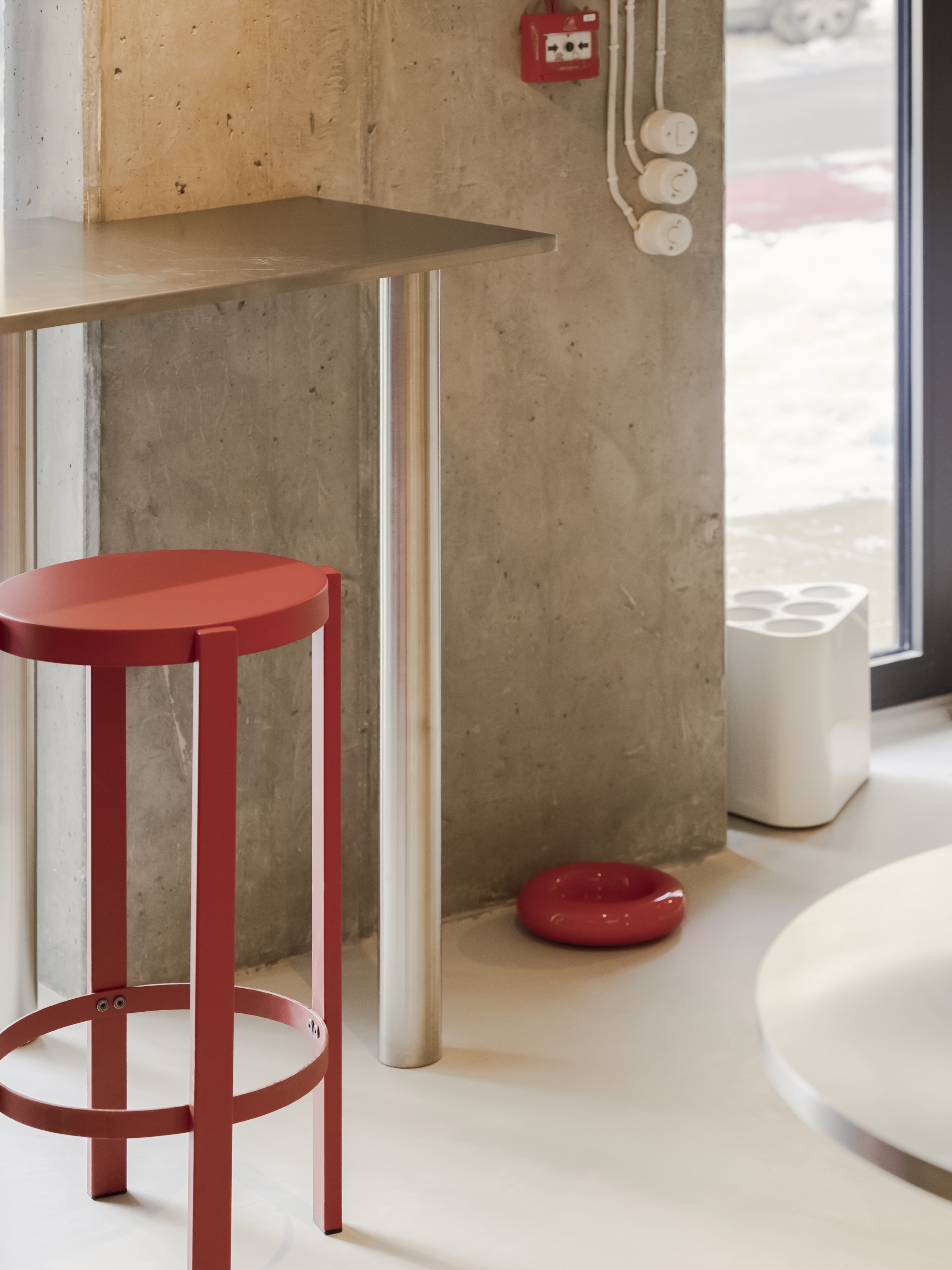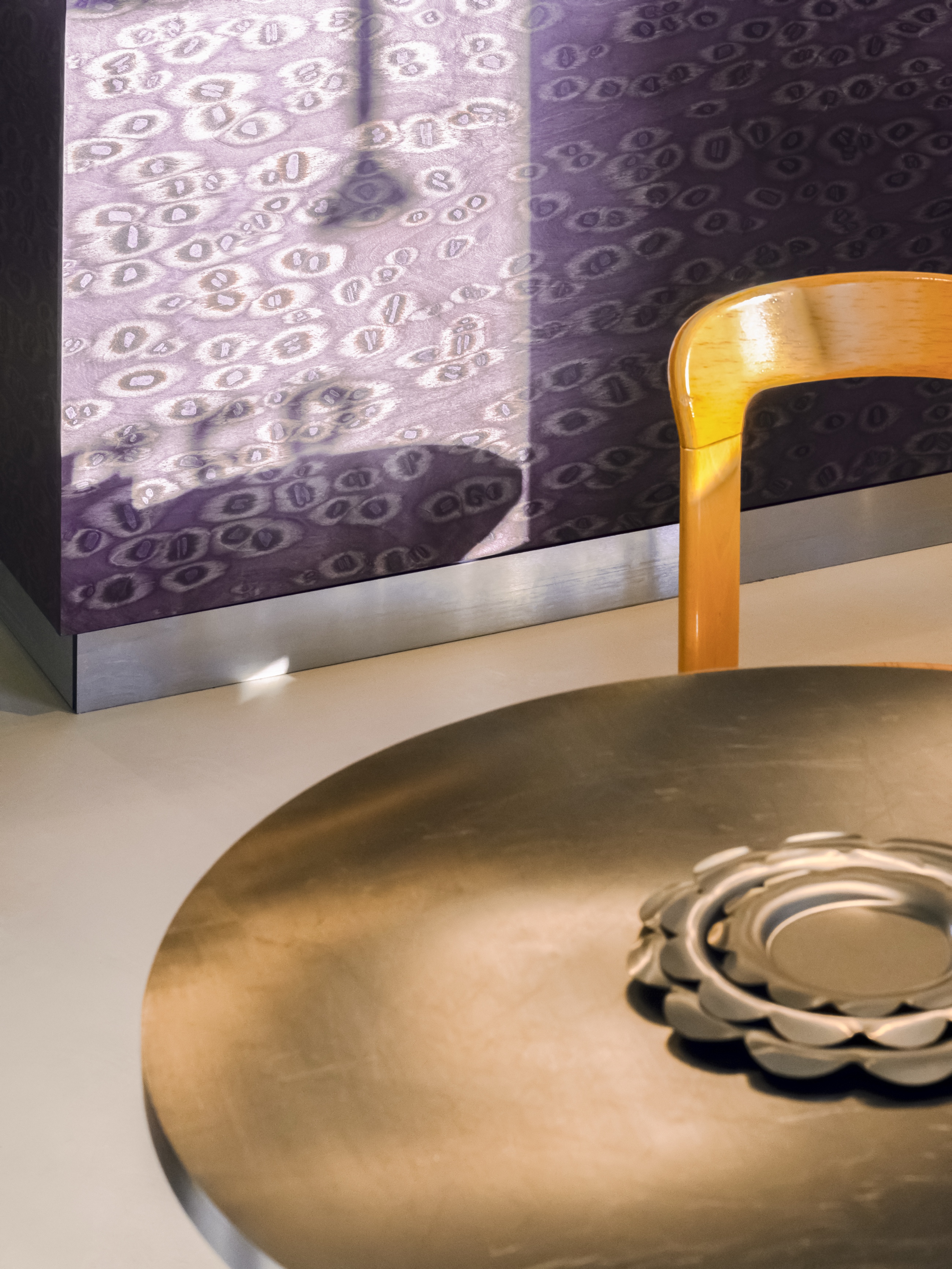 W innych częściach wnętrza wzrok przyciąga włoski stół ekspozycyjny z intensywnie niebieskiego szkła oraz lampa z końca lat 70. w kolorze czerwonym. Te elementy z różnych dekad tworzą eklektyczną, wielowarstwową przestrzeń, w której nowoczesne materiały i autorskie rozwiązania spotykają się z historią designu.