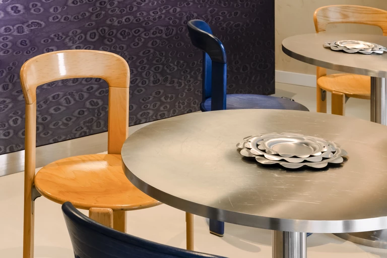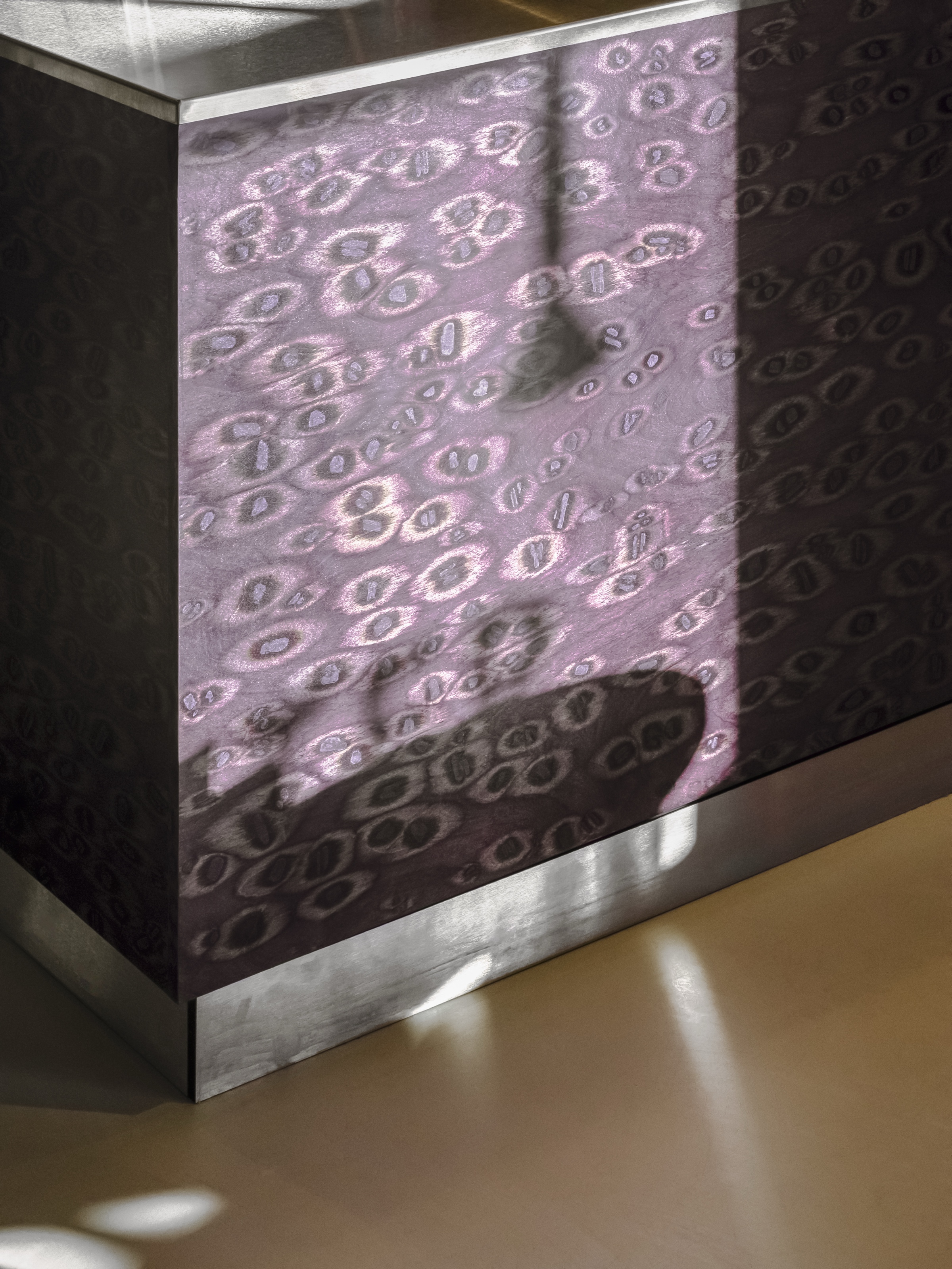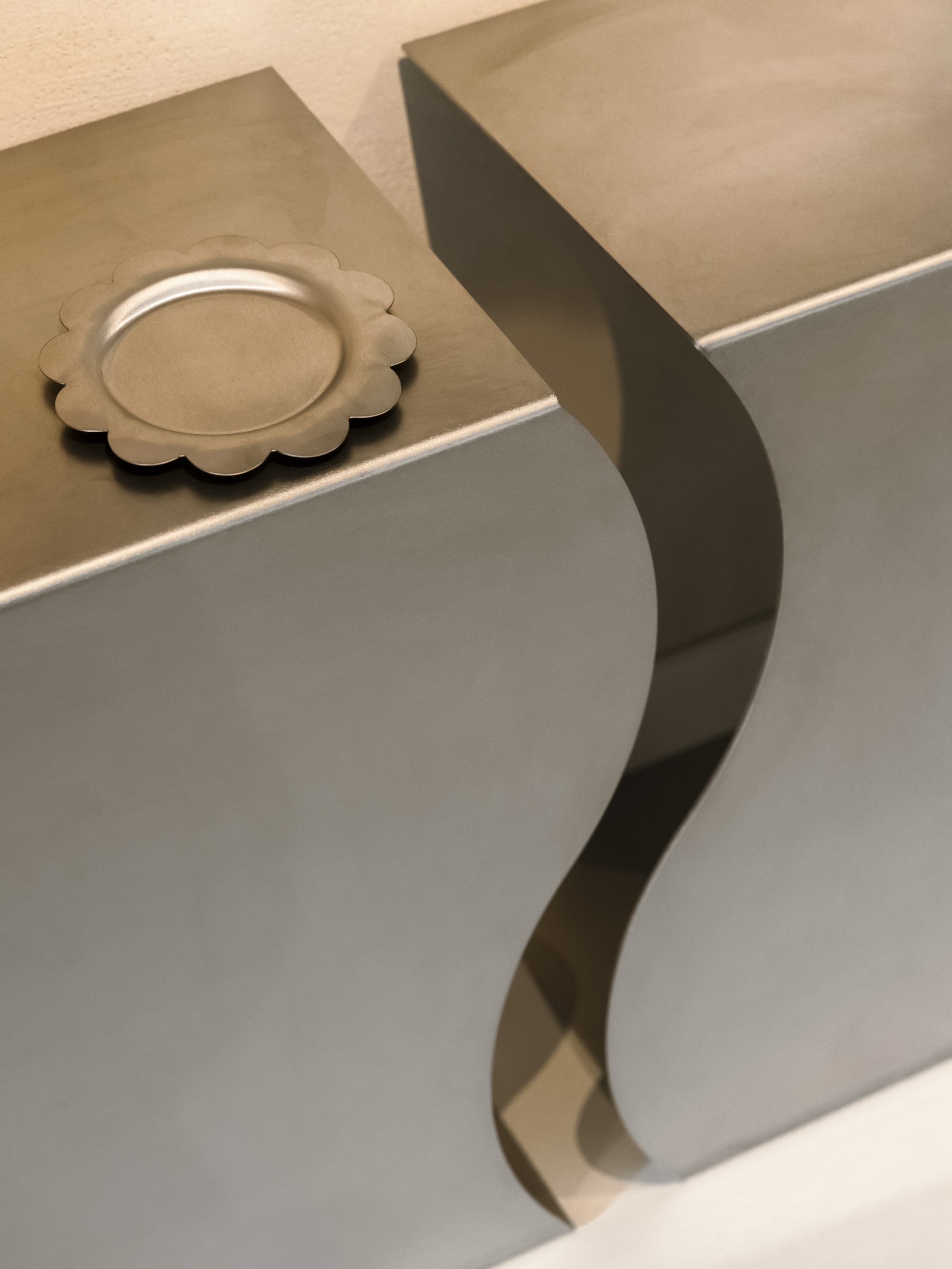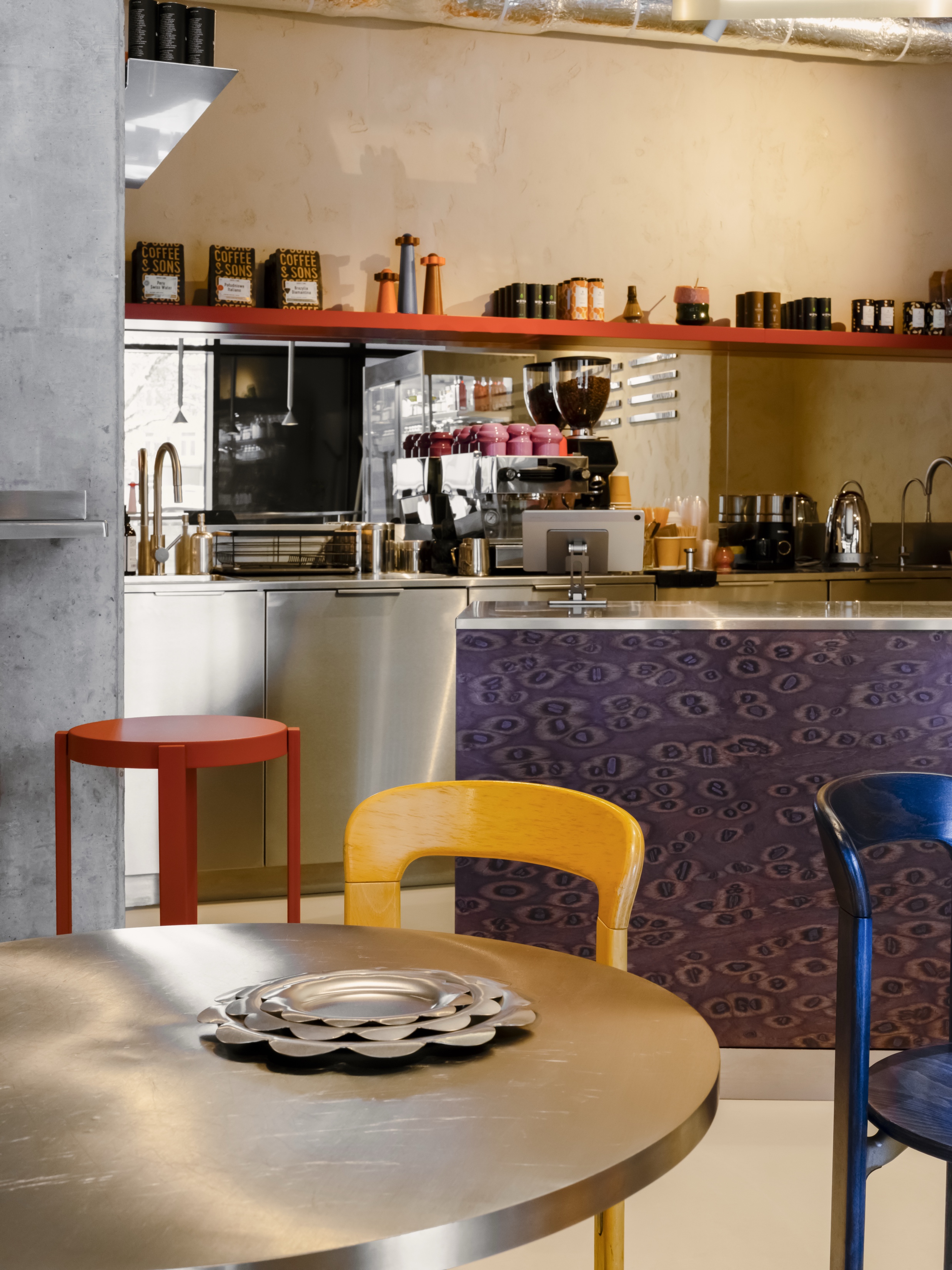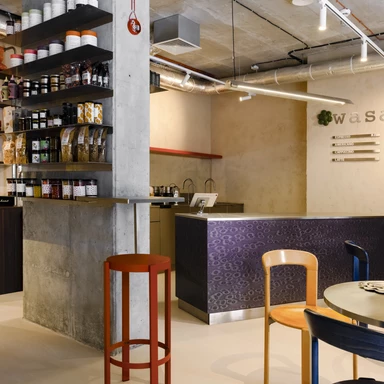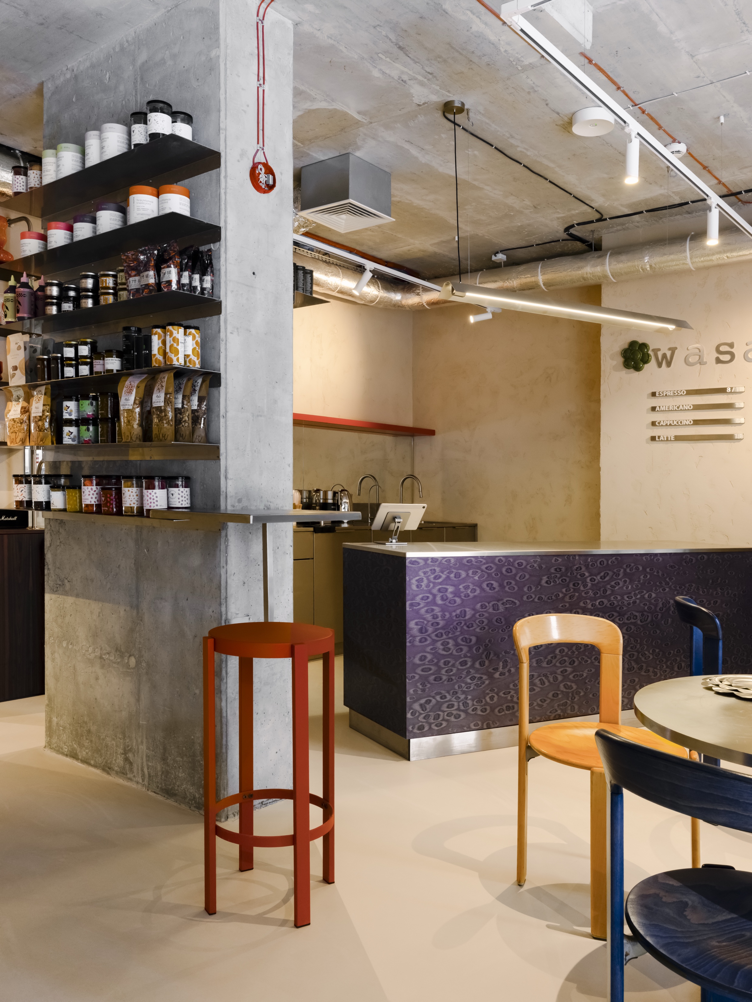 Wasalaa space sprytnie łączy funkcję kawiarni z nowoczesnym sklepem odzieżowym oraz strefą marki bieliźniano-kosmetycznej. Już w części kawiarnianej pojawia się innowacyjny materiał - berliński fornir LLOTLLOV barwiony kryształkami soli, który w tym projekcie został wykorzystany po raz pierwszy w Polsce. Jego niejednorodna struktura stanowi kontrapunkt dla chłodnej bazy wykonanej z konstrukcyjnego betonu i metalu.