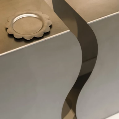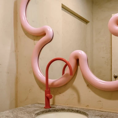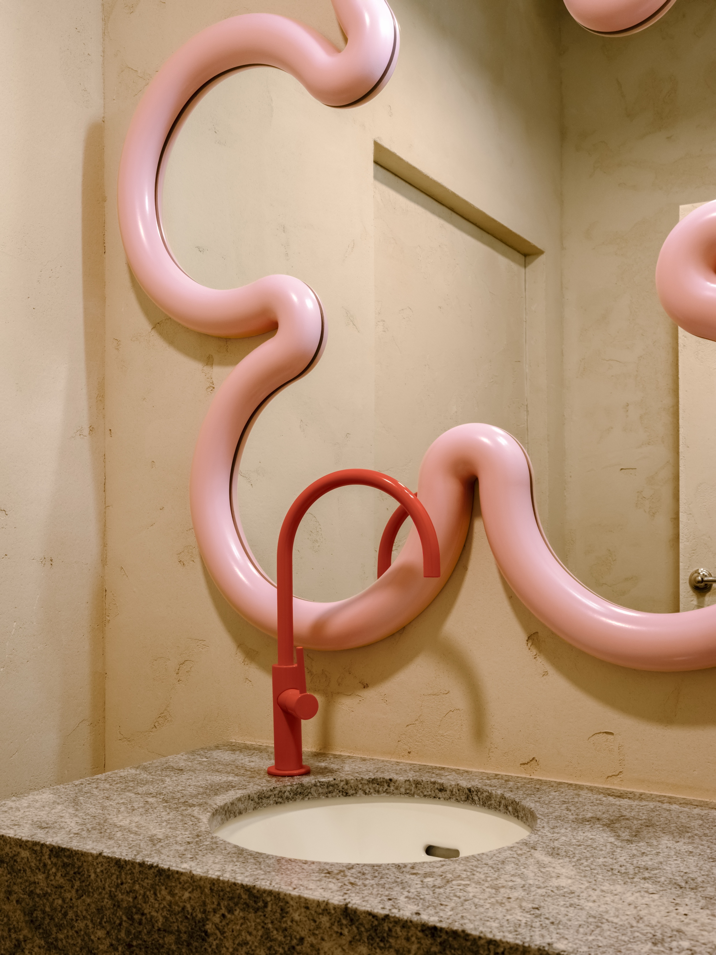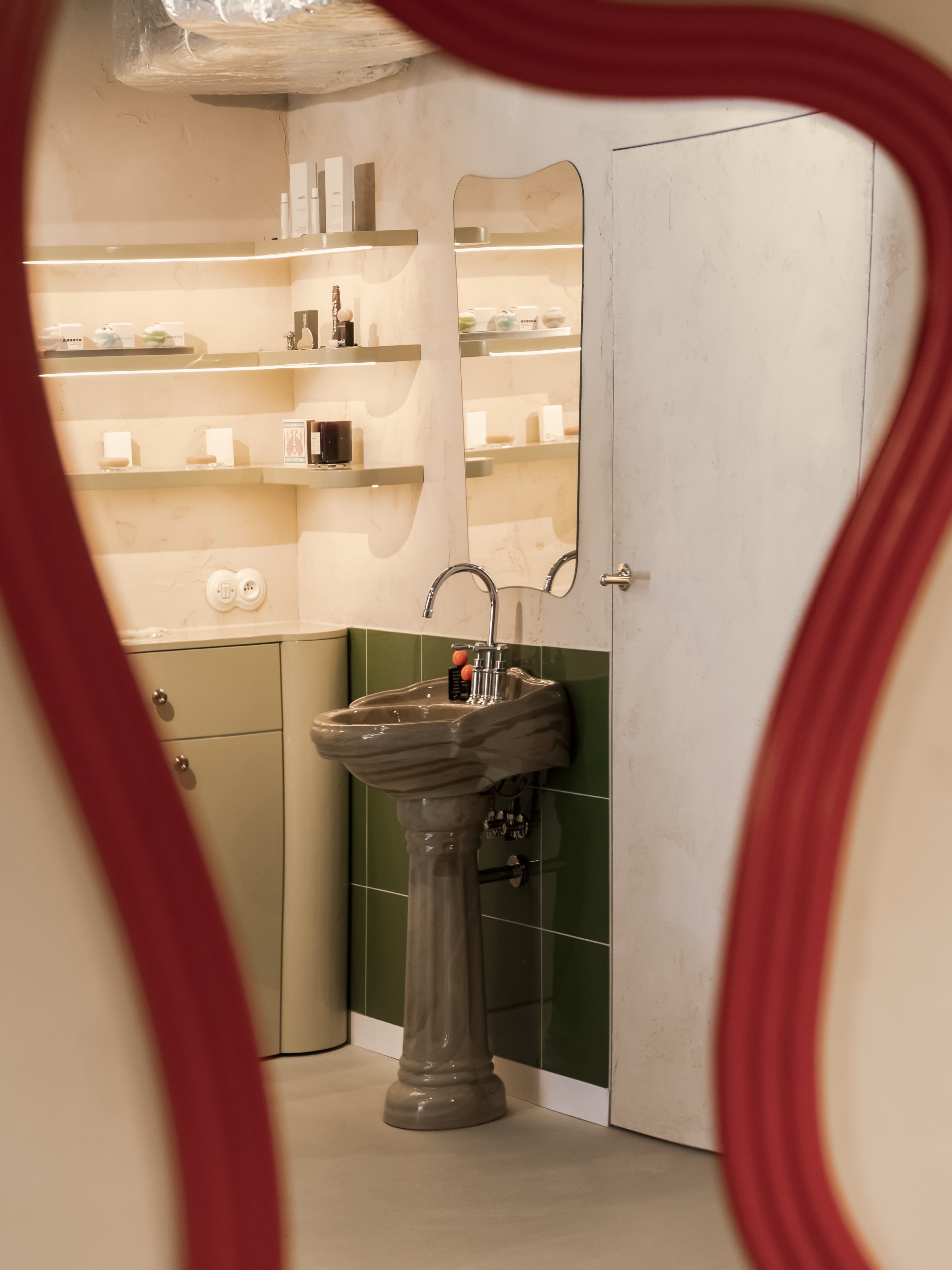 Dalsza część lokalu, dedykowana strefie kosmetyczno-bieliźnianej Ooponka, ma bardziej intymny i zmysłowy wyraz. Jej centralnym punktem jest rzeźbiarska, barwiona w masie umywalka inspirowana meksykańskim wzornictwem.