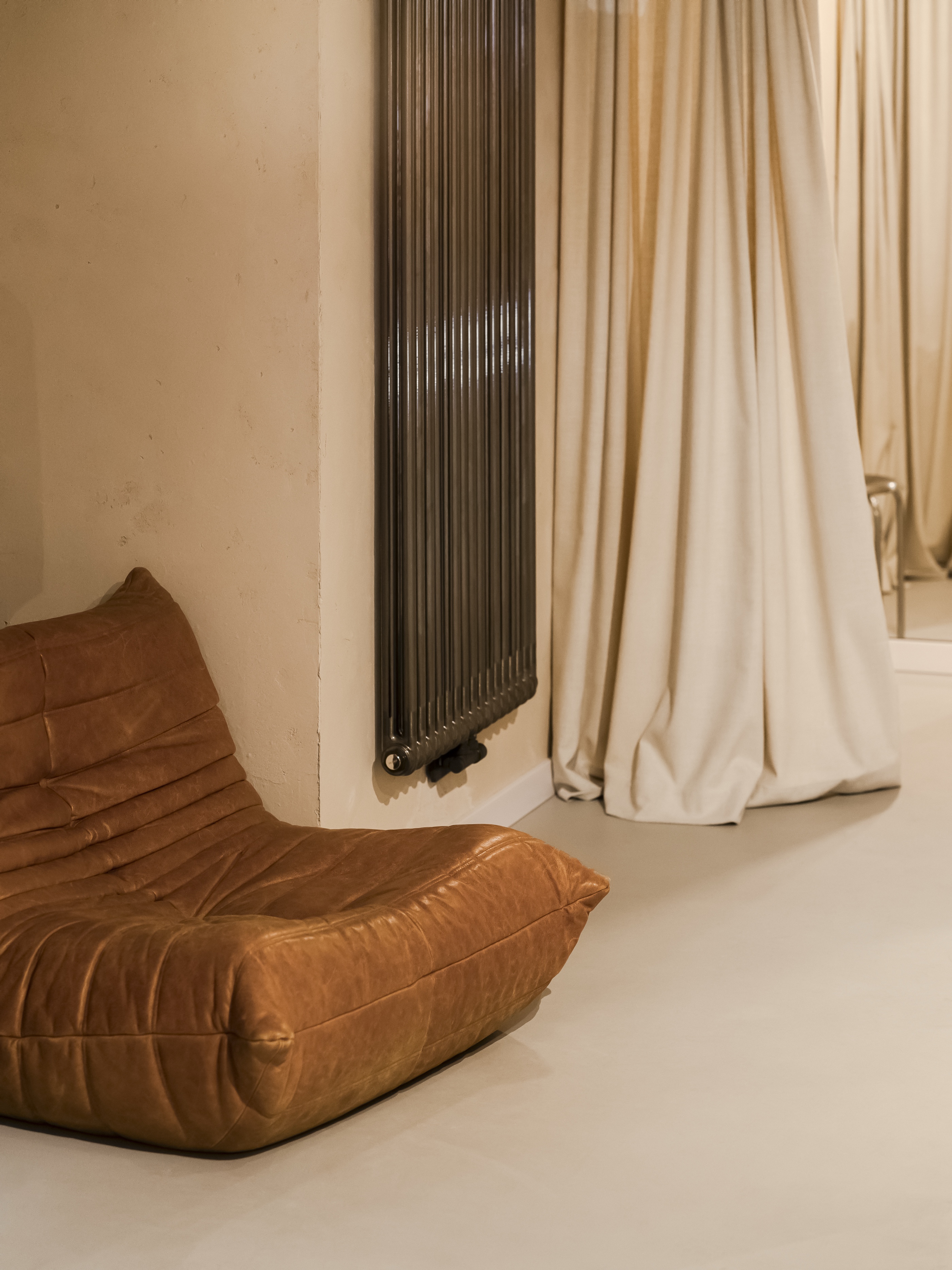 Tożsamość Wasalaa space budują starannie dobrane meble vintage, które chronią projekt przed efektem „katalogowej” powtarzalności. Wśród nich szczególną rolę odgrywa ikoniczna sofa Togo projektu Ligne Roset o miękkiej, organicznej formie.