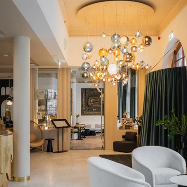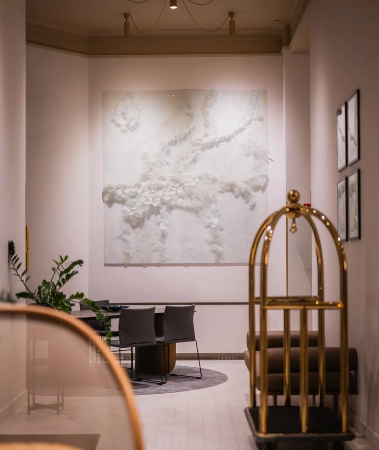 Wizualna tożsamość obiektu opiera się na dialogu między klasycznymi formami a rzemiosłem artystycznym. Integralną częścią narracji są realizacje Edyty Barańskiej, światowej sławy artystki tworzącej w szkle. W strefie wejściowej gości wita żyrandol z kolorowych kul wykonany tradycyjną metodą szkła weneckiego, a dopełnieniem całości są szklane płaskorzeźby rozmieszczone w lobby i apartamentach. Wykorzystanie szkła jako głównego medium artystycznego sprawia, że wnętrza zmieniają się w zależności od pory dnia i kąta padania światła, co nadaje im zmienny, niemal sceniczny wyraz.