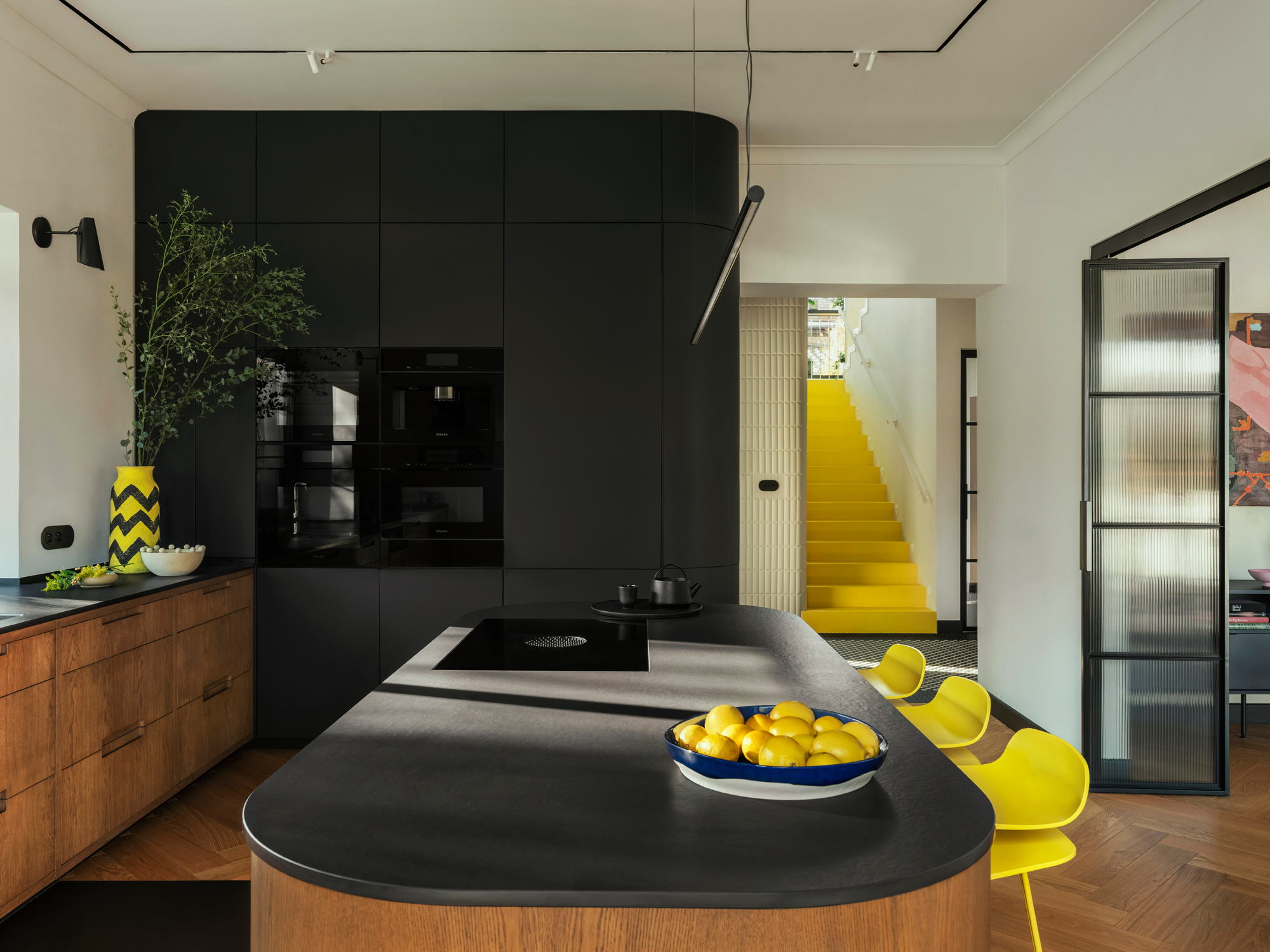 Koncepcja wnętrza, będąca w dużej mierze efektem bliskiej współpracy właścicieli i projektantów , łączy estetykę przedwojenną z elementami współczesnymi. Głównym założeniem przy projektowaniu parteru było stworzenie przestronnej, otwartej strefy dziennej.