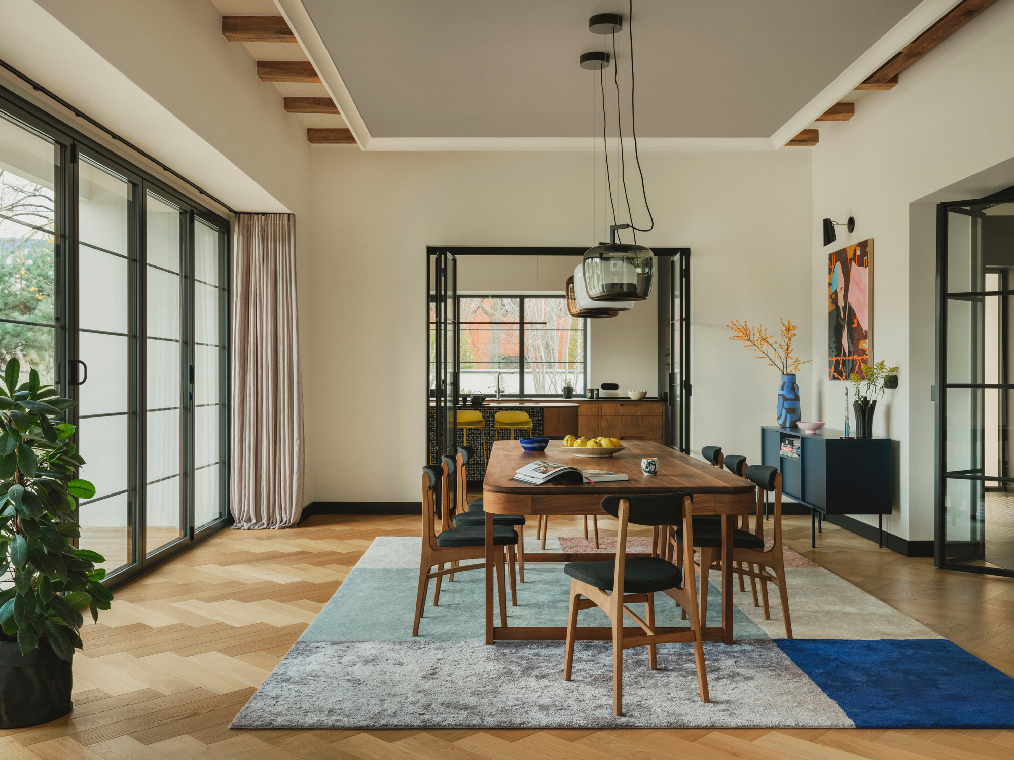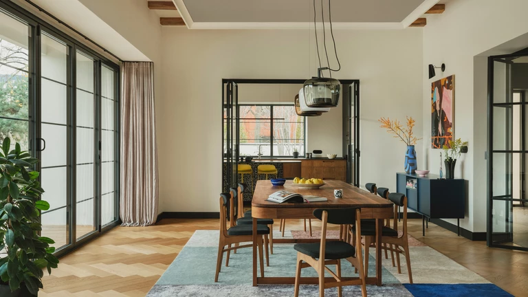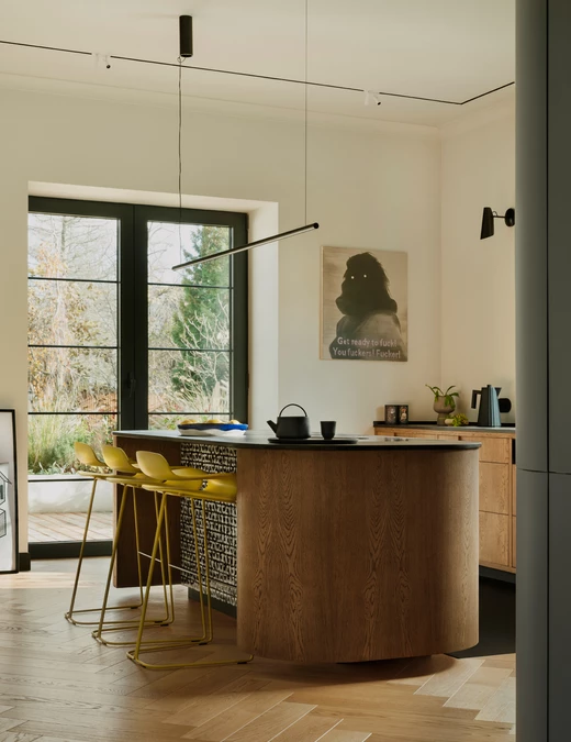 Te historyczne nawiązania stanowią tło dla starannie dobranych elementów współczesnego polskiego wzornictwa. W kuchni i pralni wykorzystano ręcznie robione płytki młodej marki Presja Design. Centralnym punktem strefy dziennej stał się duży, indywidualnie zaprojektowany stół z orzecha amerykańskiego, wykonany przez In Wood We Trust.