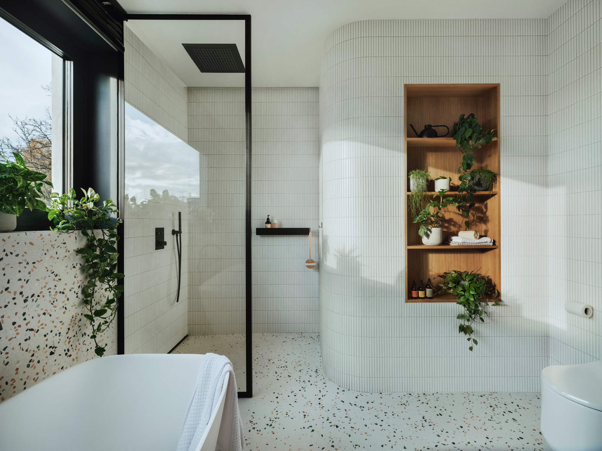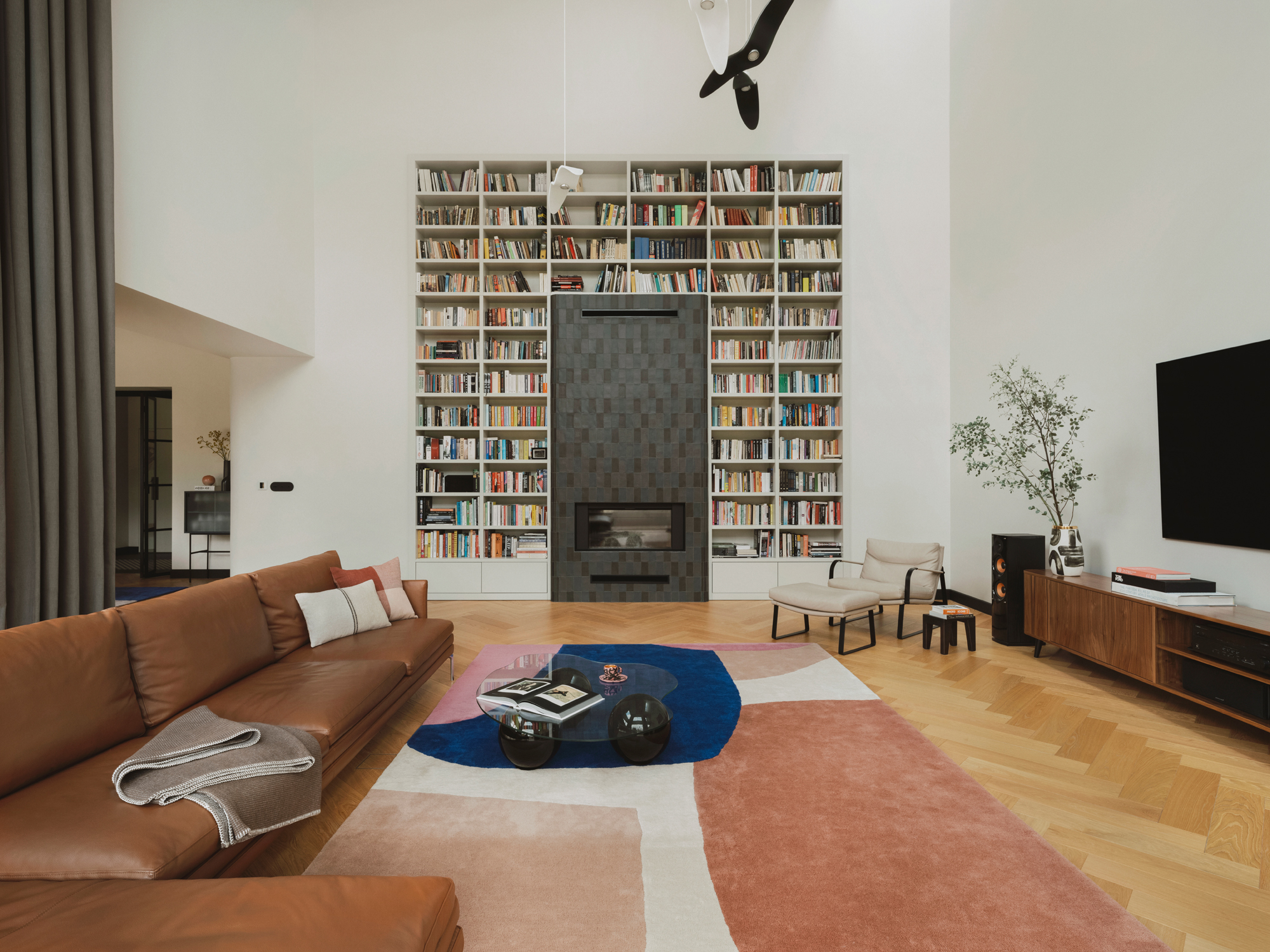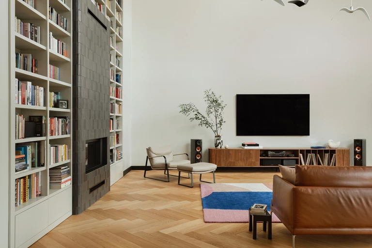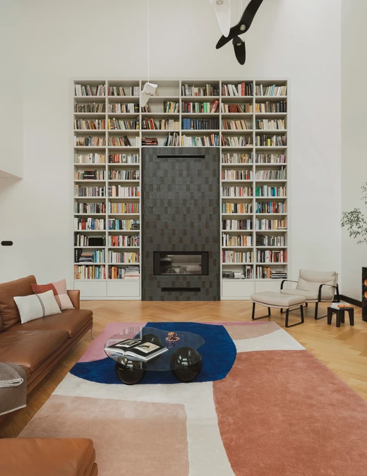 Sercem domu stał się salon o imponującej wysokości całego budynku (8 metrów), mieszczący obszerną bibliotekę. Przestrzeń doświetla świetlik w dachu, otwarty na taras. Dzięki zastosowaniu przesuwnych drzwi tarasowych na pełną szerokość ścian, udało się zatrzeć granicę między wnętrzem a ogrodem. Taras, kuchnia, jadalnia i salon tworzą jedną, przenikającą się przestrzeń dzienną, otwartą na ogród zaprojektowany przez Plantum Design.