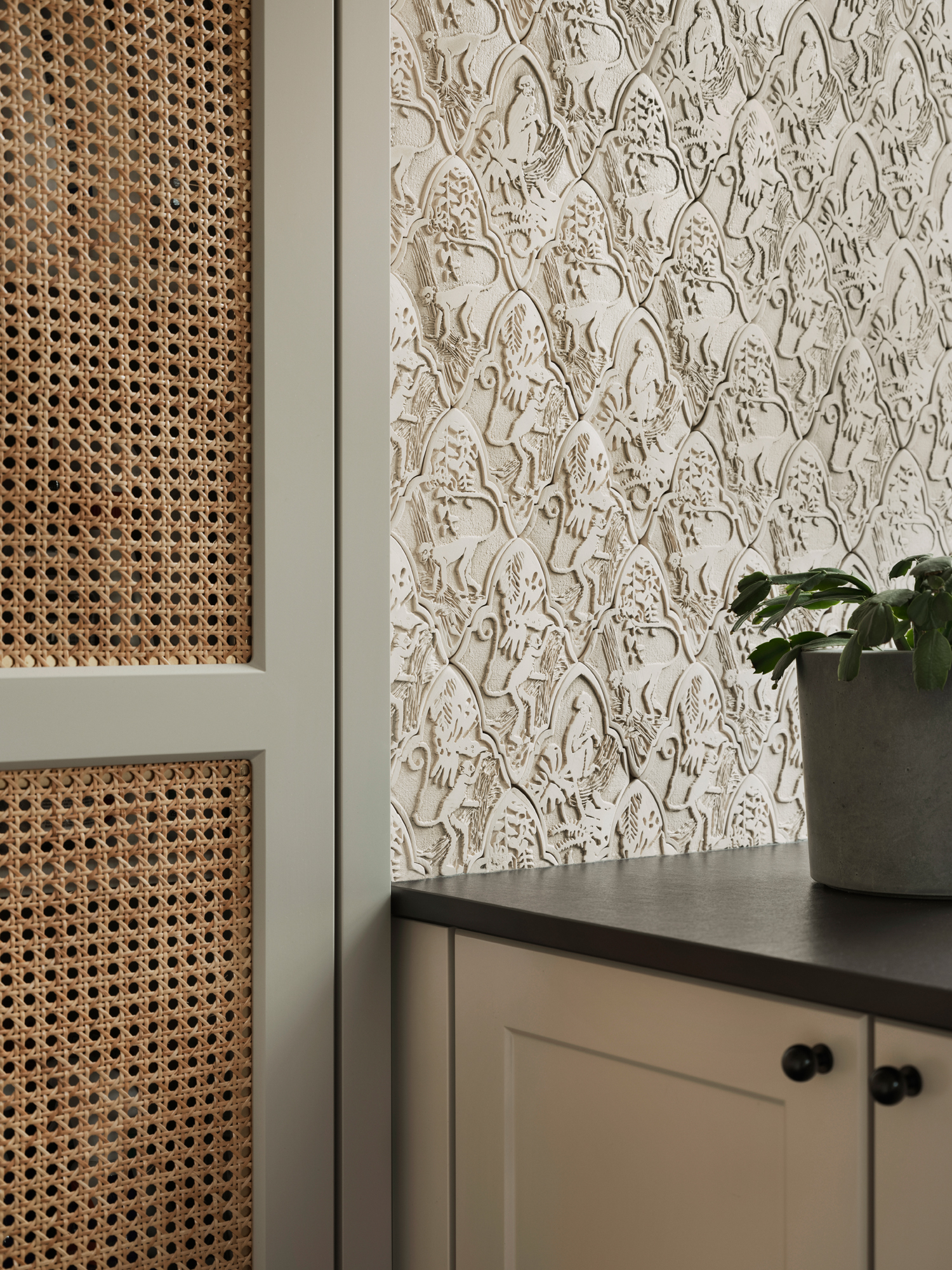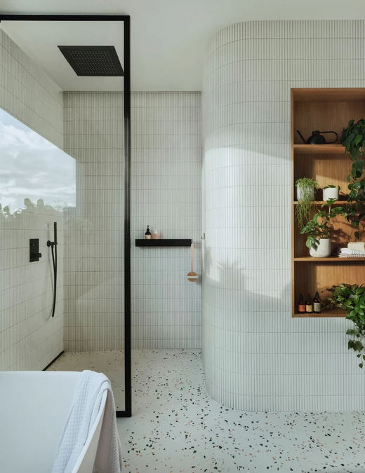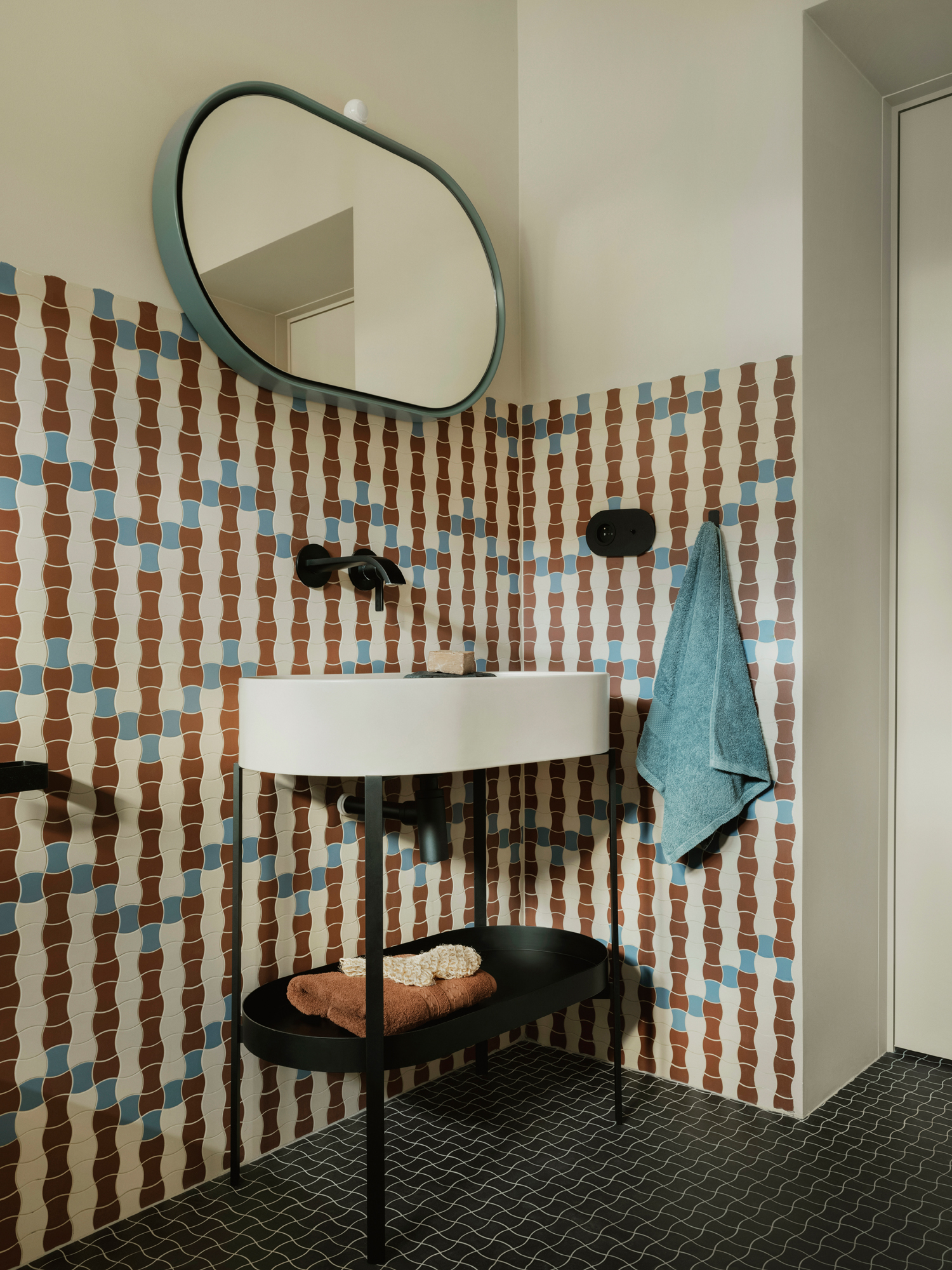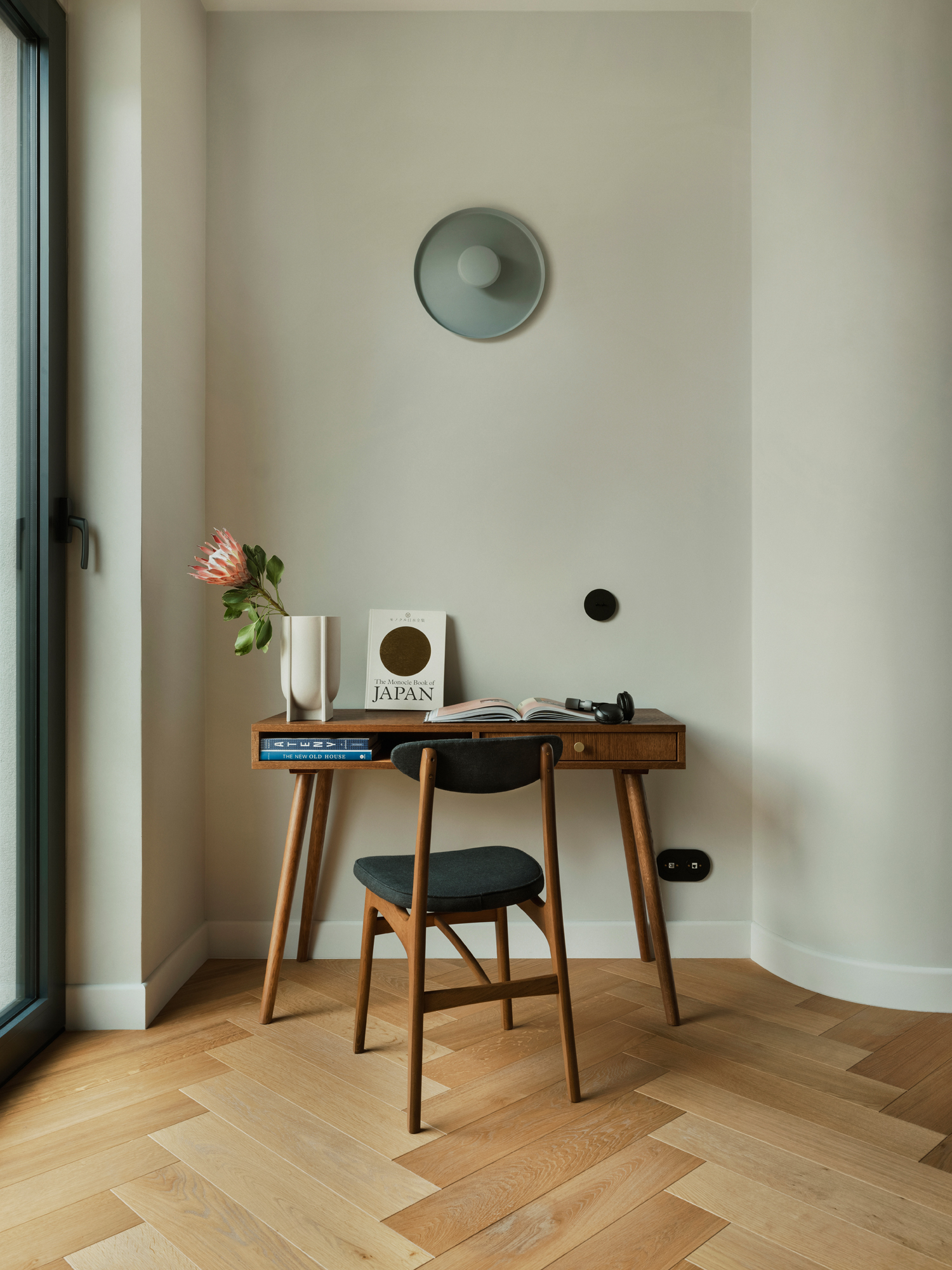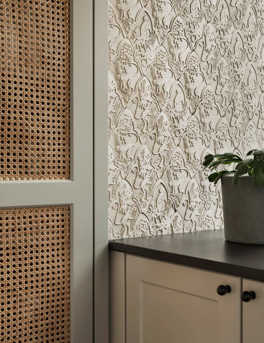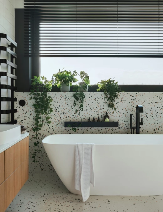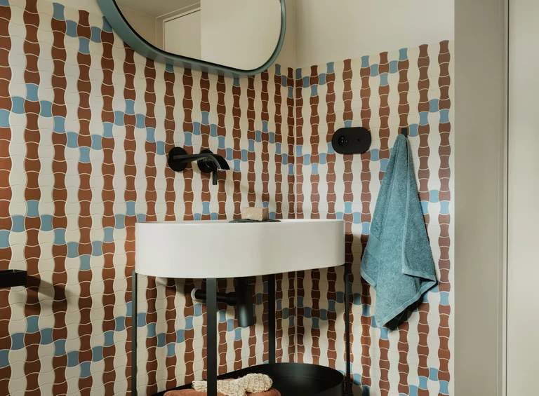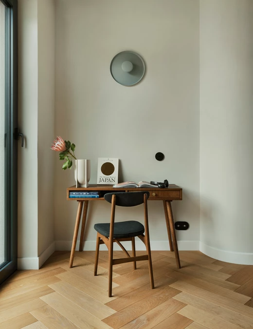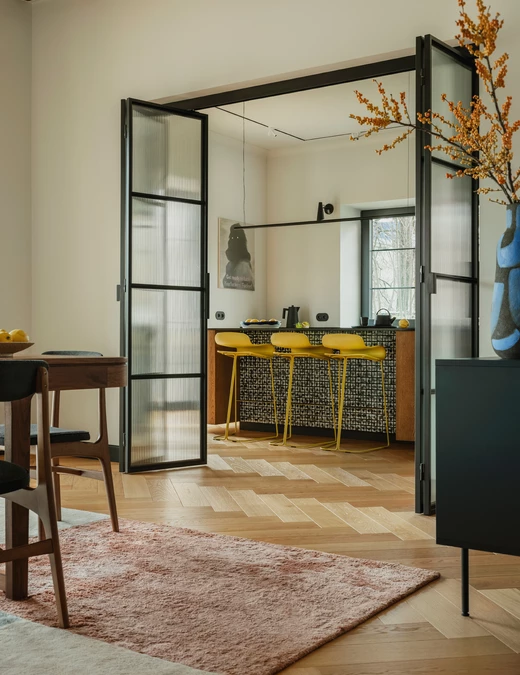 Duch modernizmu jest tu wyczuwalny na każdym kroku. W strefie dziennej zdecydowano się na klasyczny parkiet ułożony w jodełkę. W korytarzach, garderobach i pralni pojawiają się z kolei charakterystyczne płytki modernistyczne, tzw. „gorseciki”.