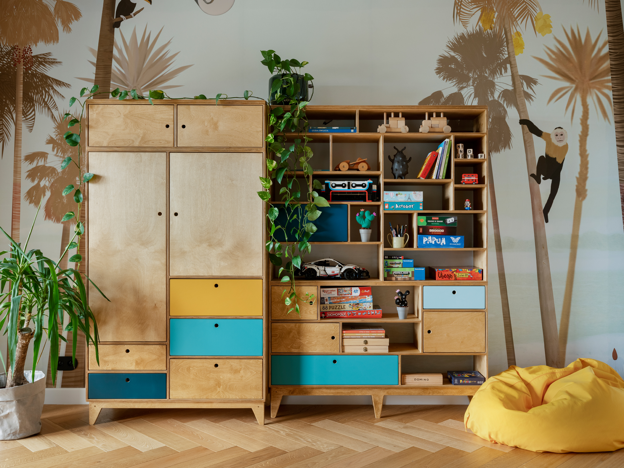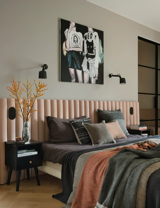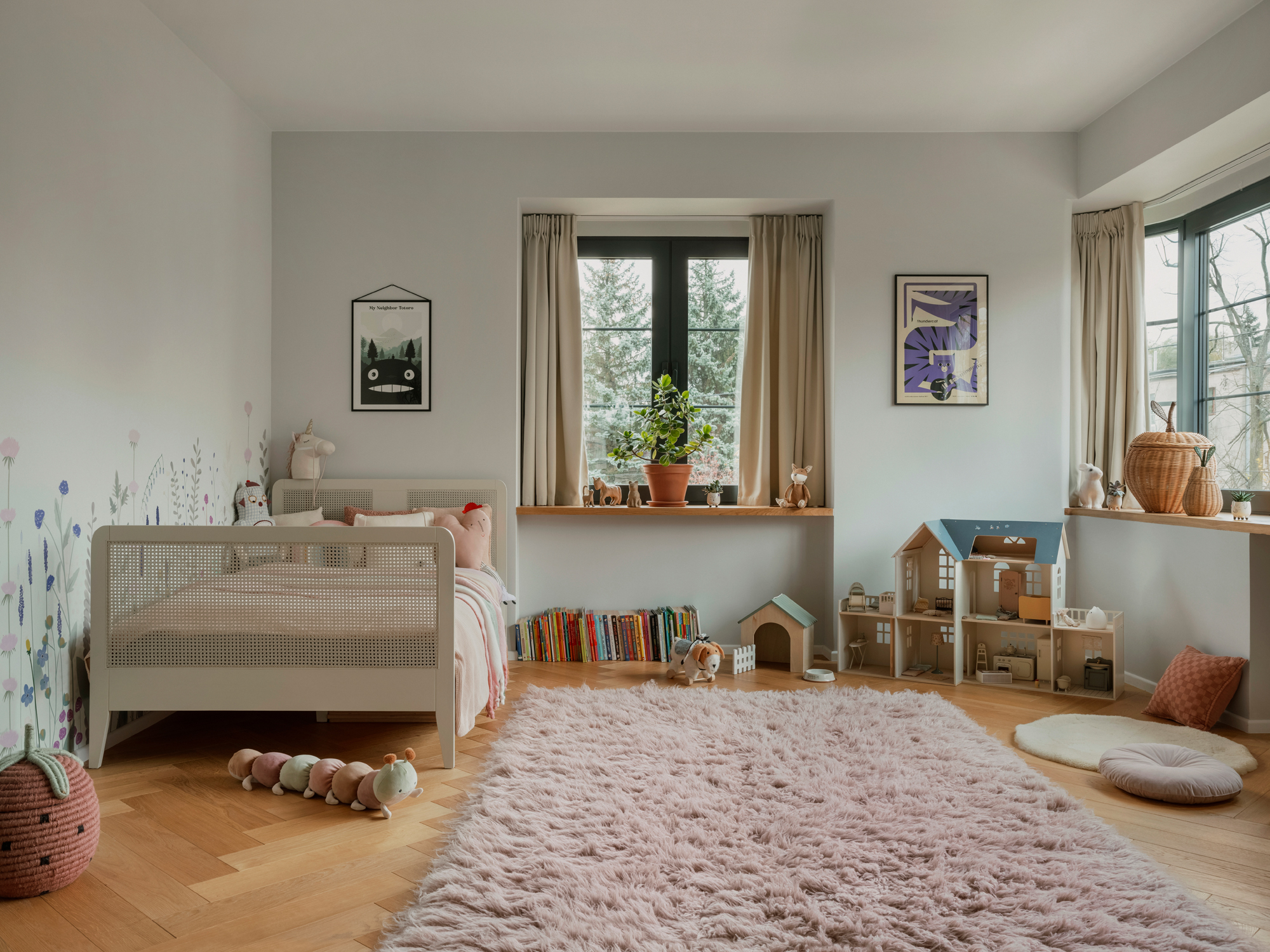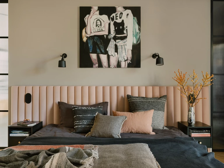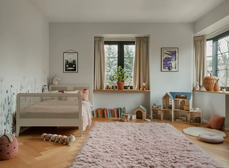 Piętro willi stanowi prywatną strefę sypialną. Dominuje tu konsekwentne użycie naturalnych materiałów. W obu łazienkach zastosowano efektowne wylewane lastryko, a w pokojach dziecięcych meble od polskich marek, takich jak Wood Republic czy Pastform.