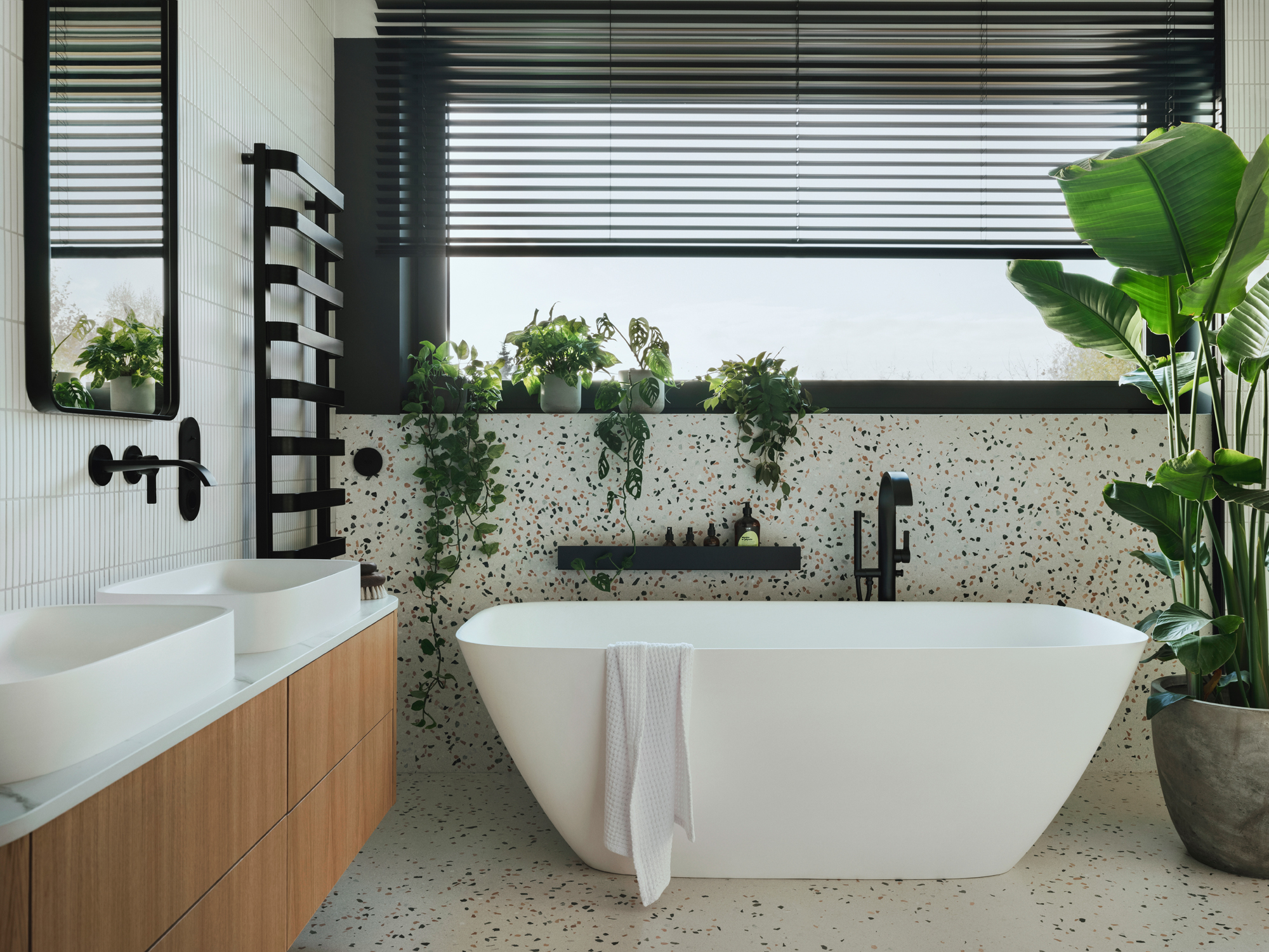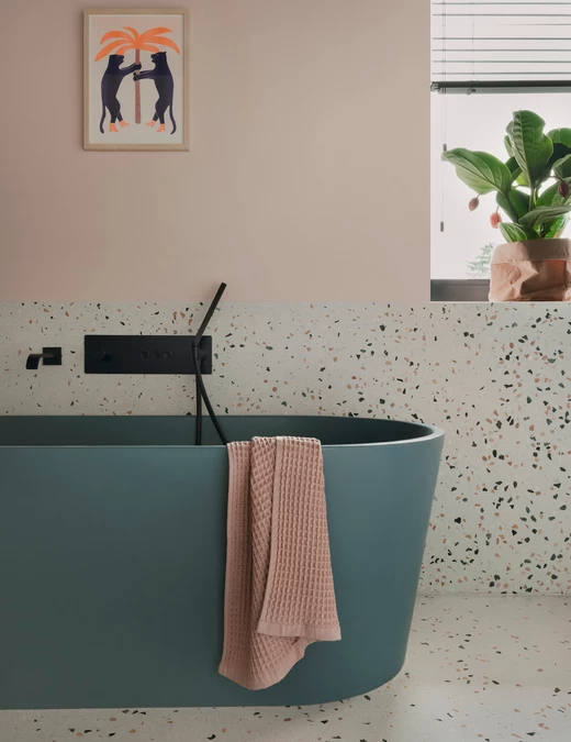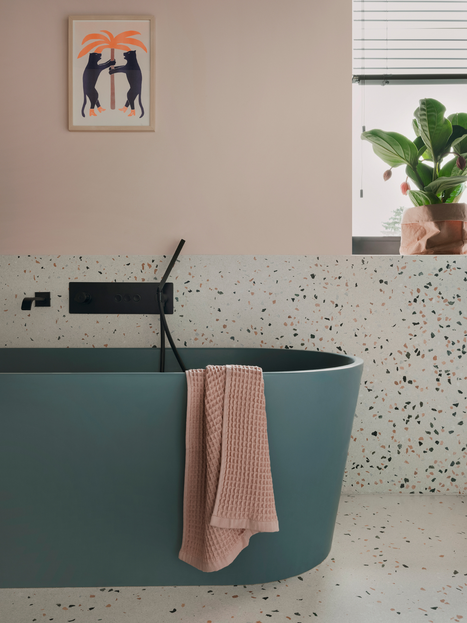 Piętro willi stanowi prywatną strefę sypialną. Dominuje tu konsekwentne użycie naturalnych materiałów. W obu łazienkach zastosowano efektowne wylewane lastryko, a w pokojach dziecięcych meble od polskich marek, takich jak Wood Republic czy Pastform.