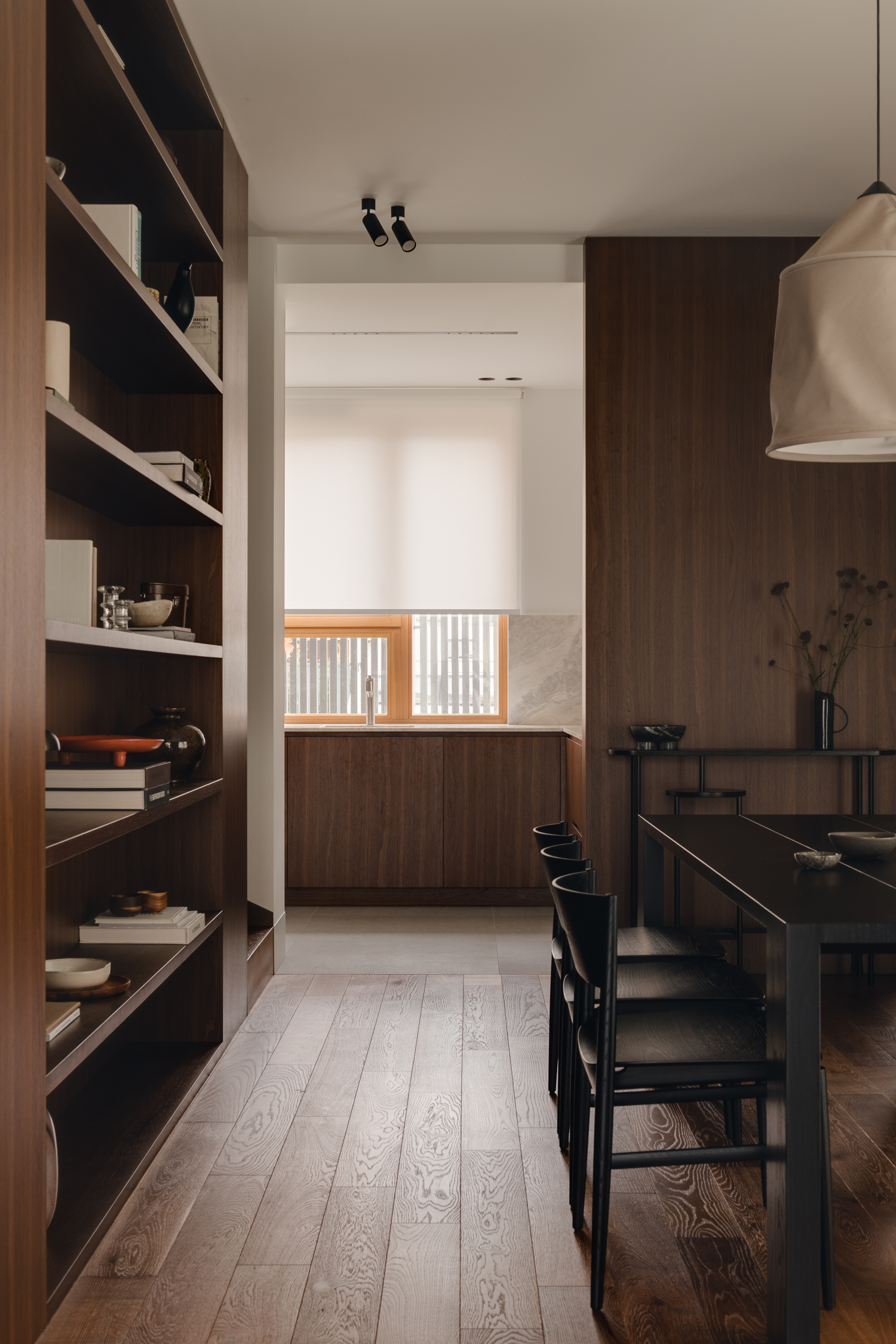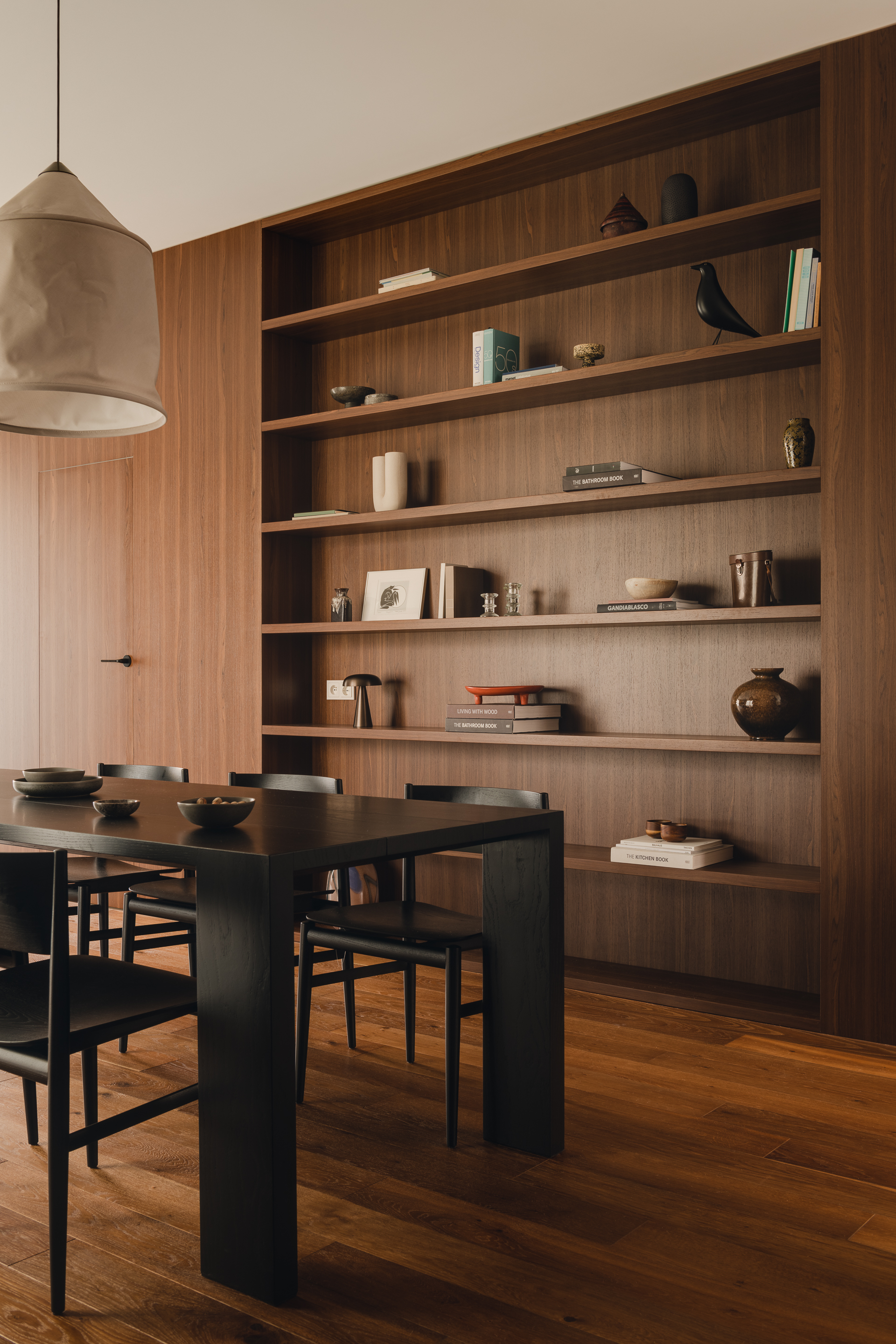 Istotną ingerencją w funkcjonalność domu było przekształcenie pierwotnie otwartych schodów. Na poziomie parteru projektanci zabudowali je masywnym dębowym regałem, który porządkuje przestrzeń salonu i jednocześnie mieści dodatkowe pomieszczenie gospodarcze. Ściany wyłożyli ciemnym fornirem, spójnym z resztą wnętrza. Na piętrze klatkę schodową zamknęli ażurowym przepierzeniem w tym samym wykończeniu. Stopnie obłożyli płytą fornirowaną z wybarwianego dębu. Całość uzupełnia listwa przyschodowa oraz zaprojektowana na zamówienie, podświetlana poręcz.