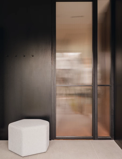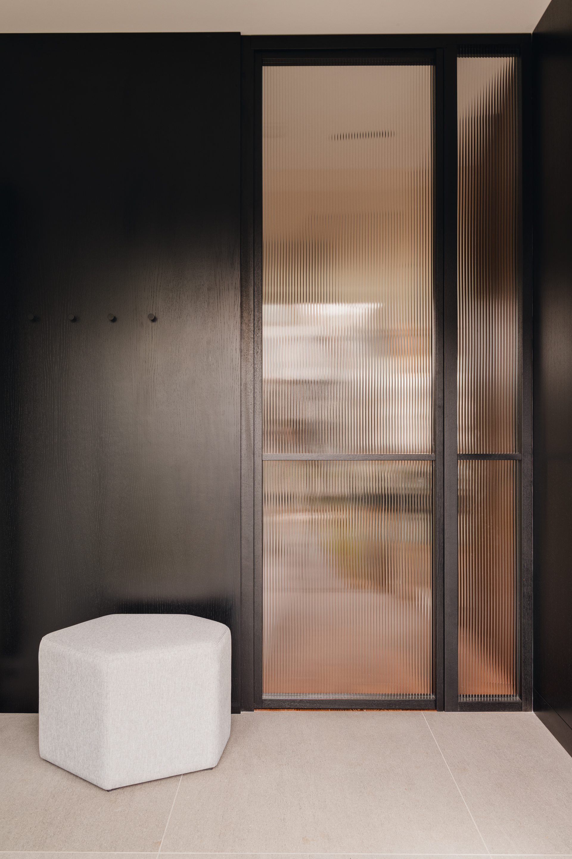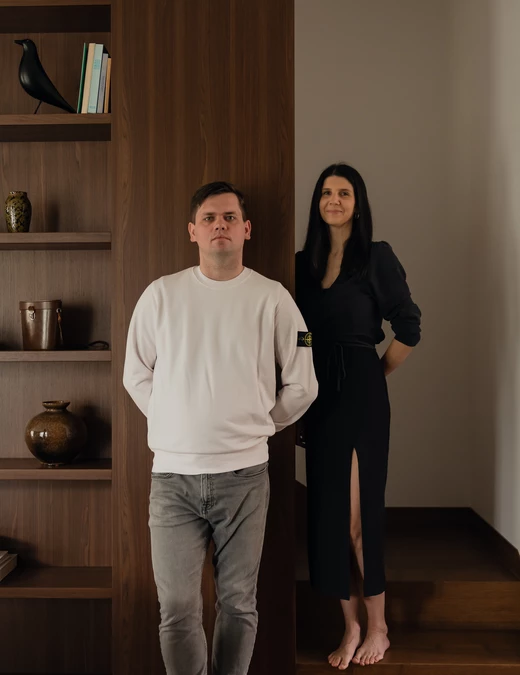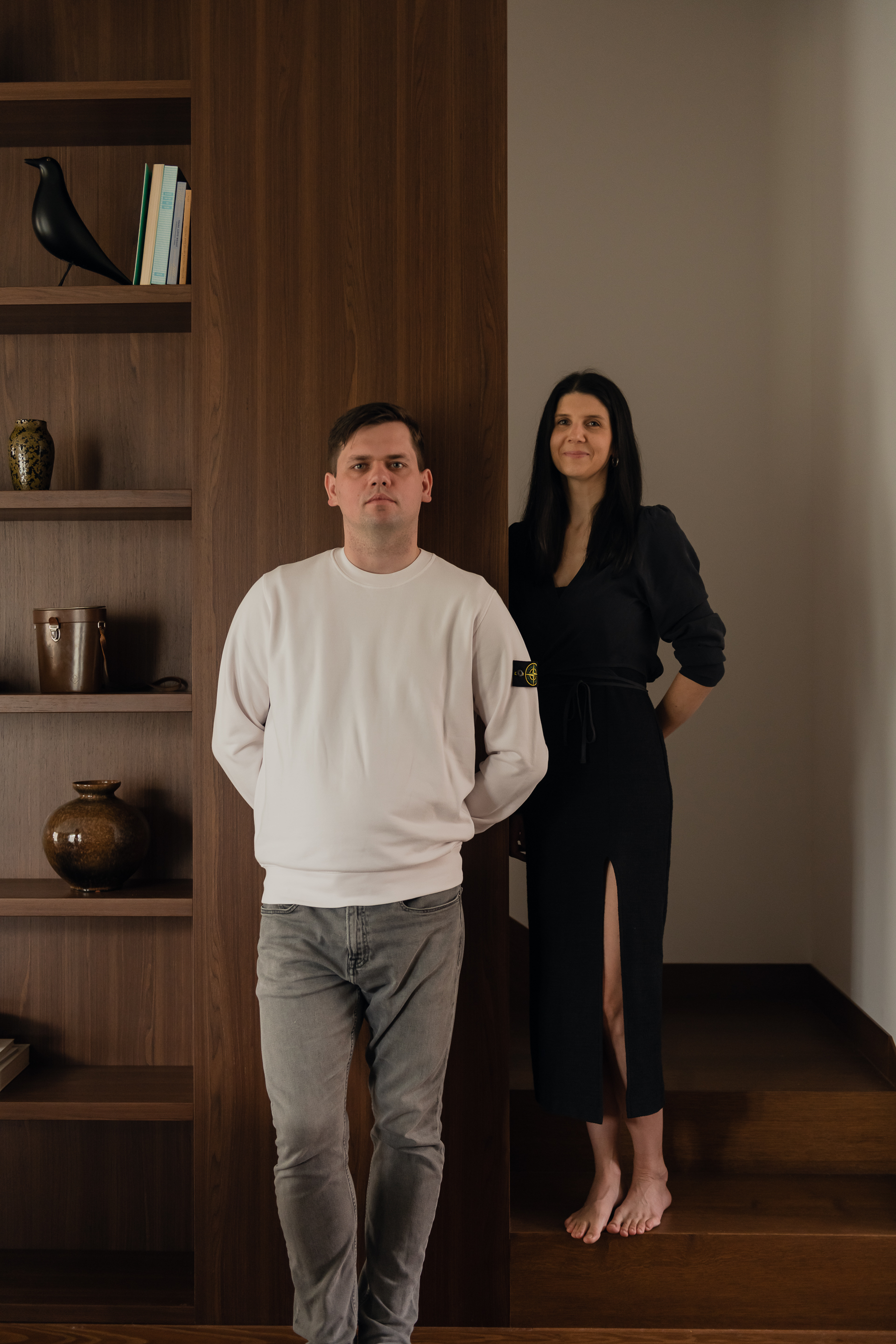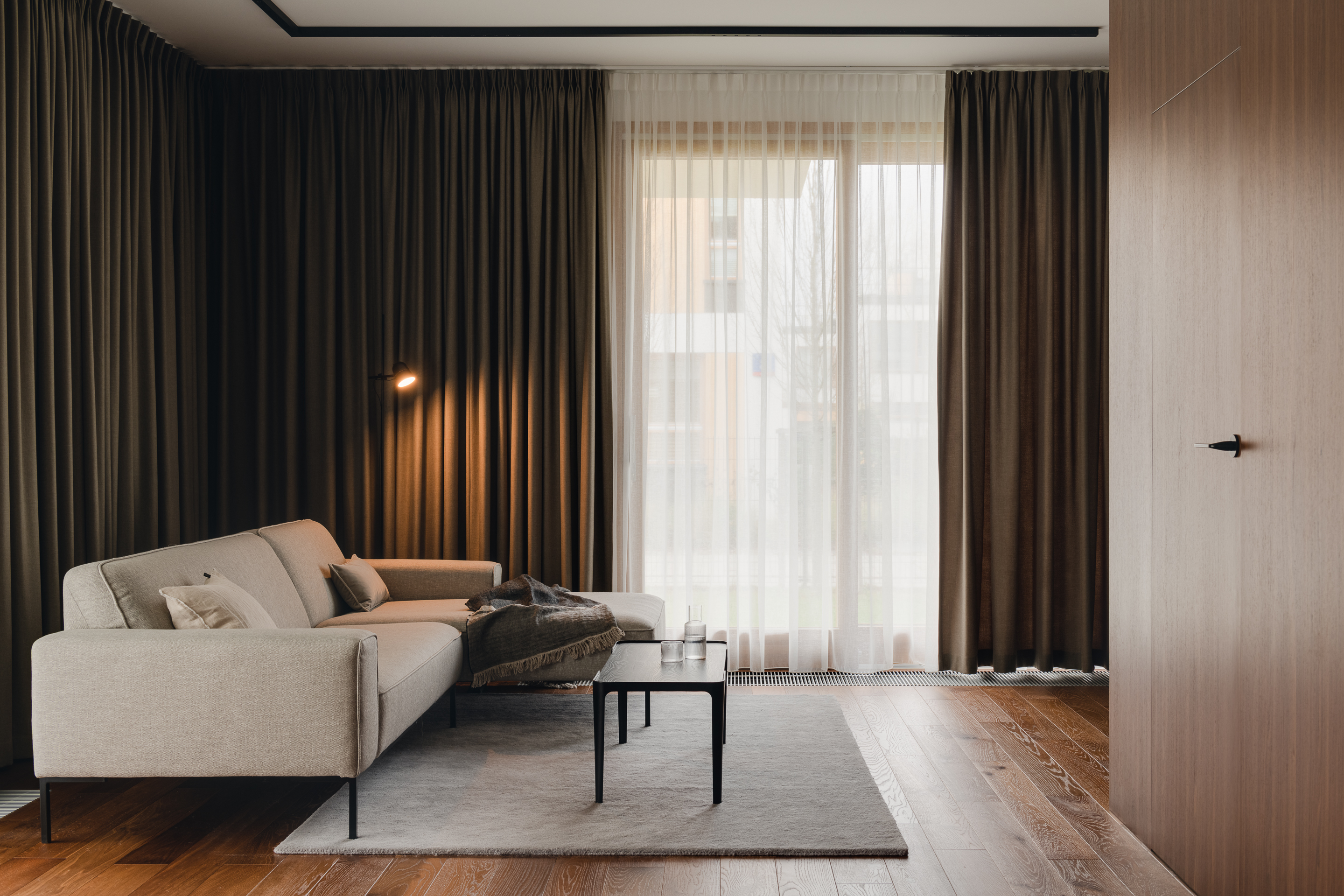 Właściciele od początku zaznaczyli, że nie chcą we wnętrzu wyrazistych ornamentów i dekoracyjnych motywów. Projektanci oparli więc kompozycję na jednolitych, spokojnych wzorach oraz starannie dobranych surowcach. Na podłogach zastosowali ciemne dębowe deski, które dzięki modyfikacji termicznej uzyskały głęboki, ciepły odcień. Naturalne forniry dębowe wybrali w kolorze czarnym oraz w tonacjach zbliżonych do koloru podłogi. Jako detale podkreślające charakter wnętrza wprowadzili kamień naturalny i elementy stalowe.