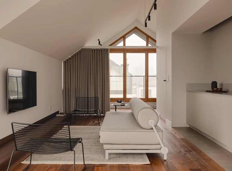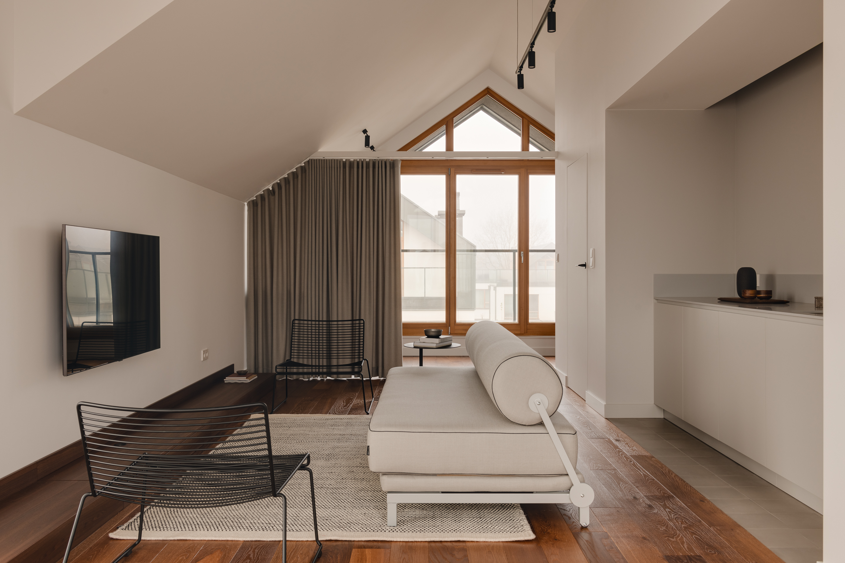 Poddasze pełni funkcję wspólnej strefy rekreacyjnej. Projektanci podzielili wcześniej otwartą przestrzeń na wyraźne części – duży salon z aneksem kuchennym, miejsce do pracy oddzielone zasłoną, dodatkowe WC oraz pomieszczenie gospodarcze. W tej kondygnacji powtórzyli materiały zastosowane w pozostałej części domu, co zapewnia spójność całego projektu. Wnętrze doświetlają z dwóch stron duże okna z wyjściem na tarasy, z których właściciele skorzystają w cieplejszych miesiącach.