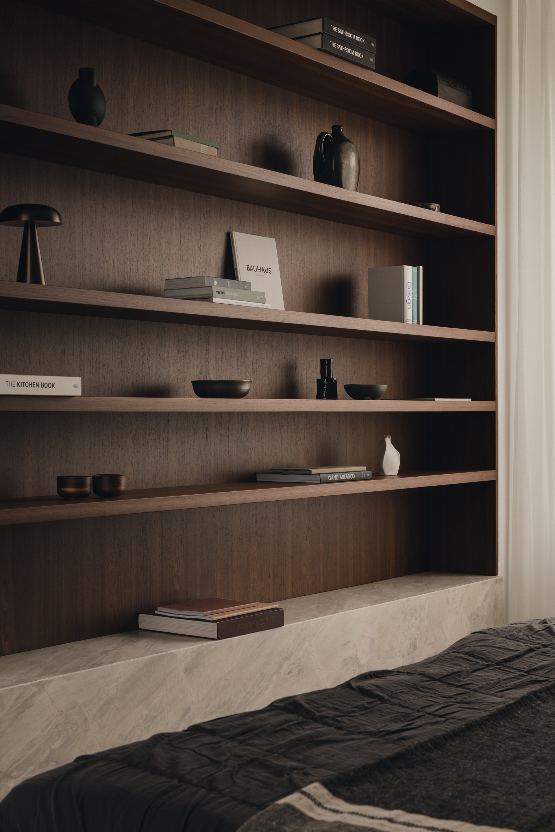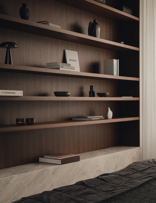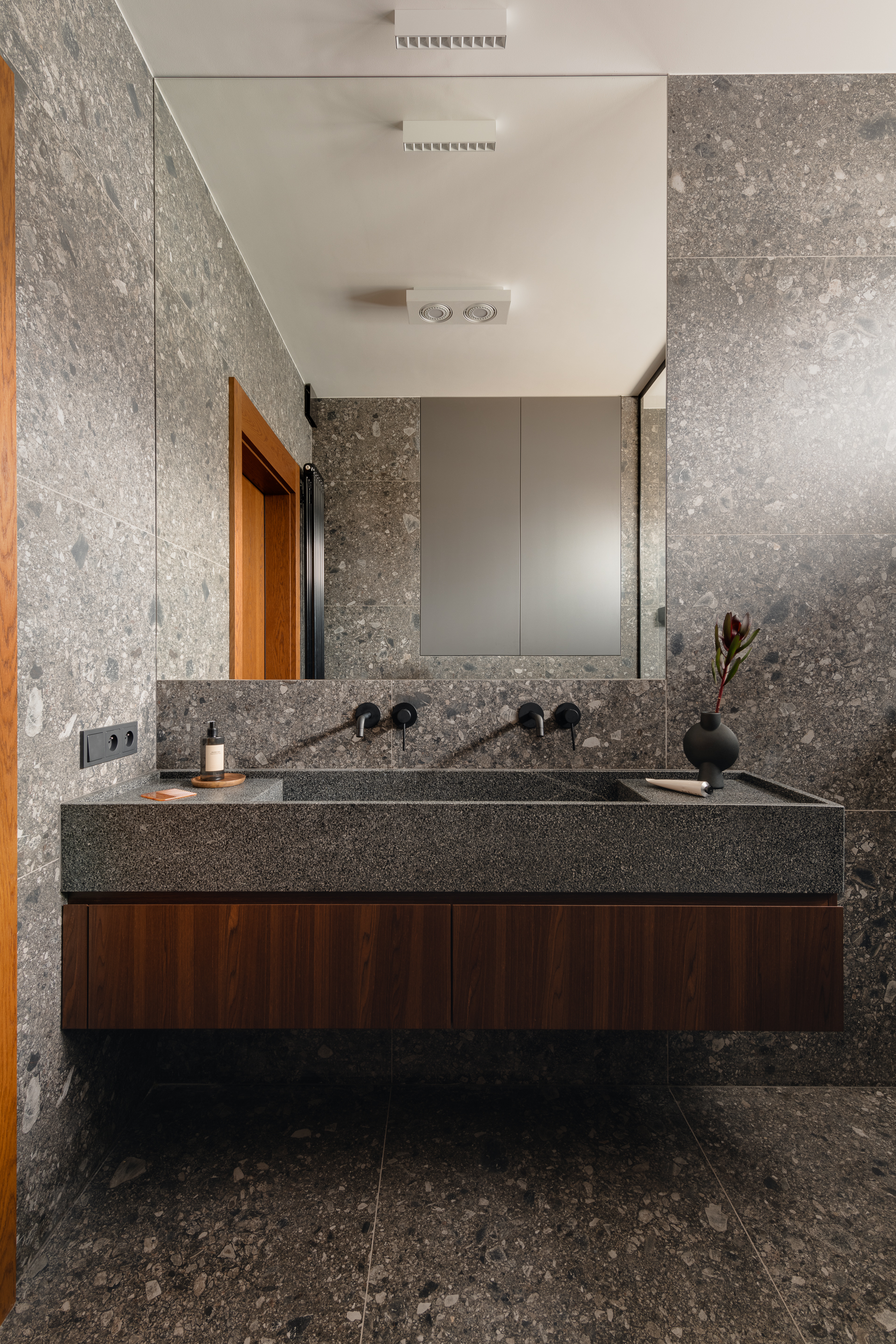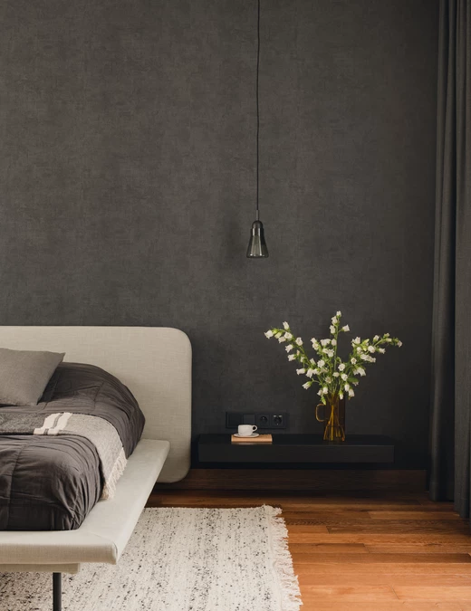 Otwarta kuchnia konsekwentnie powtarza materiały i formy zastosowane w części dziennej, co wzmacnia wrażenie jednorodności przestrzeni. W sypialni dominują z kolei ciemne barwy i zróżnicowane struktury. Architekci zestawili łóżko marki NAP, tapicerowane jasnoszarą tkaniną o delikatnym splocie, z ciemną tapetą. Stoliki nocne w formie masywnych półek oraz wiszące lampy z przydymionymi szklanymi kloszami wybrali z oferty czeskiej marki BROKIS. Regał naprzeciwko łóżka zaprojektowali z półkami o zróżnicowanej wysokości, a jego podstawę zaakcentowali jednolitym blokiem z naturalnego kwarcytu.