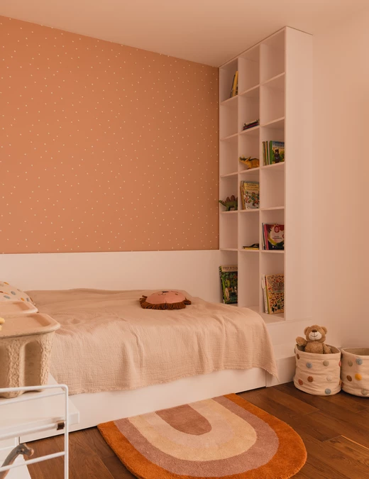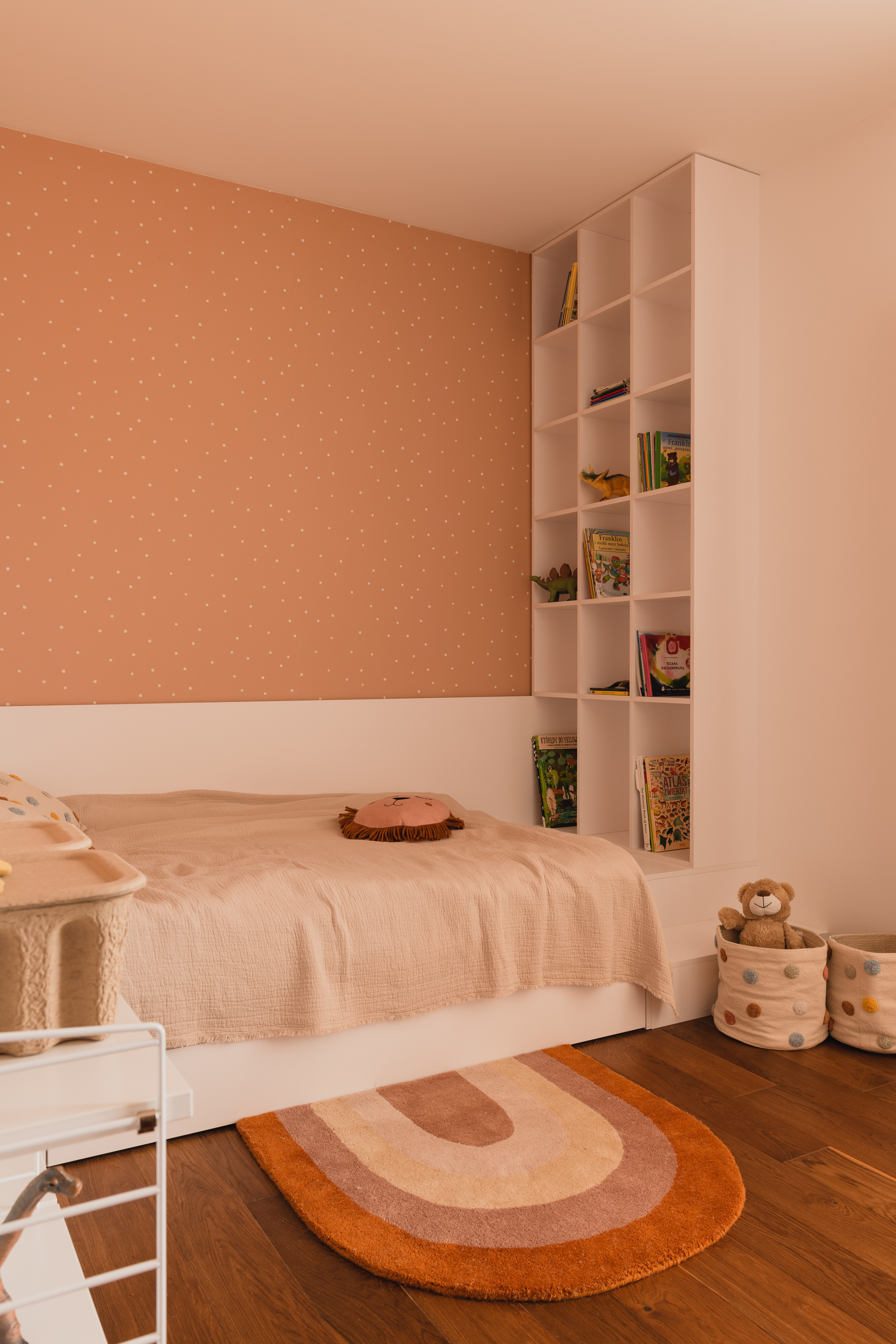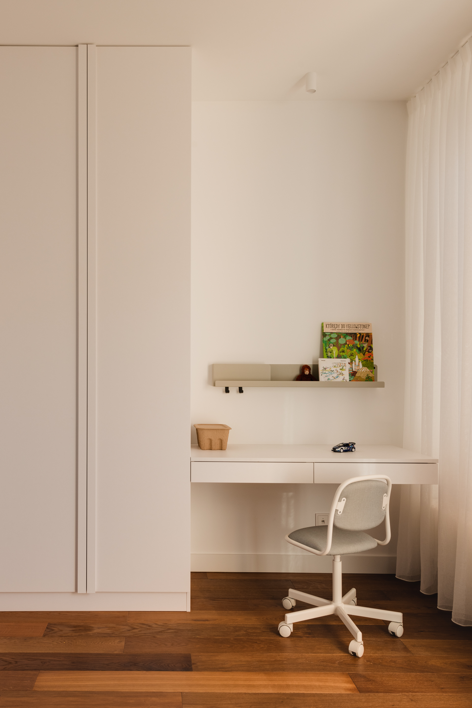 Pokoje dzieci na piętrze architekci opracowali z myślą o ich zmieniających się potrzebach. Zaproponowali podobne układy i zbliżone powierzchnie, różnicując je kompozycją kolorystyczną dopasowaną do najmłodszych domowników.