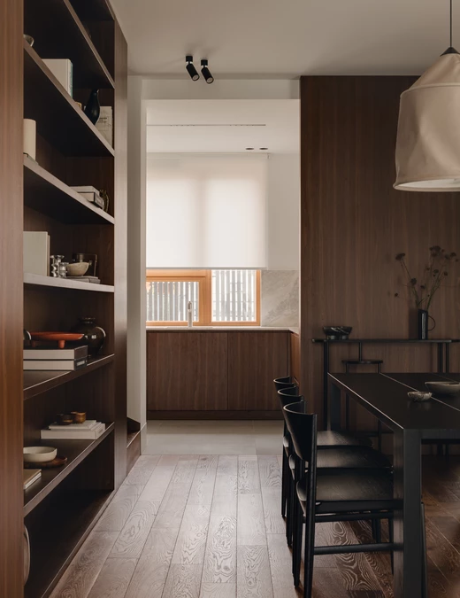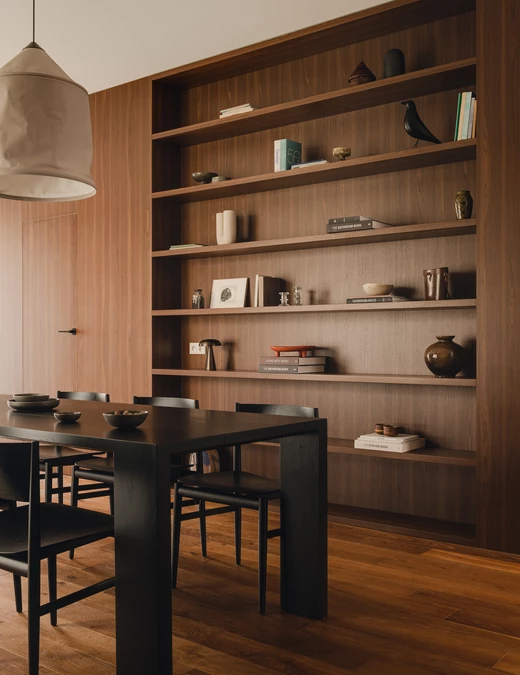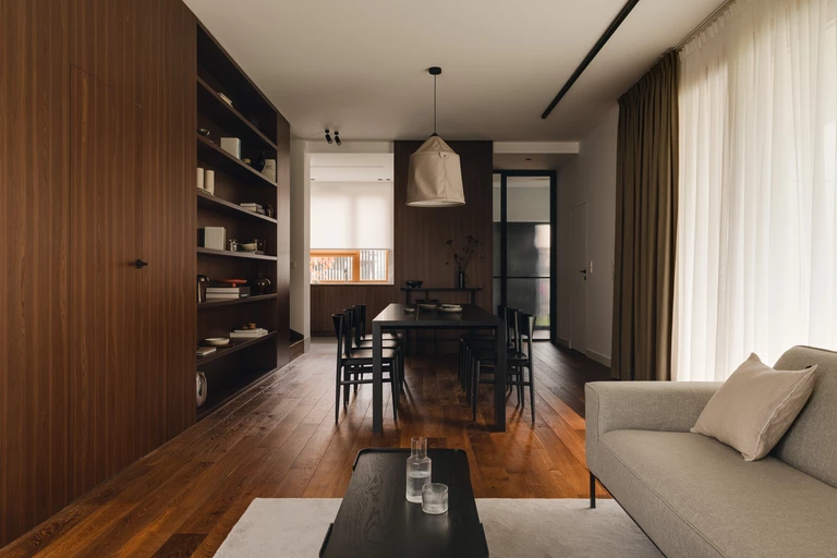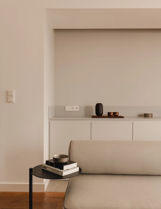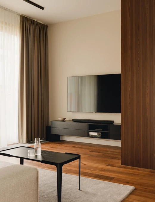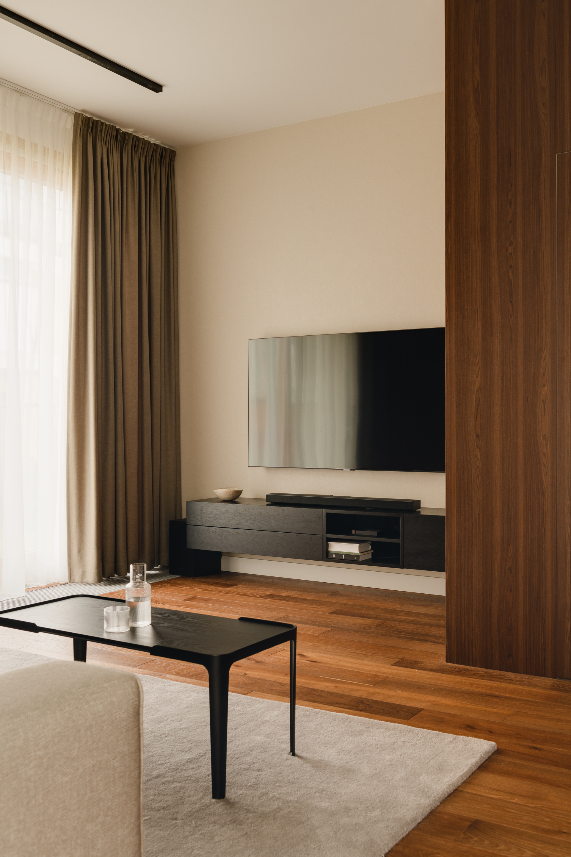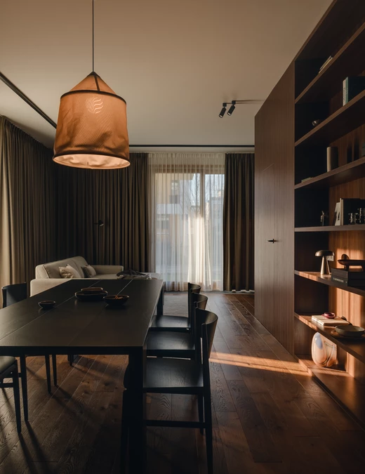 Strefa dzienna łączy salon z jadalnią. Centralnym punktem jest masywny drewniany stół marki LAWA, zestawiony z krzesłami włoskiej marki PORRO. Nad nim zawisła lampa projektu Joan’a Gaspar’a, której nazwa i wygląd nawiązuje do namiotów Beduinów z Afryki Północnej. Elastyczny materiał jej klosza rozprasza światło, wprowadzając miękką atmosferę. W dalszej części architekci zaplanowali strefę wypoczynkową z sofą marki SITS oraz zabudowę RTV ukrytą we wnęce.