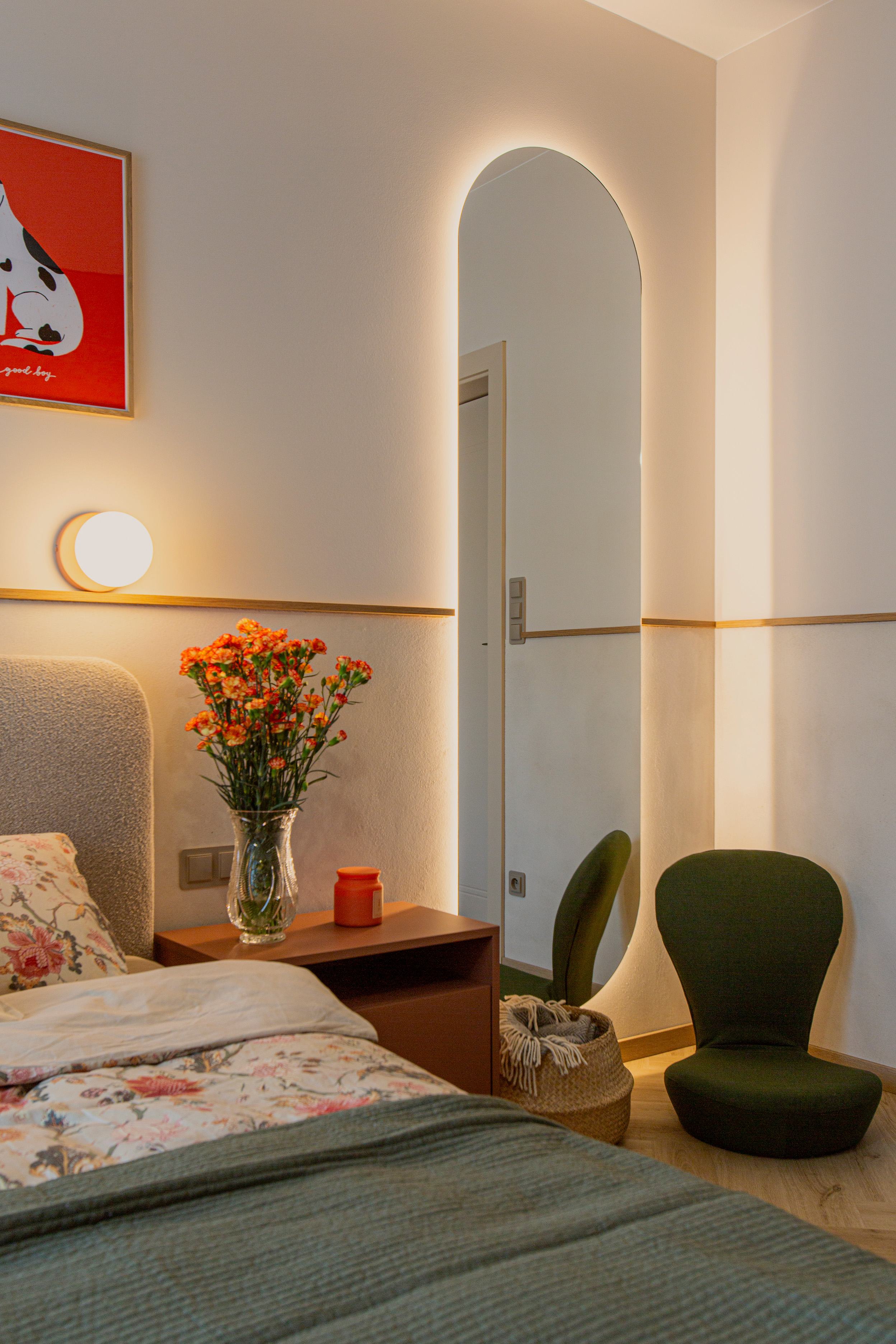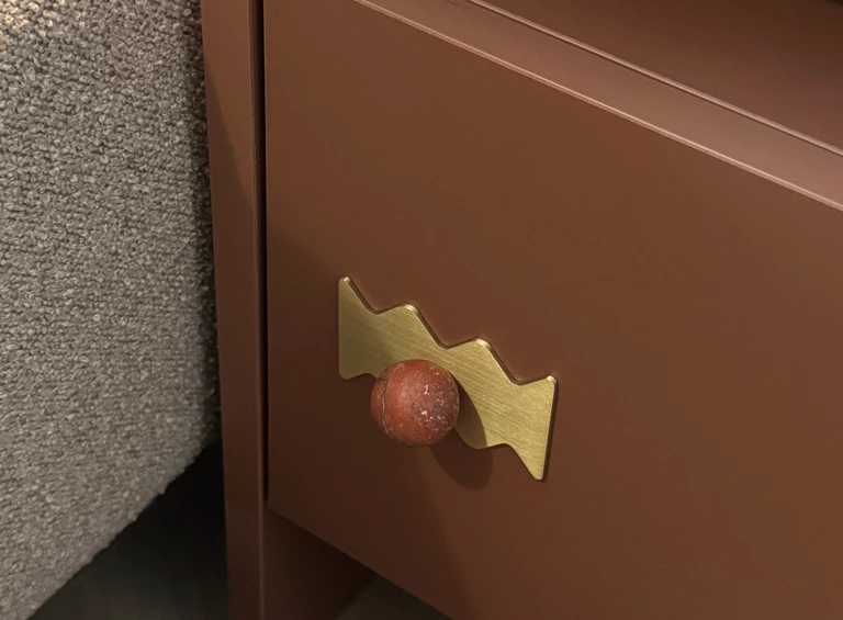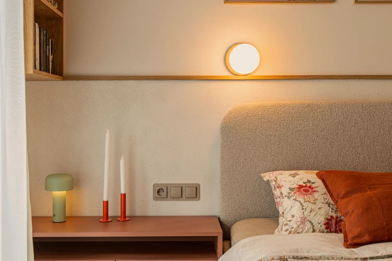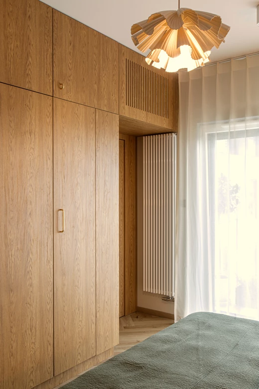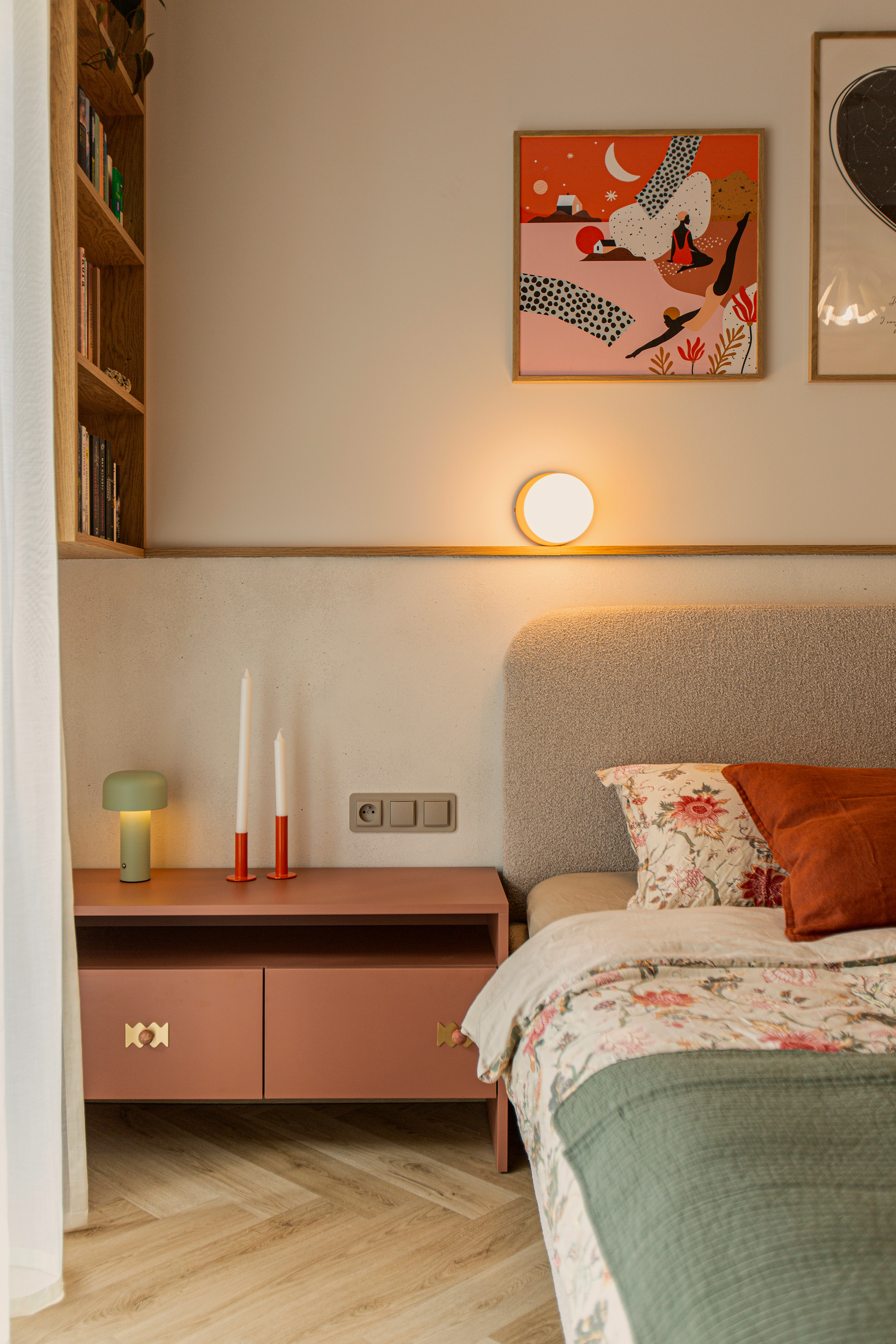 Ukryto w niej nie tylko jednostkę klimatyzacji, ale także – w całości wykonane z tego samego materiału co fronty – prywatne, ukryte przejście do garderoby. Kolorystyka bazuje na ciepłych beżach, tynku glinianym i drewnie, a powracający ceglasty akcent dodaje wnętrzu charakteru.