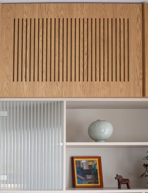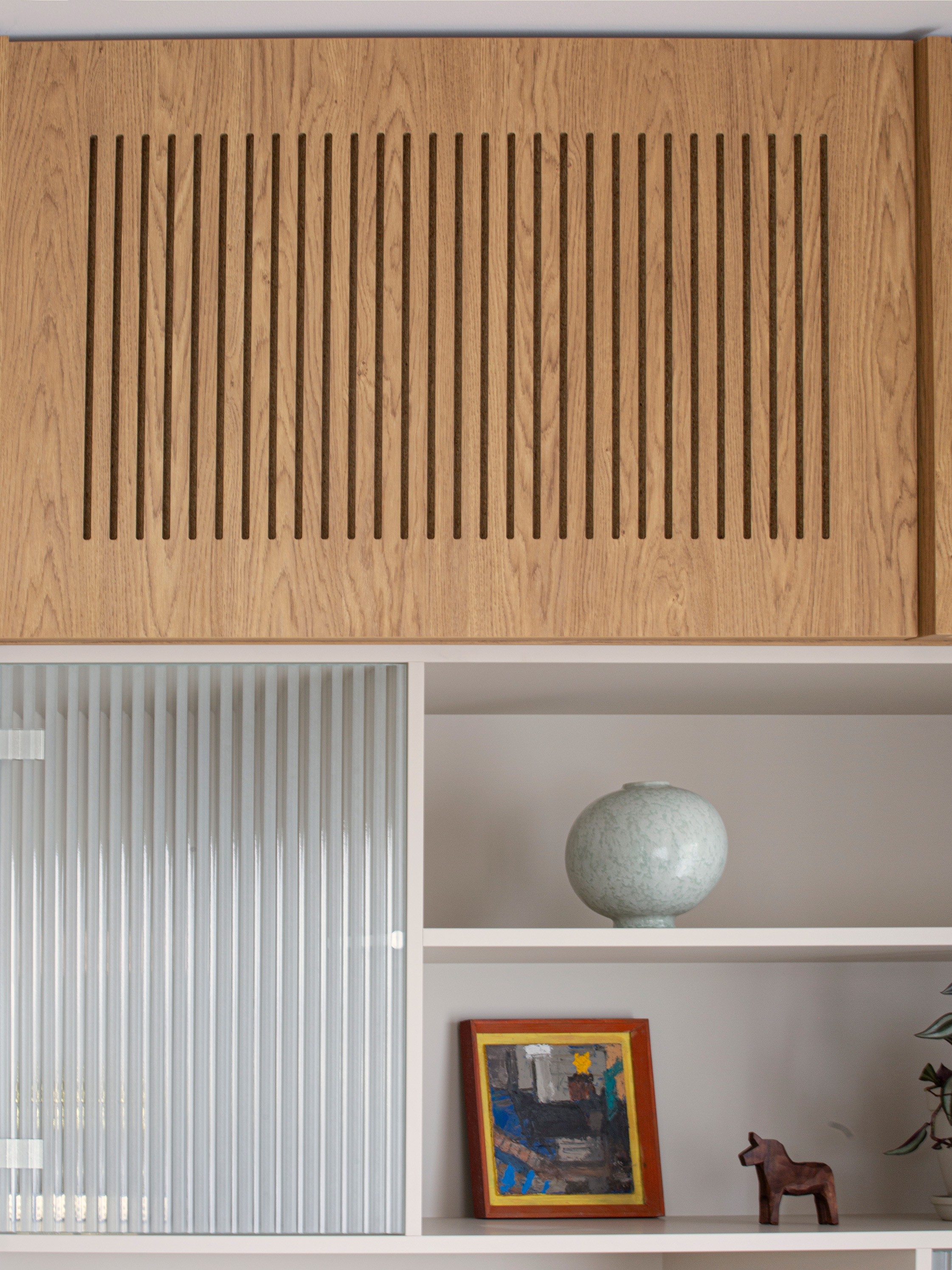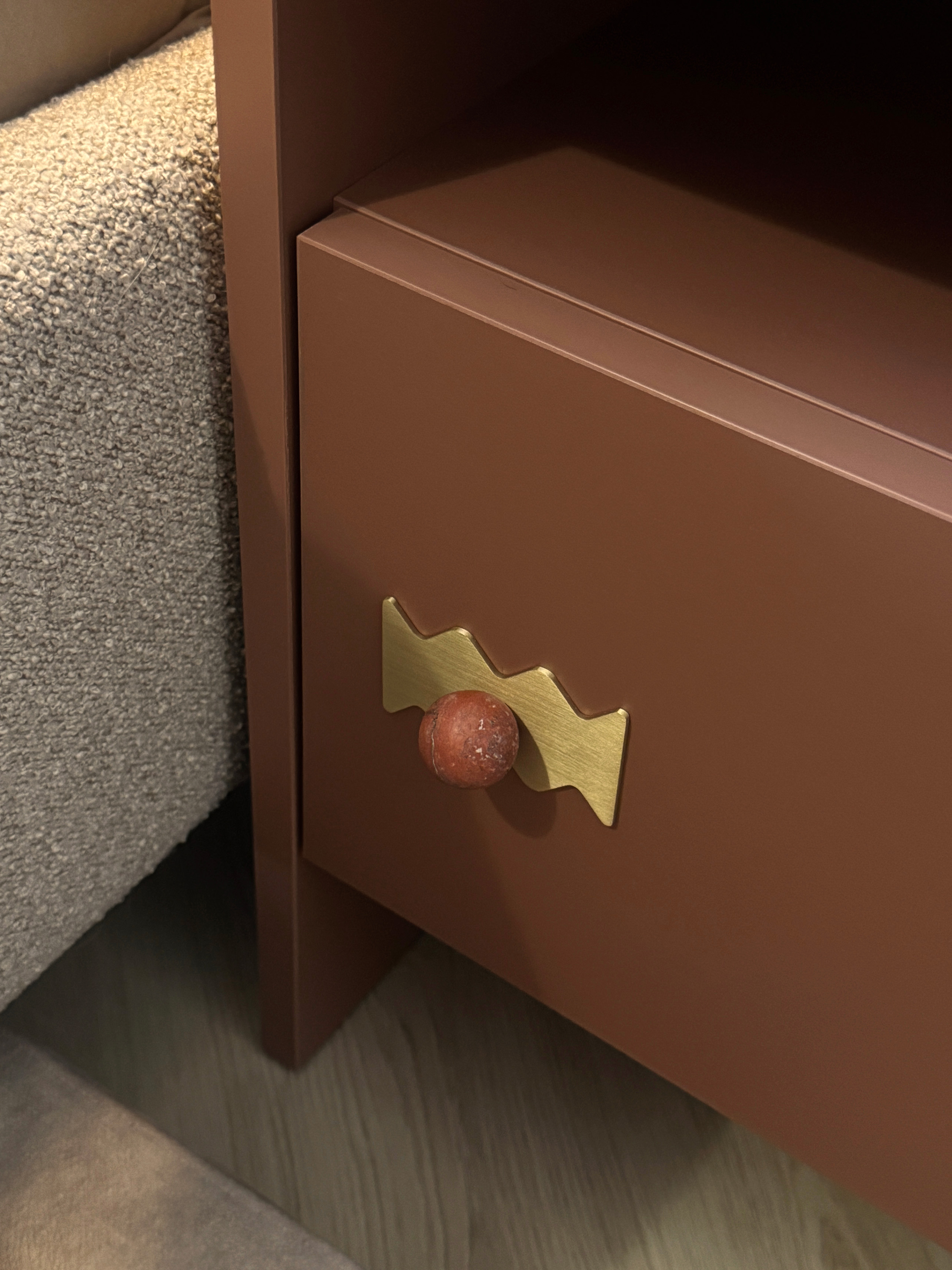 Ukryto w niej nie tylko jednostkę klimatyzacji, ale także – w całości wykonane z tego samego materiału co fronty – prywatne, ukryte przejście do garderoby. Kolorystyka bazuje na ciepłych beżach, tynku glinianym i drewnie, a powracający ceglasty akcent dodaje wnętrzu charakteru.