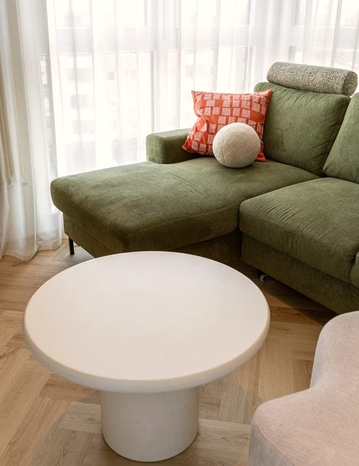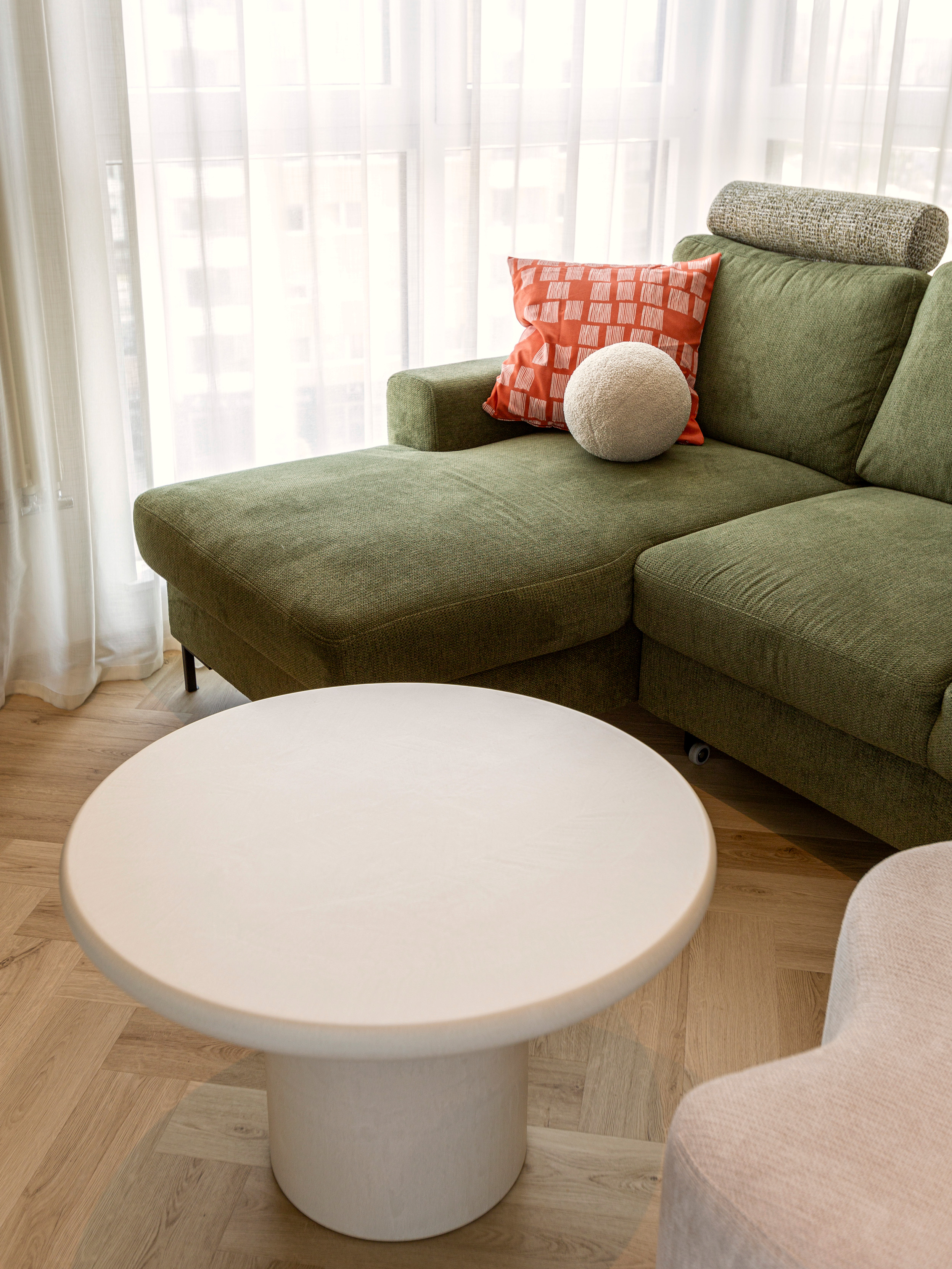 Z korytarza szerokie przejście, wizualnie wyznaczone przez dwie symetryczne zabudowy (kuchenną i komodę z ukrytą klimatyzacją), prowadzi do otwartej strefy dziennej. Jest ona wyjątkowo jasna i przestronna, dzięki dużym oknom wychodzącym na trzy strony świata. W palecie barw dominują beże i drewno, przełamane mocniejszym akcentem zieleni na sofie i szafkach kuchennych.