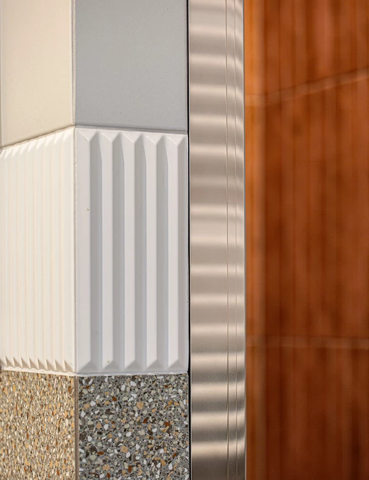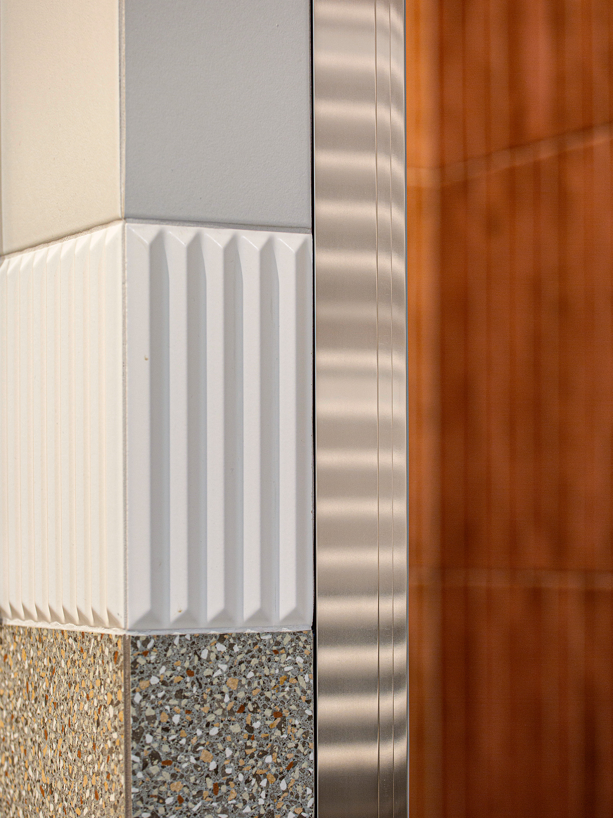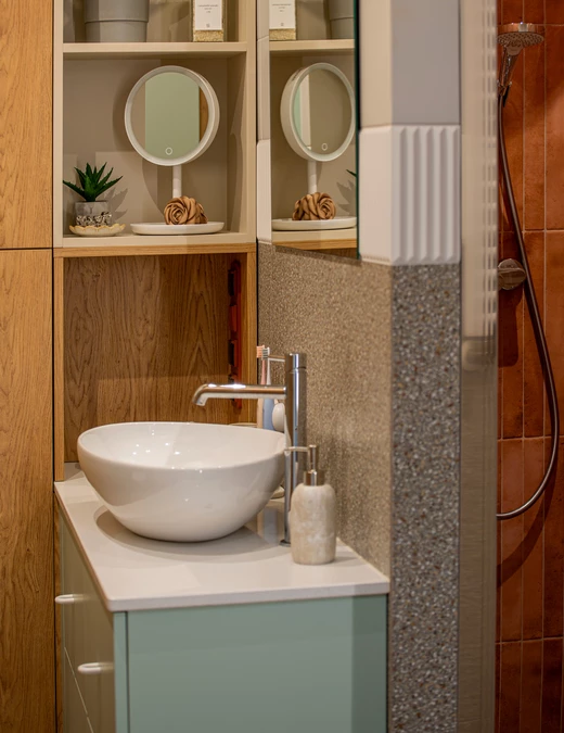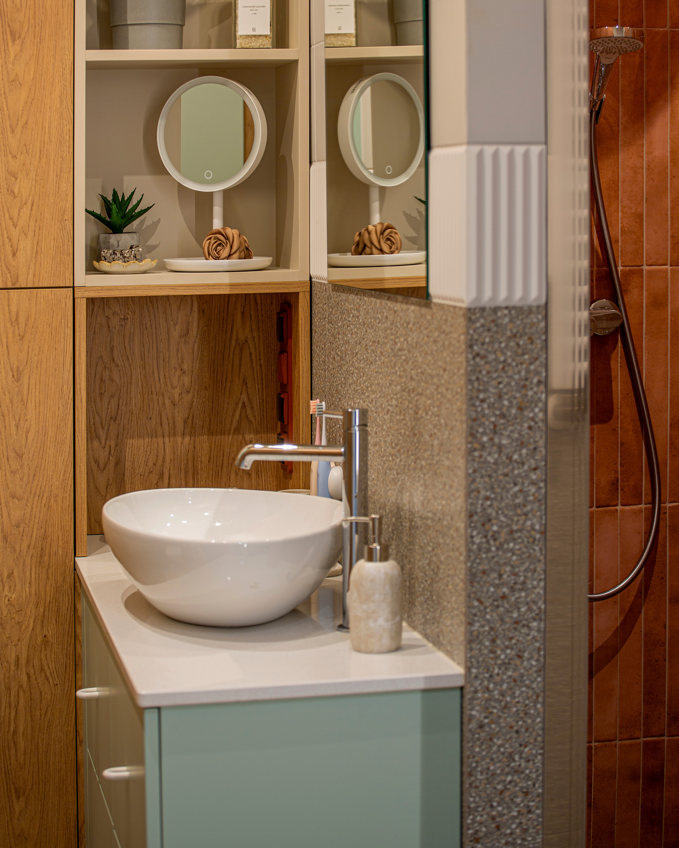 Całkowitą metamorfozę przeszła łazienka. Mimo zachowania oryginalnych wymiarów, jej układ przeprojektowano. Wstawiono nową ściankę działową, która wydzieliła komfortową strefę prysznica. Pozwoliło to na lepsze zagospodarowanie przestrzeni na przechowywanie: szafkę podumywalkową, zabudowę na pralkę i suszarkę oraz płytkie szafki na ścianie szczytowej. Stonowane beże i brązy przełamano ceglastą płytką w niszy prysznicowej oraz dwiema zielonymi zabudowami. Ściany zdobią trzy różne płytki ułożone pasmowo, z dekoracyjnym, ryflowanym pasem pośrodku.