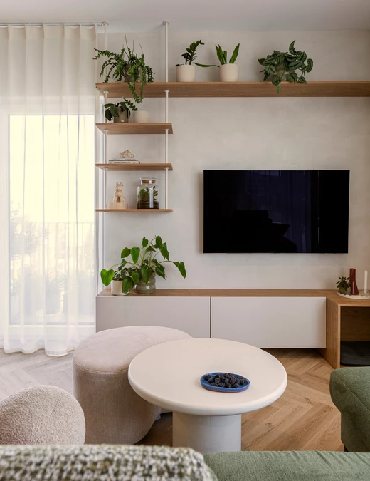 Naprzeciwko sofy znalazła się otwarta zabudowa RTV. Wydzielono w niej specjalną wnękę-schowek dla czworonożnego domownika. Ściana za telewizorem została ponownie pokryta tynkiem glinianym, co dodaje ciepła i zapewnia spójność materiałową ze strefą wejścia.