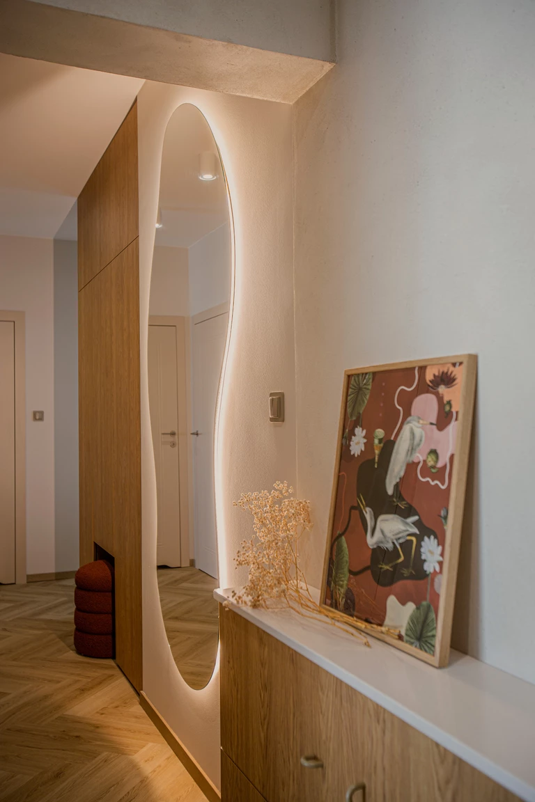 Kluczowa dla uzyskania efektu otwartej przestrzeni okazała się strefa wejściowa. Usunięto tu ściankę, która pierwotnie dzieliła korytarz na mniejsze części, pozostawiając jedynie konstrukcyjny podciąg. Stał się on symboliczną granicą dla naturalnego tynku glinianego. Ten beżowy, fakturowany materiał pokrył ściany, tworząc przytulny portal wejściowy. W korytarzu, prowadzącym do kolejnych pomieszczeń - sypialni, gabinetu i łazienki - znalazła się też spora zabudowa z wydzieloną wnęką na pufę oraz podświetlone lustro o miękkiej formie.