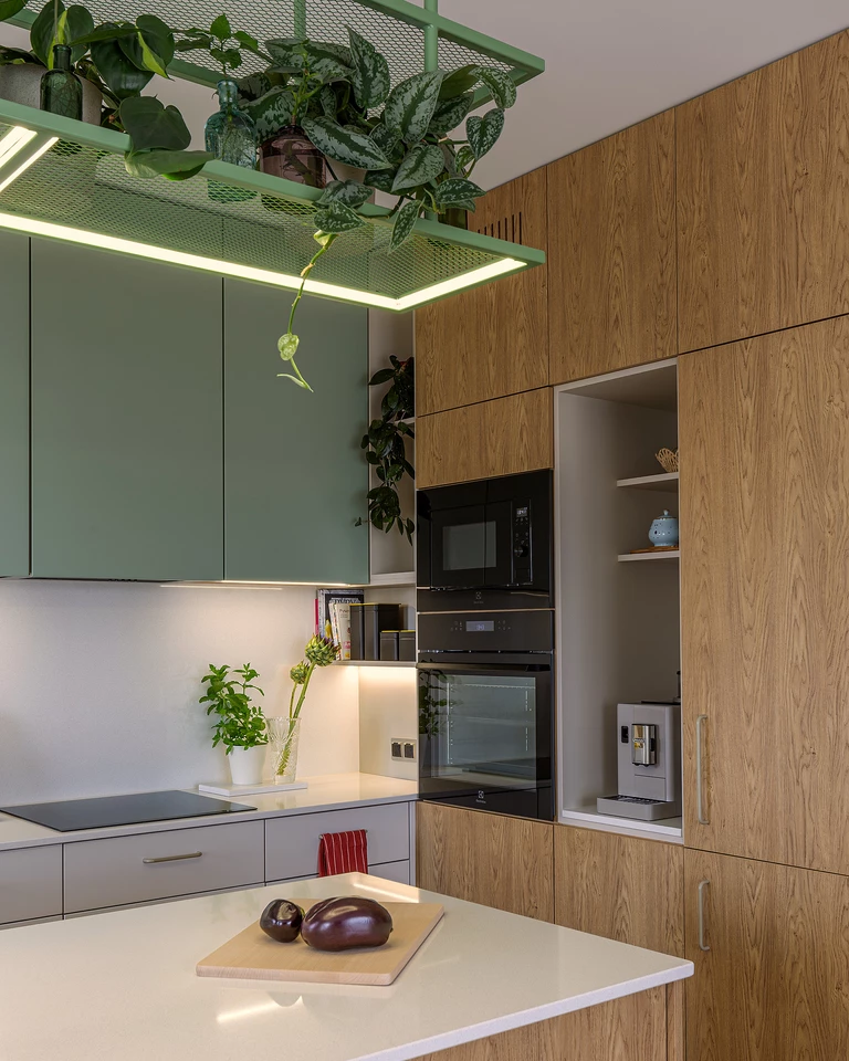 Kuchnia, choć umieszczona w otwartej wnęce, ma wyraźnie zdefiniowany charakter. Dzieli ją od salonu spora wyspa, nad którą zawisł sufitowy, metalowy regał. Ta zielona, ażurowa konstrukcja jest jednocześnie miejscem na rośliny, otwartym przechowywaniem i lampą doświetlającą blat roboczy. Stanowi domknięcie kompozycji i, jak mówi projektantka, jest „kropką nad i” w palecie barw. Pozostała zabudowa kuchenna stanowi dla niej proste, neutralne tło.