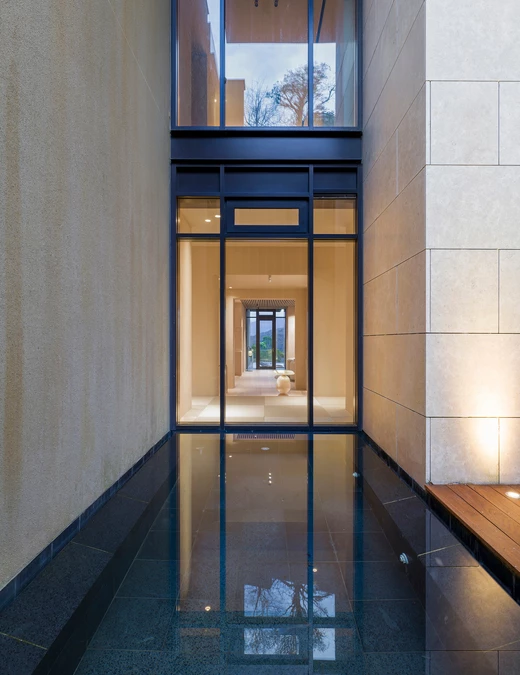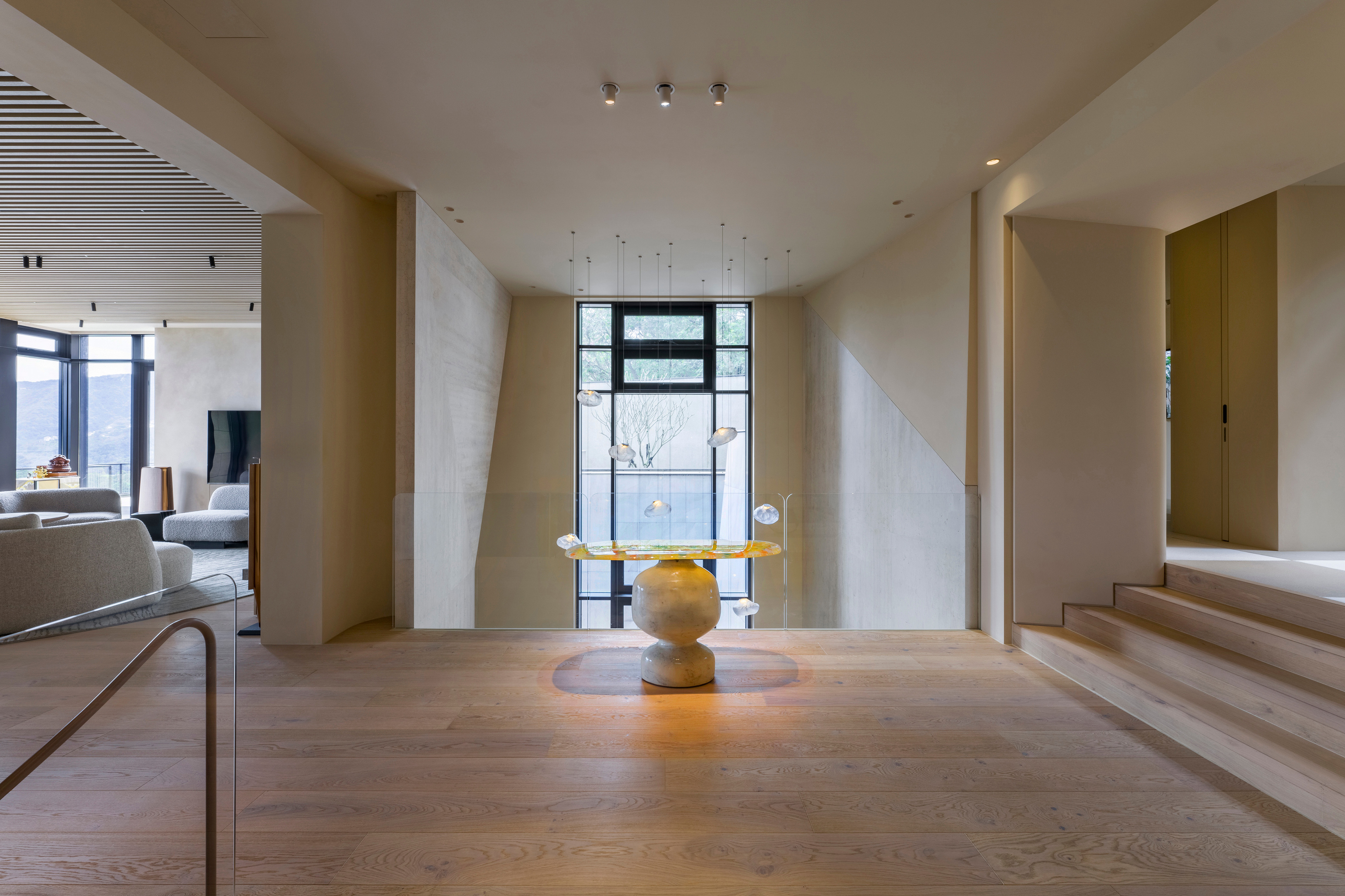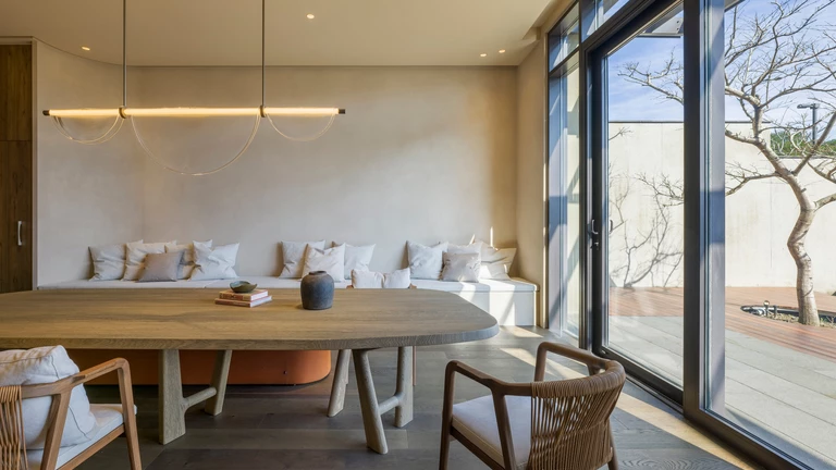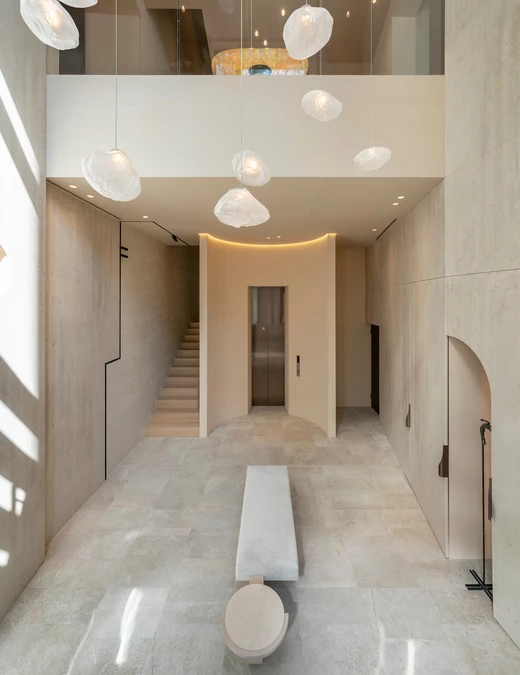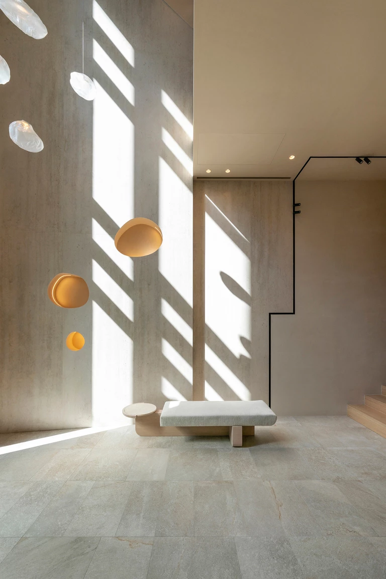 Kluczową rolę odgrywa tu również światło – naturalne, wpadające do środka przez architektoniczne przesłony, jest miękkie i rozproszone. Sztuczne oświetlenie, głównie pośrednie, subtelnie podkreśla przejścia między strefami i detale wykończenia, tworząc komfortowe i wyciszające środowisko.