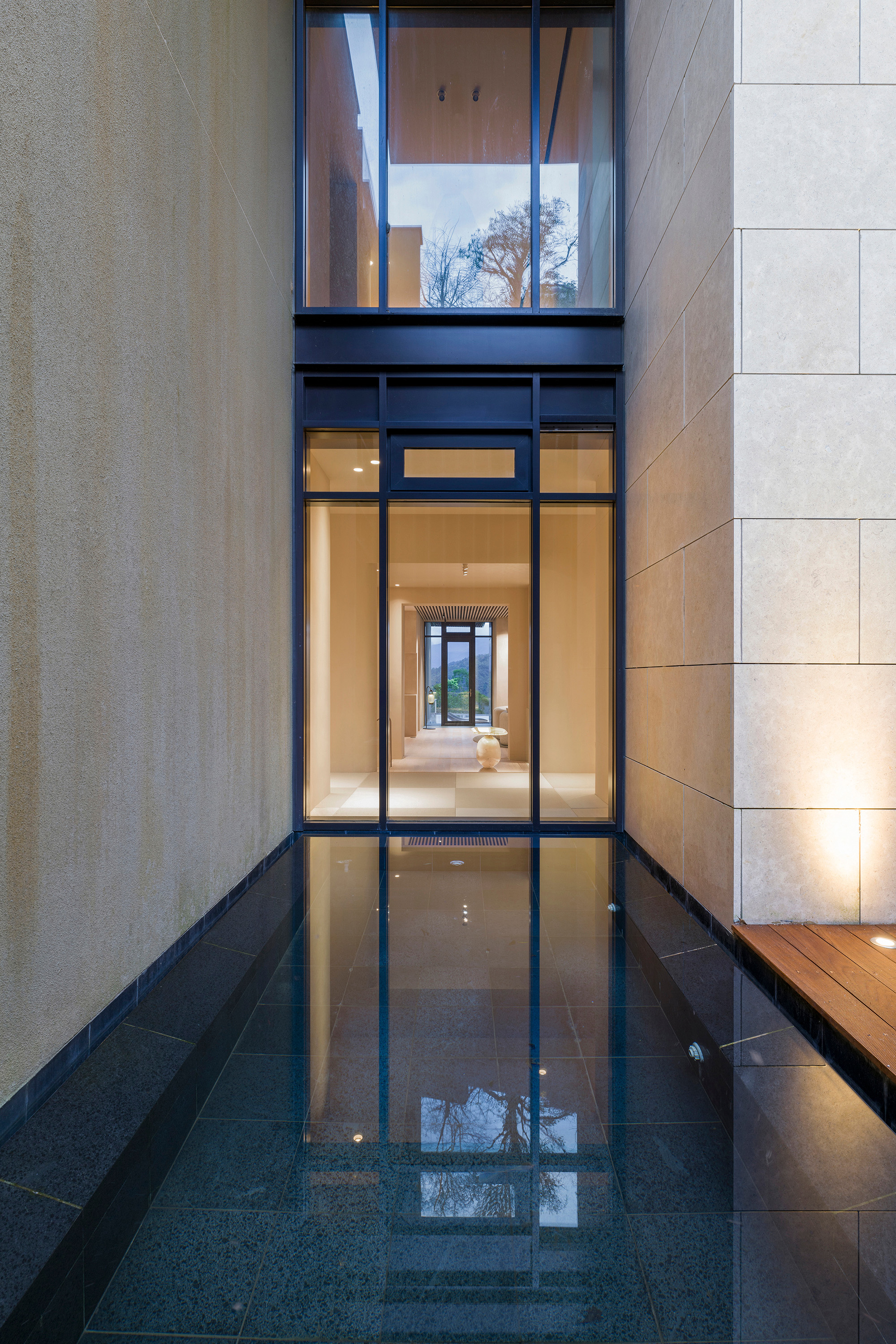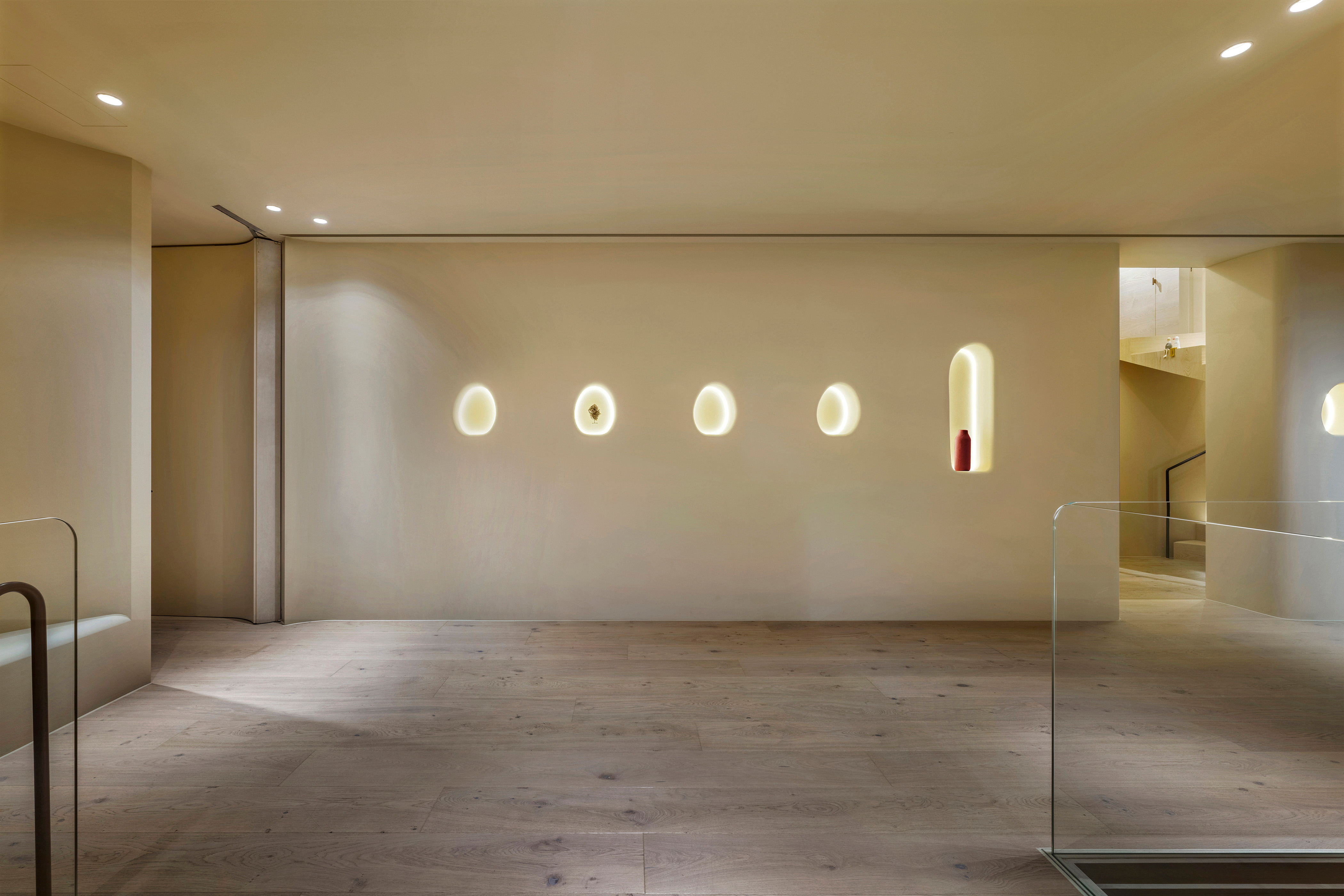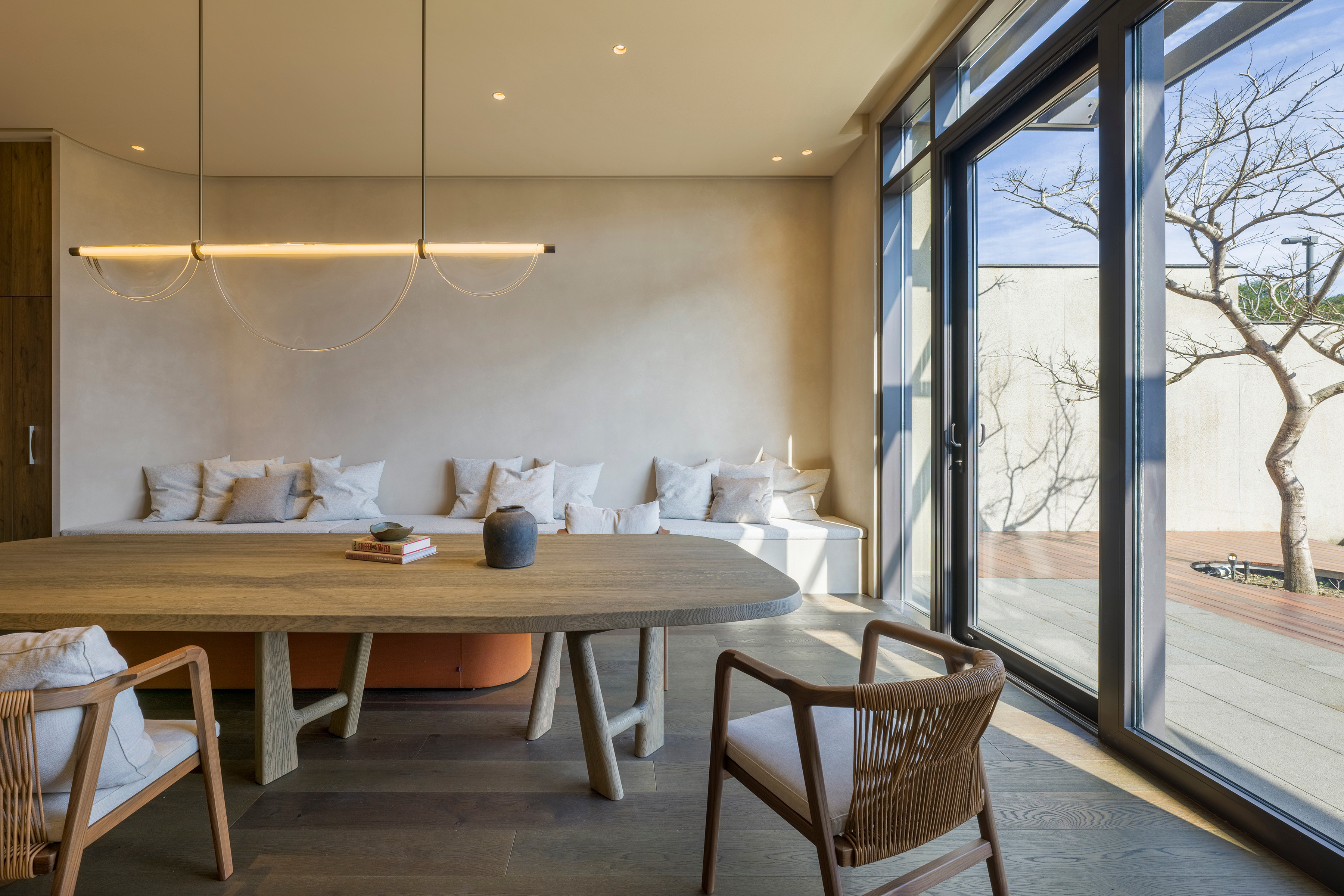 Kluczową rolę odgrywa tu również światło – naturalne, wpadające do środka przez architektoniczne przesłony, jest miękkie i rozproszone. Sztuczne oświetlenie, głównie pośrednie, subtelnie podkreśla przejścia między strefami i detale wykończenia, tworząc komfortowe i wyciszające środowisko.