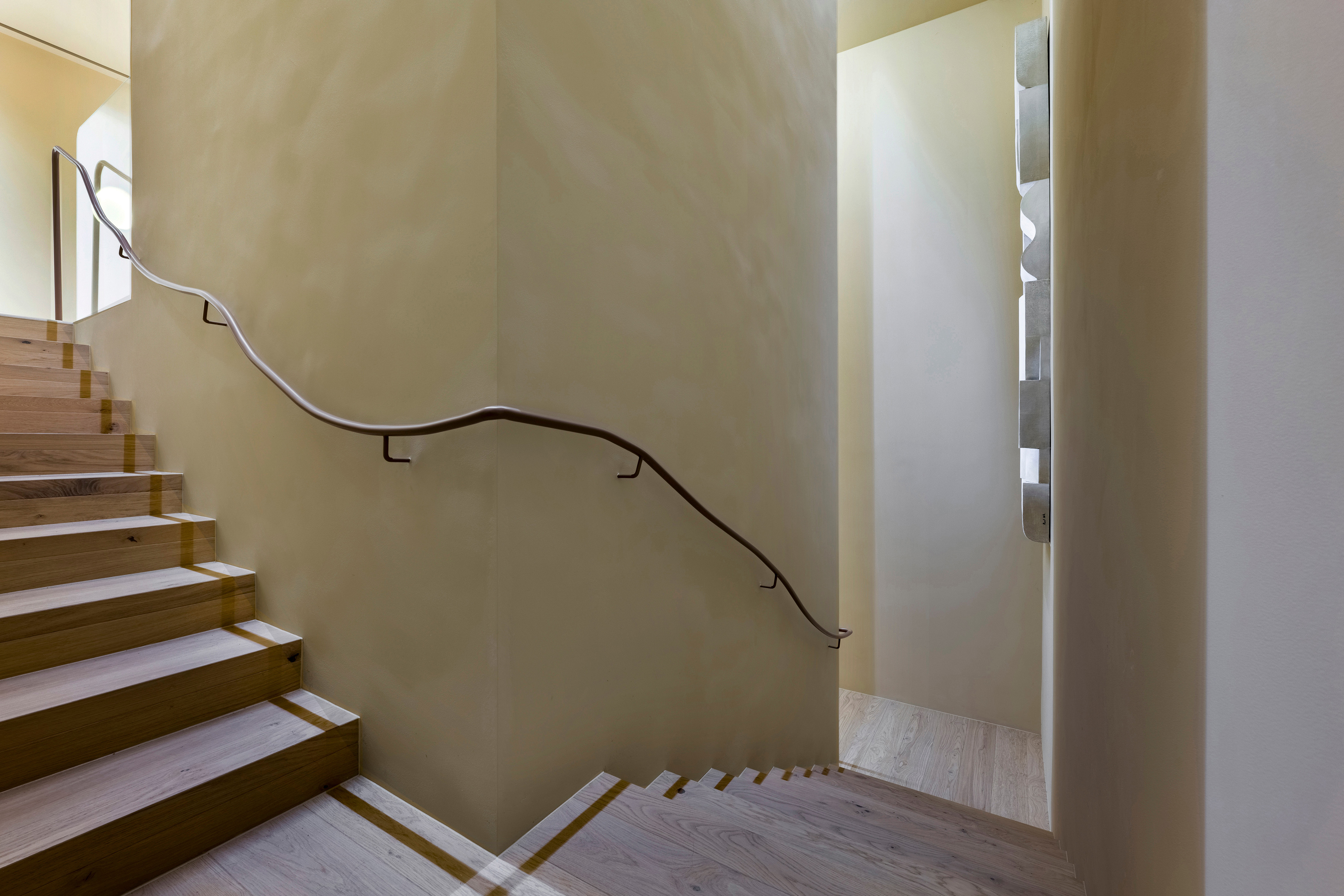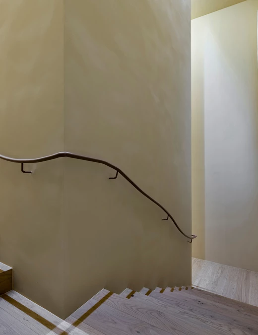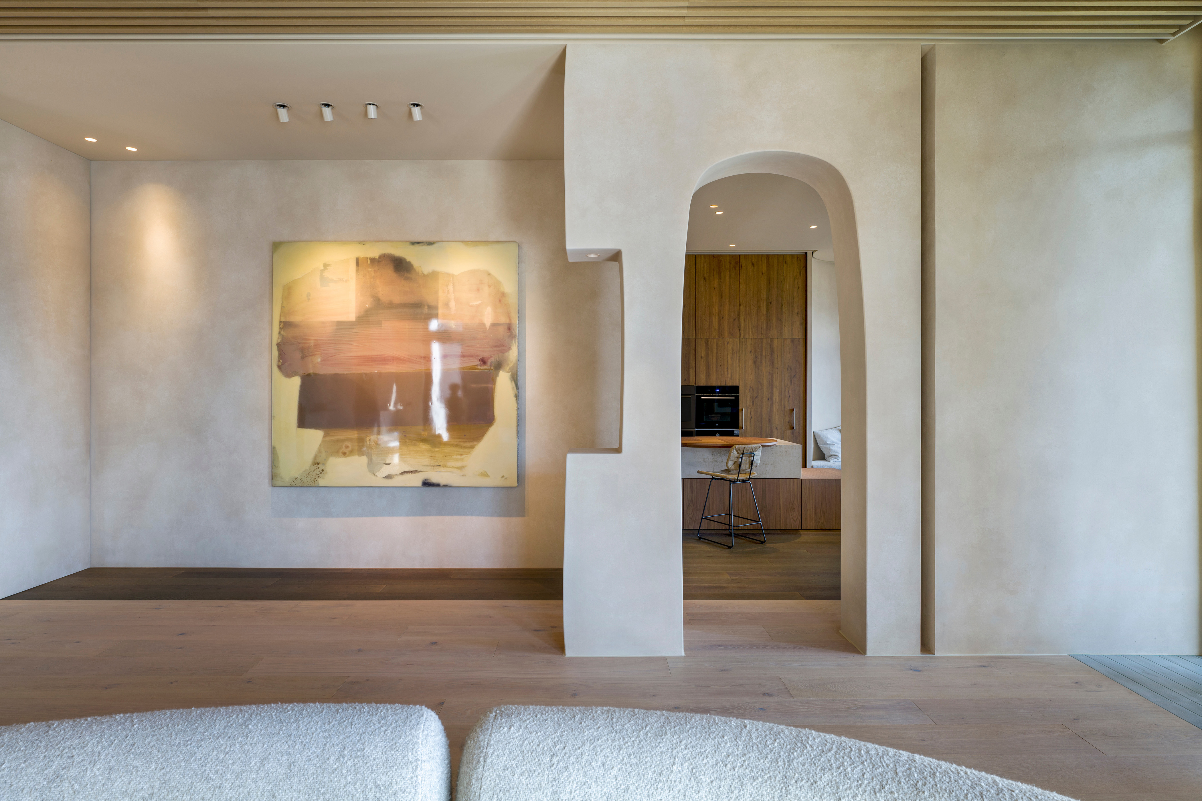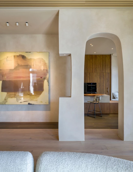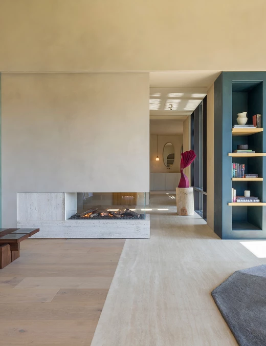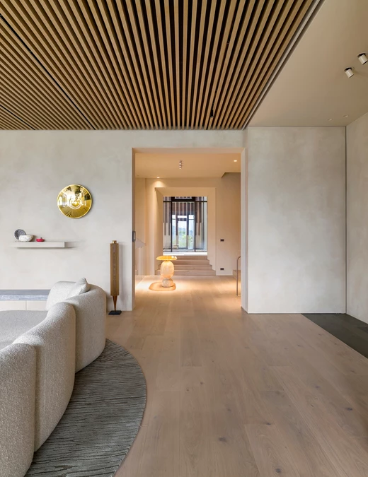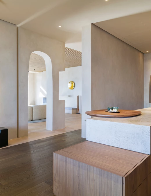 Język wizualny projektu został zdefiniowany przez organiczne, płynne linie. Wykonane na zamówienie, zakrzywione elementy pojawiają się konsekwentnie w całym domu - w formach mebli, liniach ścianek działowych i przejściach między sufitami. Tworzą one wrażenie nieprzerwanego, ciągłego przepływu, a ich rytm jest bezpośrednim echem dynamiki krajobrazu, co nadaje całej rezydencji wizualną spójność.