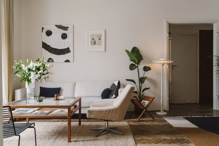 Najbliższy ich estetyce jest styl mid-century modern. W ich mieszkaniu znajdują się perełki upolowane np. na Patyna.pl czy Yestersen.pl – miejscach stworzonych z miłości do pięknych przedmiotów vintage i fascynacji ich historiami. Oboje lubią także pchle targi, gdzie nieraz udaje się znaleźć niebanalny dizajn po przejściach. Cenią minimalizm i ponadczasowość marek Hay, Frama, czy Ferm Living (dywan „Kelim” tej firmy stanowi piękny element salonu).