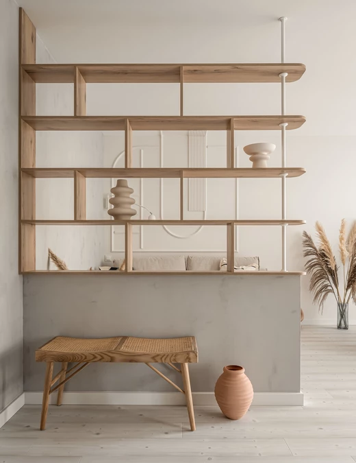 Salon podzielony został na trzy strefy: kuchenną, wypoczynkową i jadalnianą. Wszystkie te części tworzą razem harmonijną, spójną całość. Od korytarza oddzielono je ażurowymi półkami, które zostały zaprojektowane specjalnie dla tego wnętrza. Nie tylko estetycznie wyodrębniają przestrzeń, ale też tworzą ciekawą grę światłocienia.