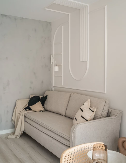 We wszystkich pomieszczeniach pojawia się motyw łuków. Na przykład w sypialni znalazł się na suficie w formie kolejnych sztukaterii. W łazience natomiast wzór łuku widoczny jest na zabudowie szafki umywalkowej.
