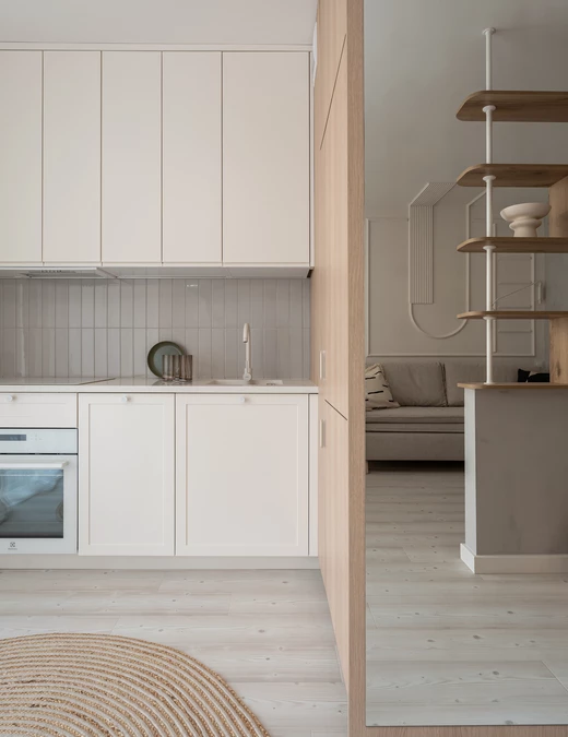 „Minimalistyczne wnętrze też może być eklektyczne z punktu widzenia łączenia materiałów i faktur. Ciekawym zabiegiem okazało się zastosowanie sztukaterii we współczesnym ujęciu, gdzie graficzność łuków i łączeń tworzy interesujący rysunek, nienachalną formę sztuki, która zdobi ściany” – opisują projekt architekci.