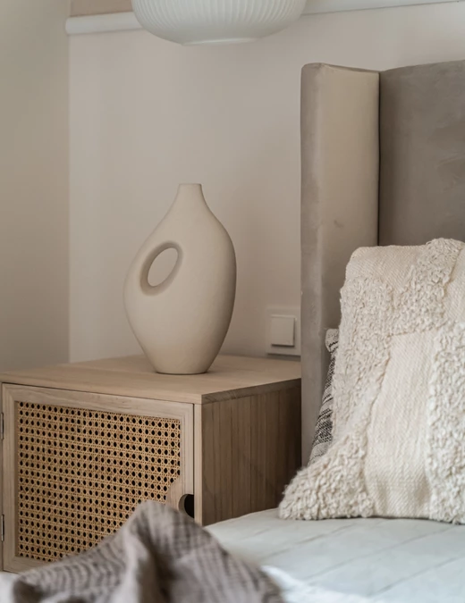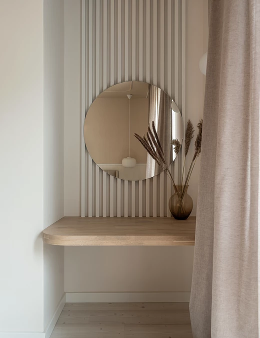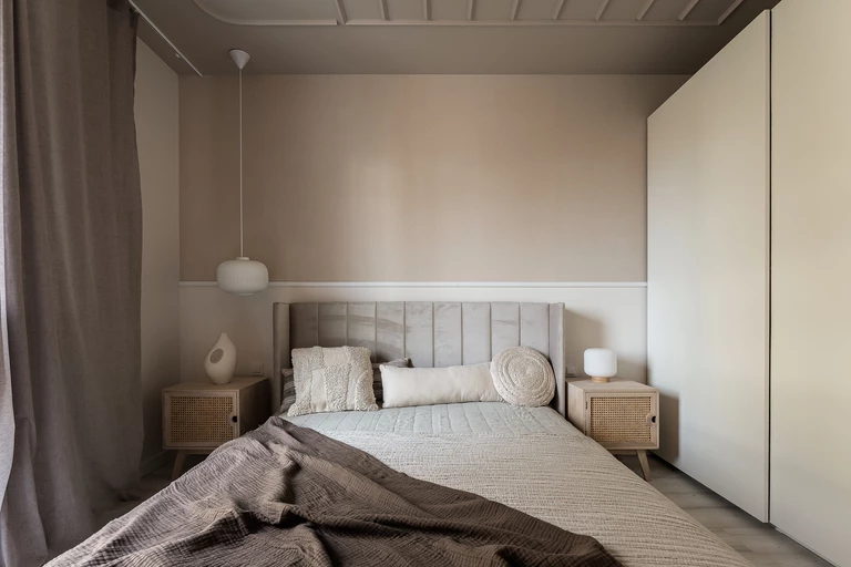 Prostota i surowość formy przenika się tu z miękkością barw i tkanin. Powstała przestrzeń sprzyjająca wyciszeniu i odpoczynkowi, w której chce się przebywać.